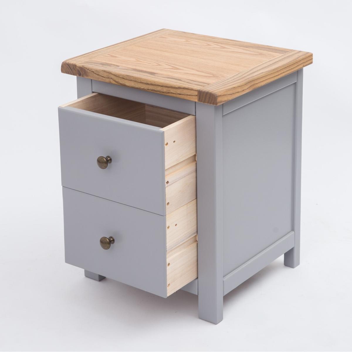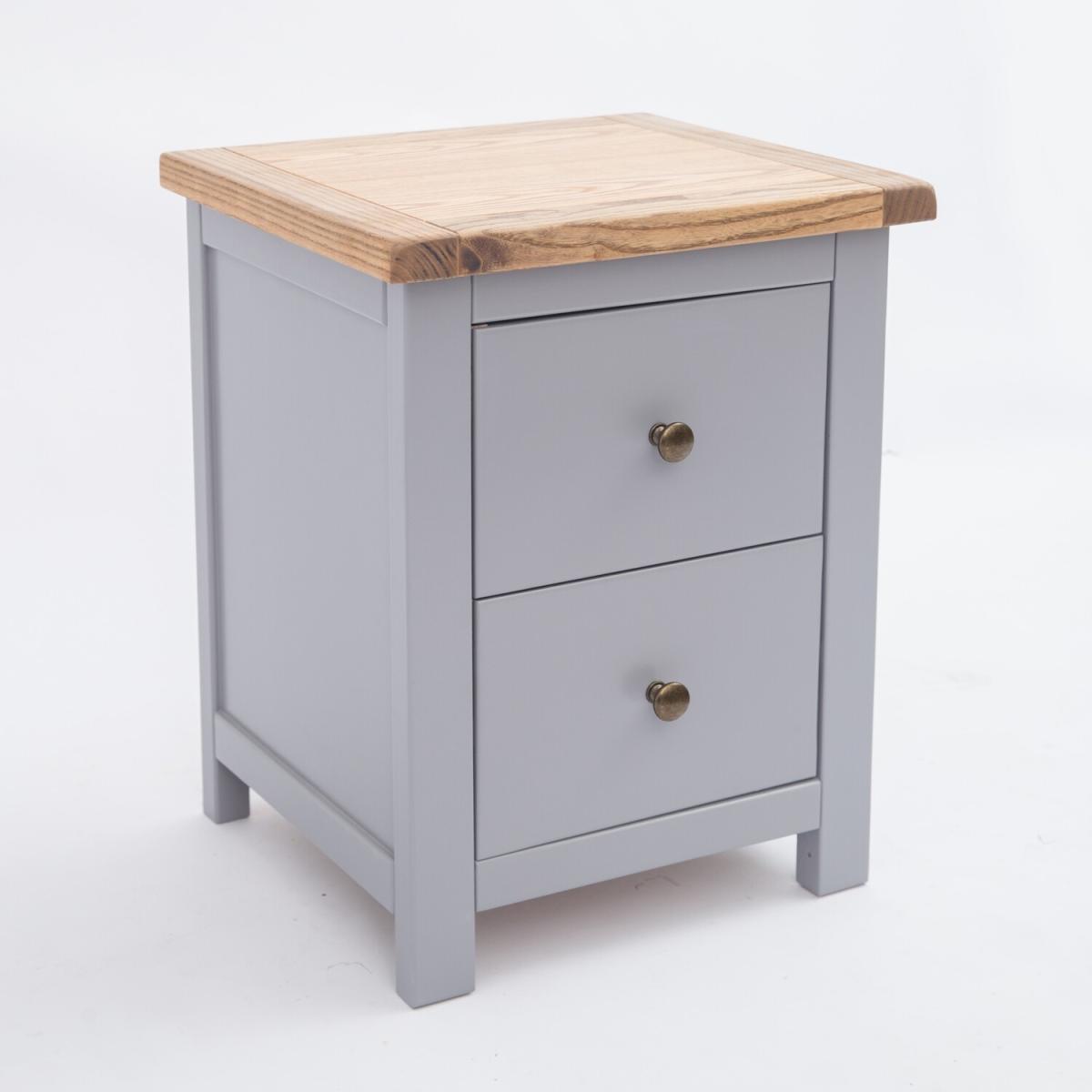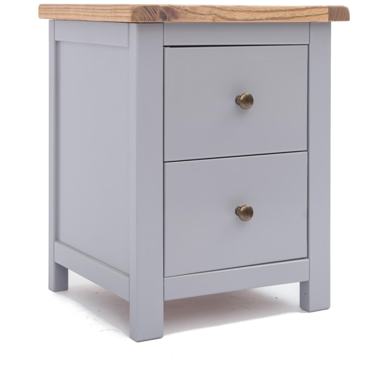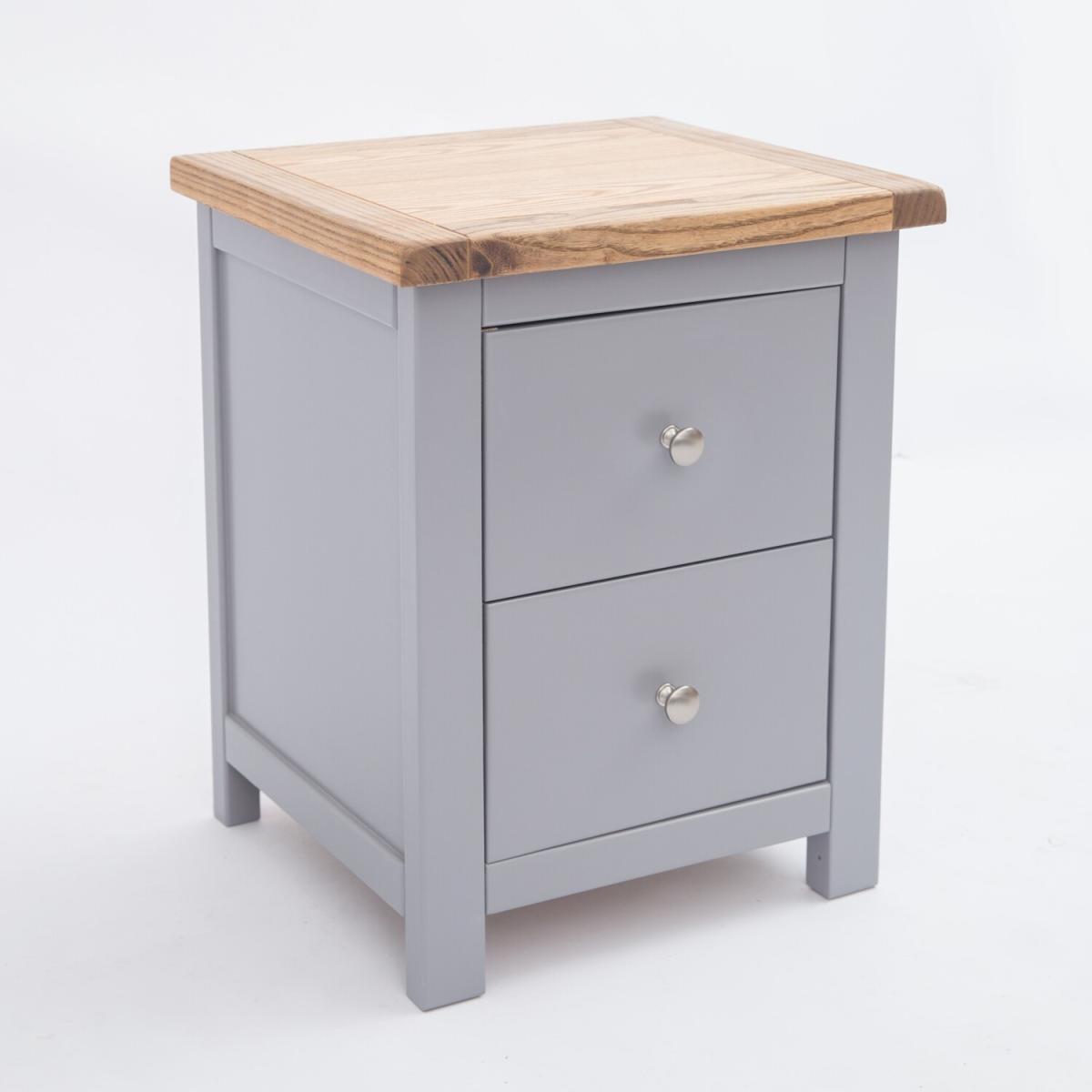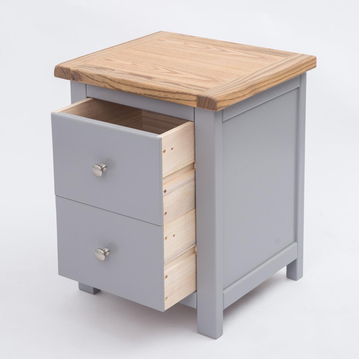 Our Mirano collection has a simple but pleasing design and is produced by our skilled craftsmen to the highest standards using responsibly sourced wood and veneers. All tops are made using a combination of hardwood and ash veneer and are carefully hand-waxed giving them a great look. The body is finished with high-quality eco-friendly water-based paint in a dark grey colour. This 2-drawer bedside cabinet is a perfect fit for your bedroom. With a timeless and traditional design and giving you plenty of storage space. It has 2 deep drawers that can be fitted with chrome or an antique brass knob, giving it great flexibility to fit it into your existing room set. These attributes combined with a simple construction for easy assembly make it a great value product to be taken home today.