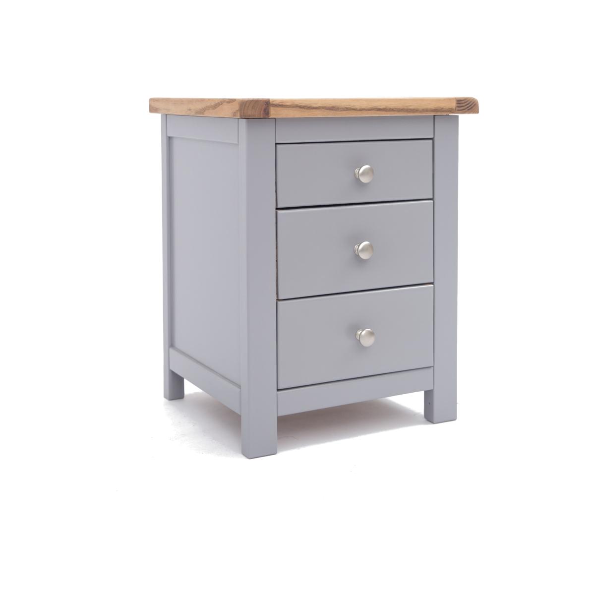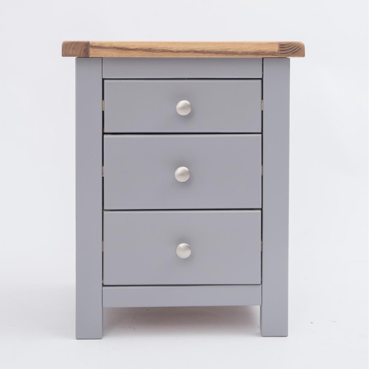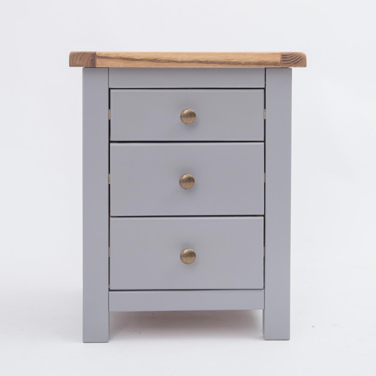 Our Mirano collection has a simple but pleasing design and is produced by our skilled craftsmen to the highest standards using responsibly sourced wood and veneers. All tops are made using a combination of hardwood and ash veneer and are carefully hand-waxed giving them a great look. The body is finished with high-quality eco-friendly water-base paint in a dark grey colour. This 3-drawer bedside is a perfect addition to your bedroom, giving you plenty of flexible storage space. It has one shallow drawer and two deep drawers that can be fitted with chrome or an antique brass knob, giving it great flexibility to fit it into your existing room set. These attributes combined with a simple construction for easy assembly make it a great value product to be taken home today.