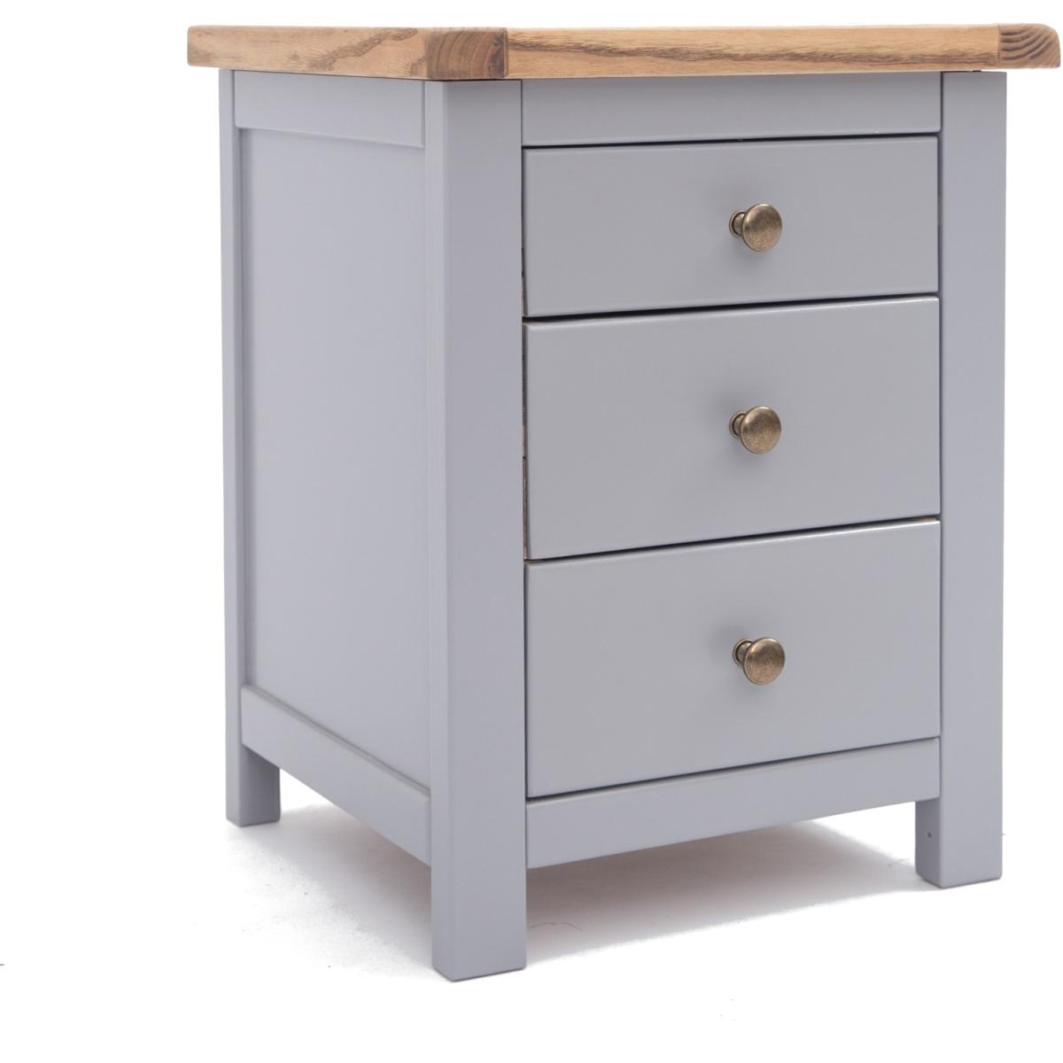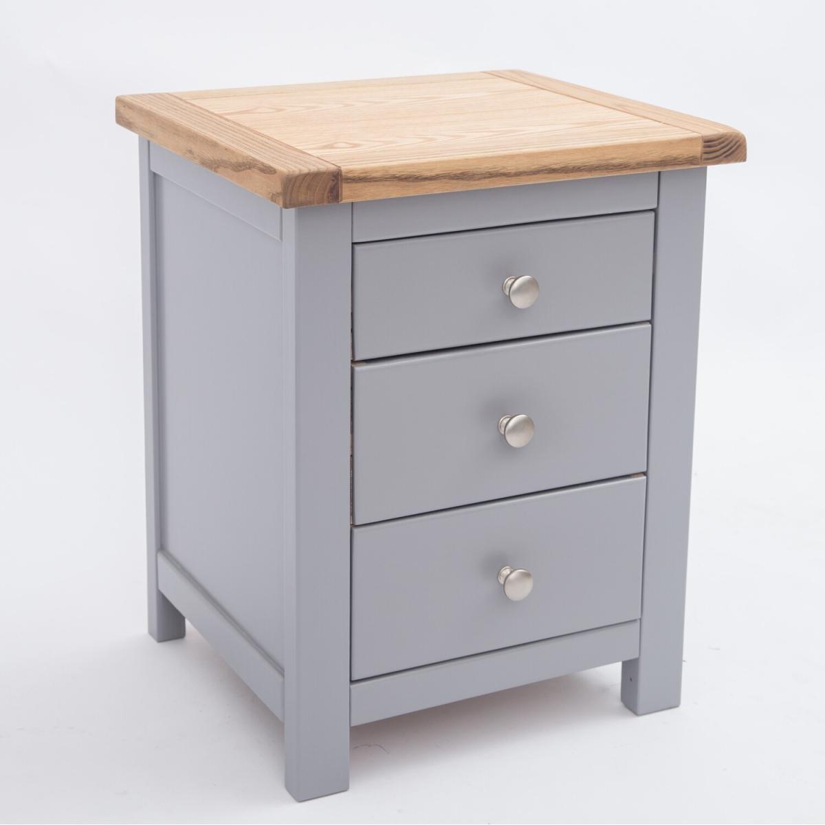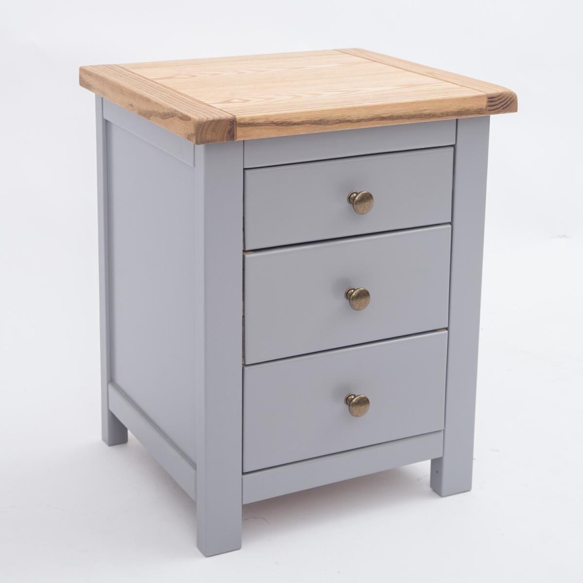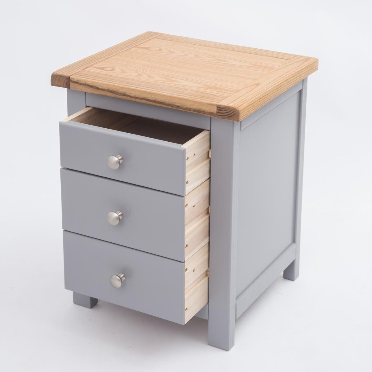 Our Mirano collection has a simple but pleasing design and is produced by our skilled craftsmen to the highest standards using responsibly sourced wood and veneers. All tops are made using a combination of hardwood and ash veneer and are carefully hand-waxed giving them a great look. The body is finished with high-quality eco-friendly water-base paint in a dark grey colour. This 3-drawer bedside is a perfect addition to your bedroom, giving you plenty of flexible storage space. It has one shallow drawer and two deep drawers that can be fitted with chrome or an antique brass knob, giving it great flexibility to fit it into your existing room set. These attributes combined with a simple construction for easy assembly make it a great value product to be taken home today.