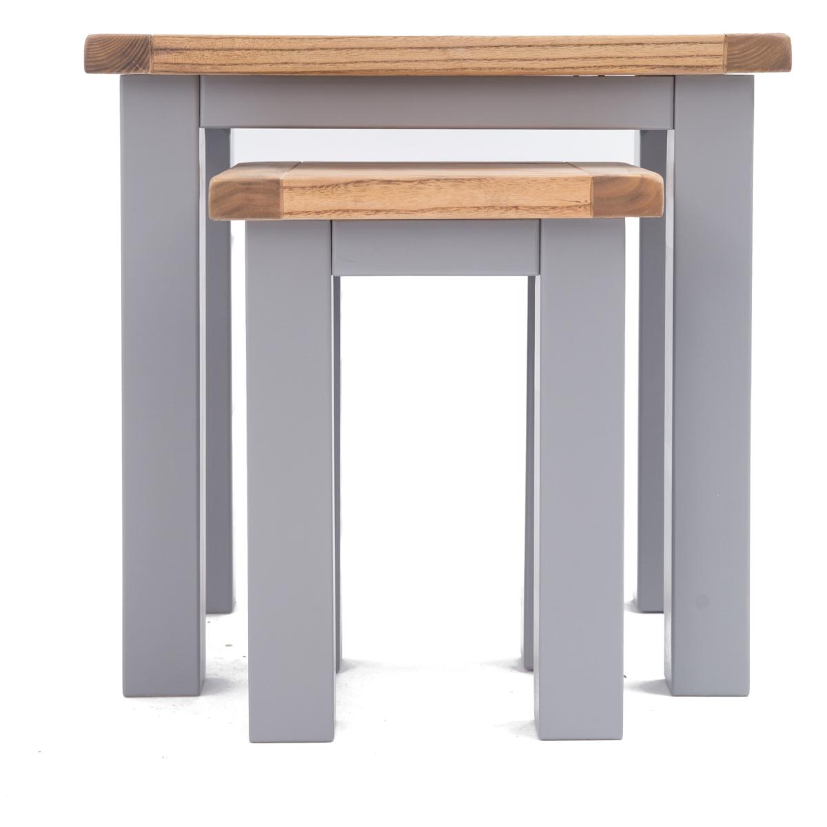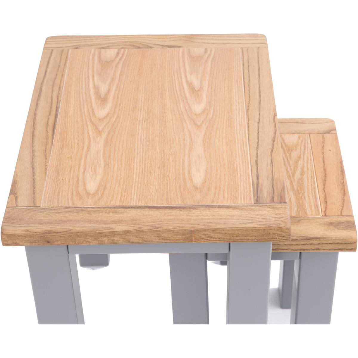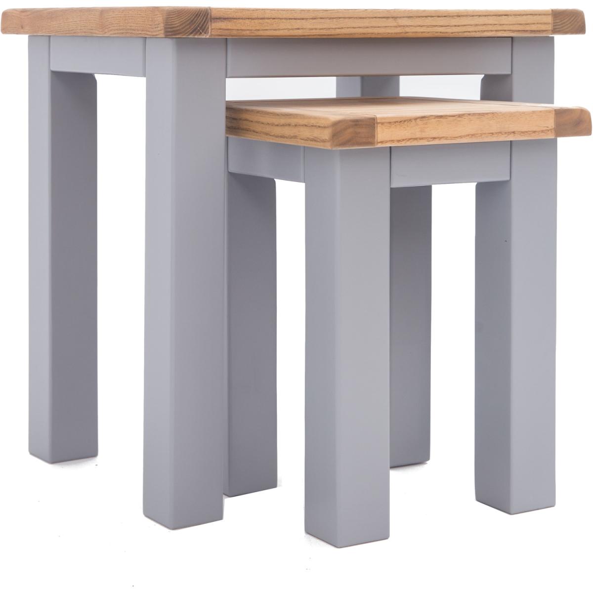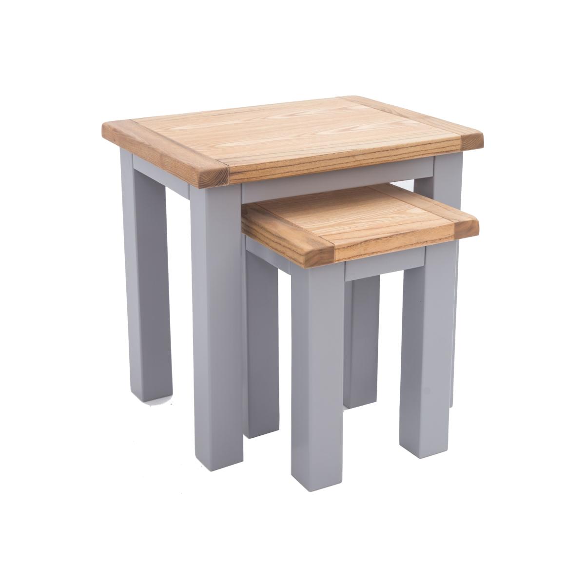 Our Mirano collection has a simple but pleasing design and is produced by our skilled craftsmen to the highest standards using responsibly sourced wood and veneers. All tops are made using a combination of hardwood and ash veneer and are carefully hand waxed giving it a great look. The body is finished with a high quality eco friendly water base paint on a grey colour. The Mirano nest of 2 tables is the perfect item to display all your decorations. They can be kept together or used separately, offering great versatility. The top has a 3cm thick solid wood frame, making it extremely sturdy. These attributes combined with a simple construction for easy assembly makes it a great value product to be taken home today.