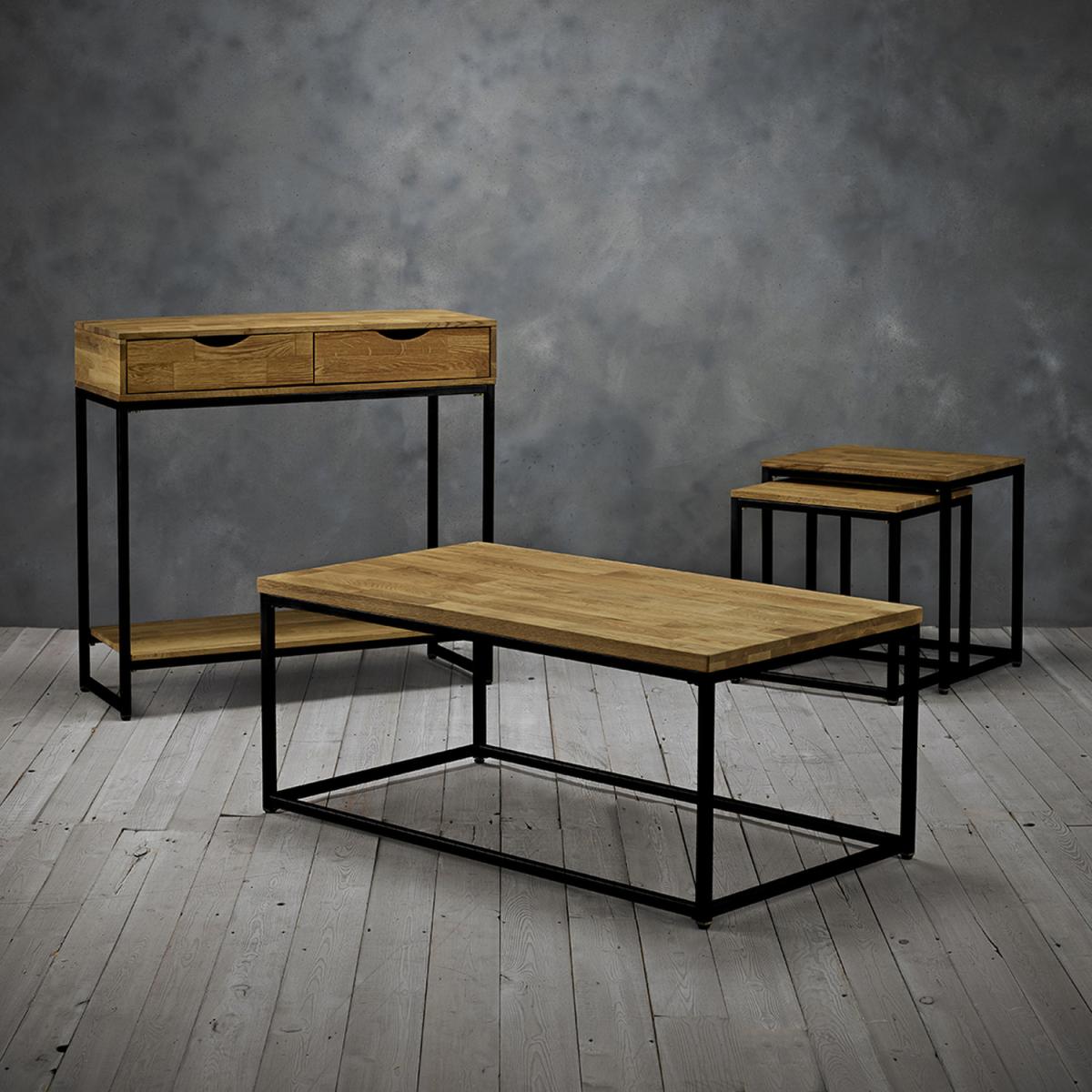 The Mirelle Solid Oak Console Table is a stylish & versatile table that has a beautiful contemporary design. Constructed from a sleek black metal frame to maximise durability, this console table has a brilliant contrasting light oak shelf & set of drawers built onto it, the drawers boast attractive cut-out handles that add to the distinct style of this table. Give your living space a modern, urban feel with our new Mirelle occasional furniture. Solid oiled oak tops paired with metal frame in either classic black or voguish gold paint finish.