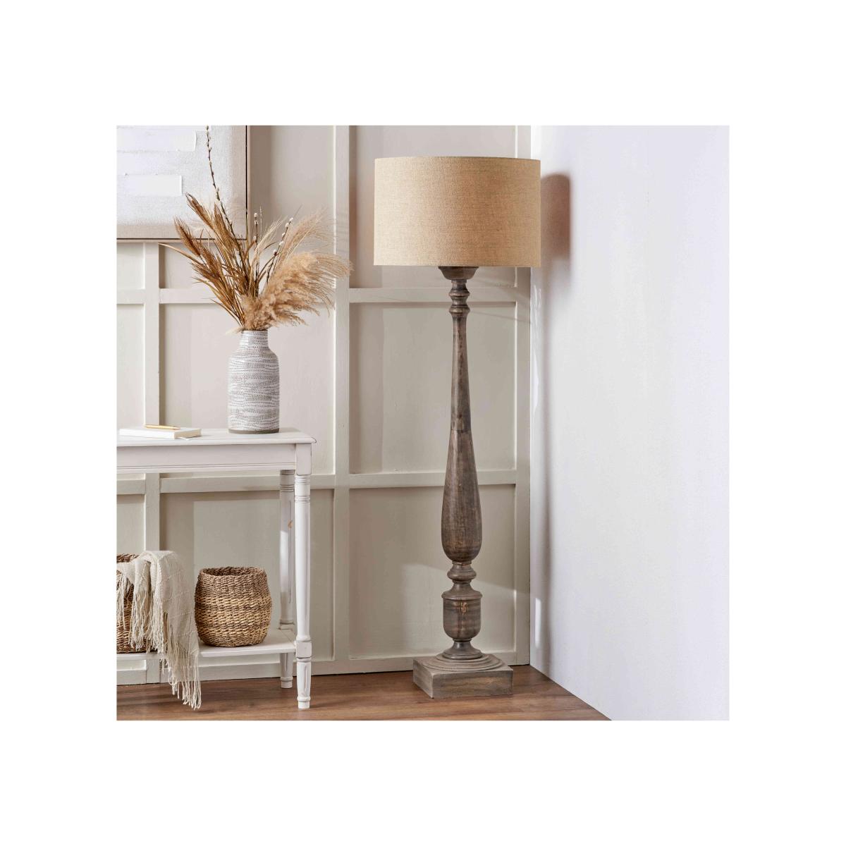 This beautiful handcrafted floor lamp is full of natural charm. It’s best paired with a cosy sofa and a night in front of the telly. Why you'll love it The rustic turned mango wood base is classically stylish. Finished with a calming neutral grey wash. Comes with a natural hessian-effect lampshade. Also available as a matching table lamp. What you need to know Mango wood base with grey wash finish. Linen lampshade. Requires 1 x E27 10-12W LED bulb (not included). Dimensions Width: 45 cm (18 inches) Height: 160 cm (63 inches) Depth: 45 cm (18 inches) Weight: 11.2 kg