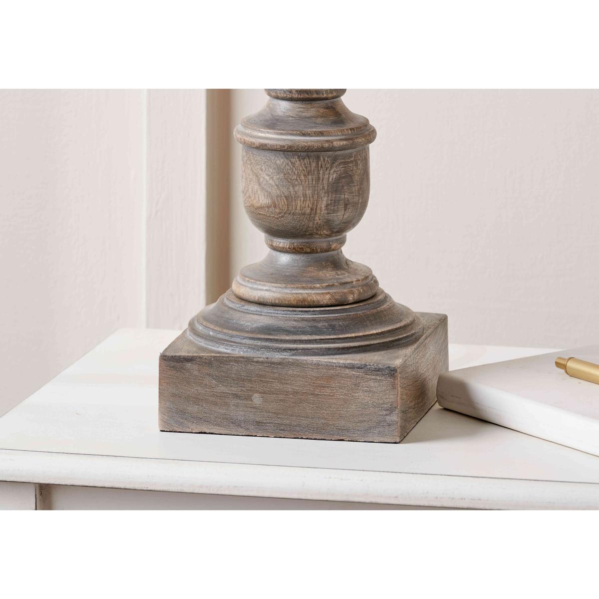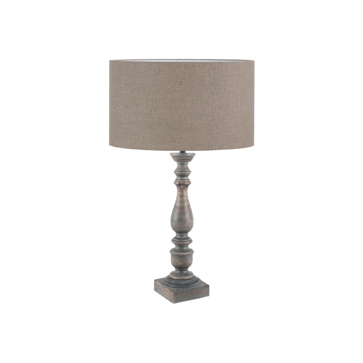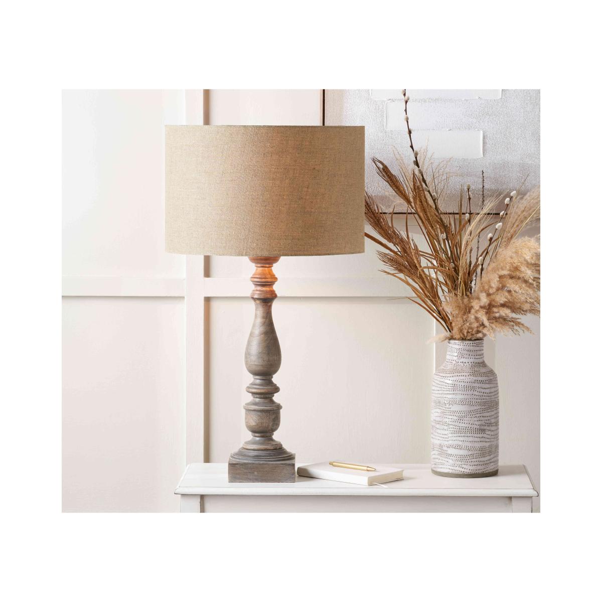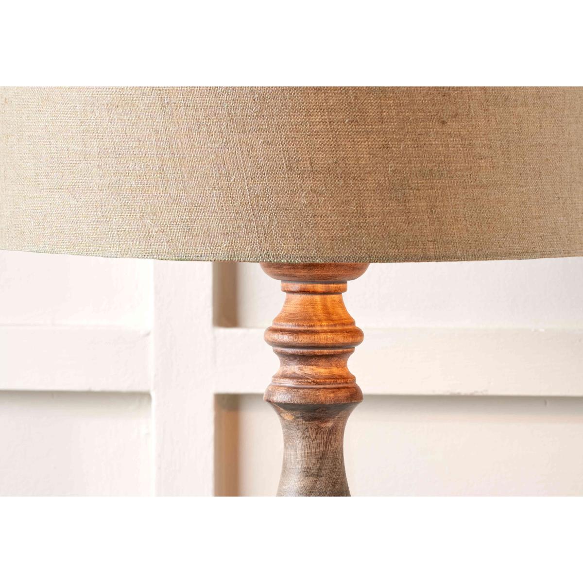 Ideal for adding some cosy lighting in the evening, or illuminating a comfy reading nook, this table lamp is beautifully handcrafted and great-value. Why you'll love it The rustic turned mango wood base is classically stylish. Finished with a calming neutral grey wash. Comes with a natural hessian-effect lampshade. Also available as a matching floor lamp. What you need to know Mango wood base with grey wash finish. Linen lampshade. Requires 1 x E27 10-12W LED bulb (not included). Dimensions Width: 41 cm (16 inches) Height: 68 cm (27 inches) Depth: 41 cm (16 inches) Weight: 3.4 kg