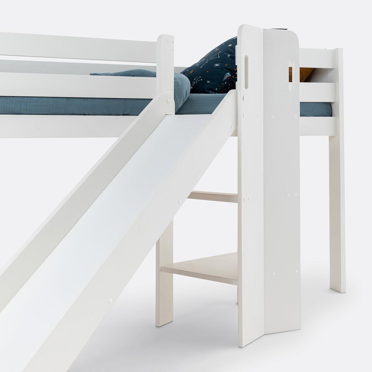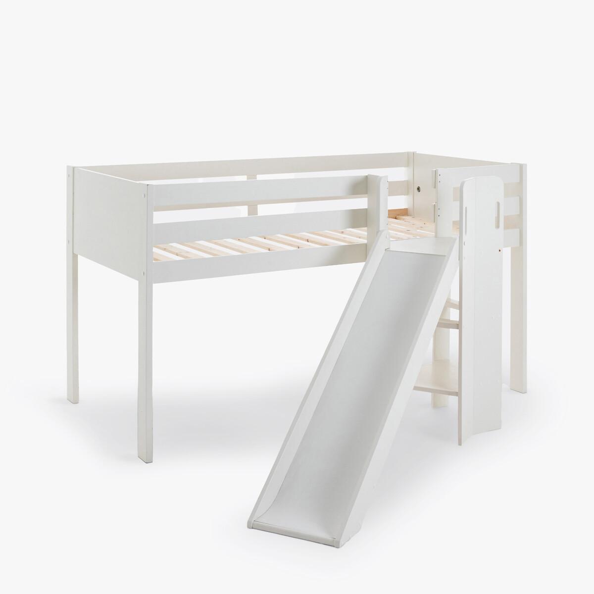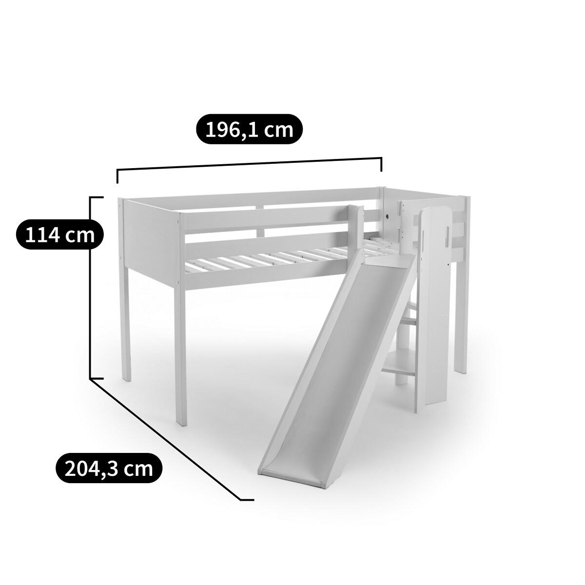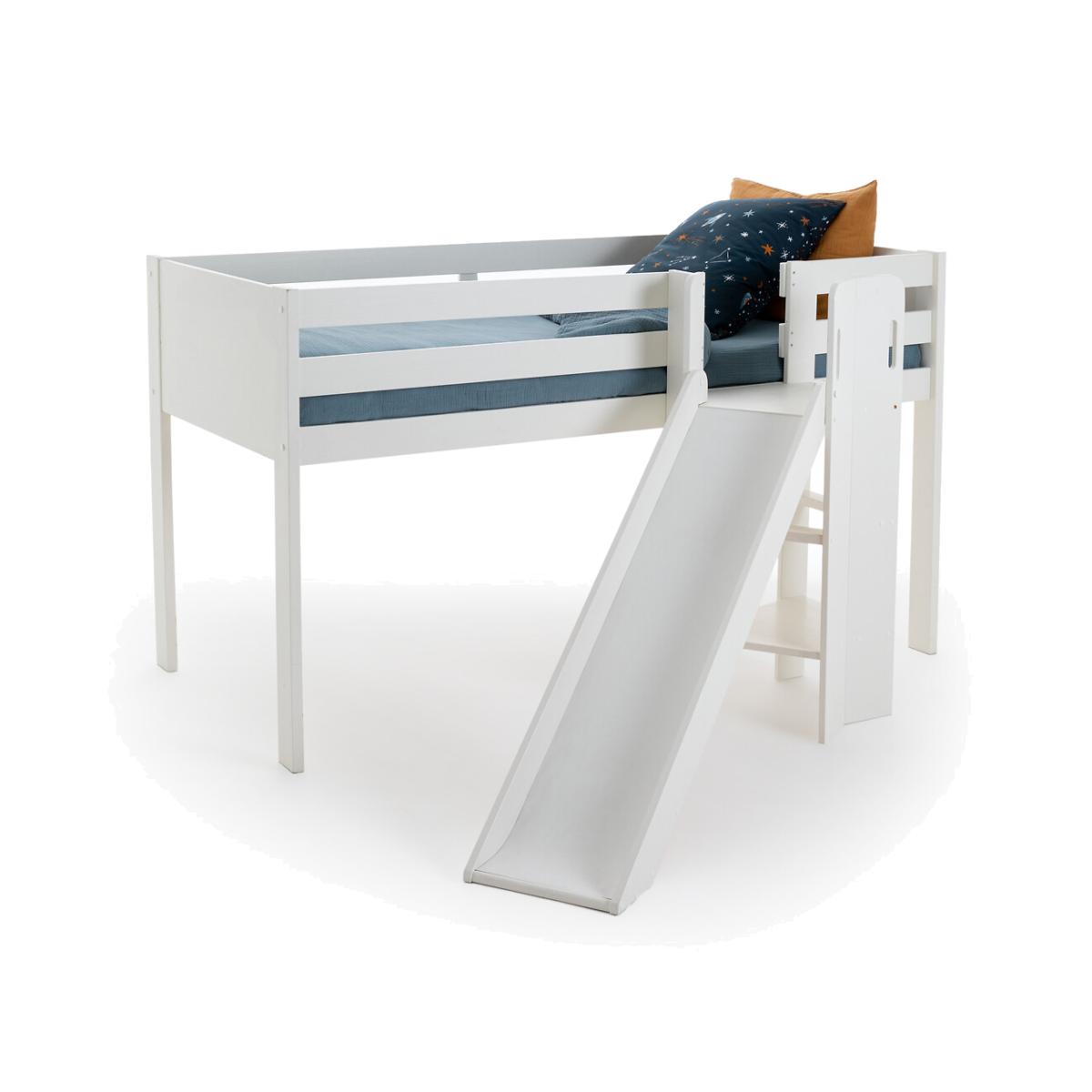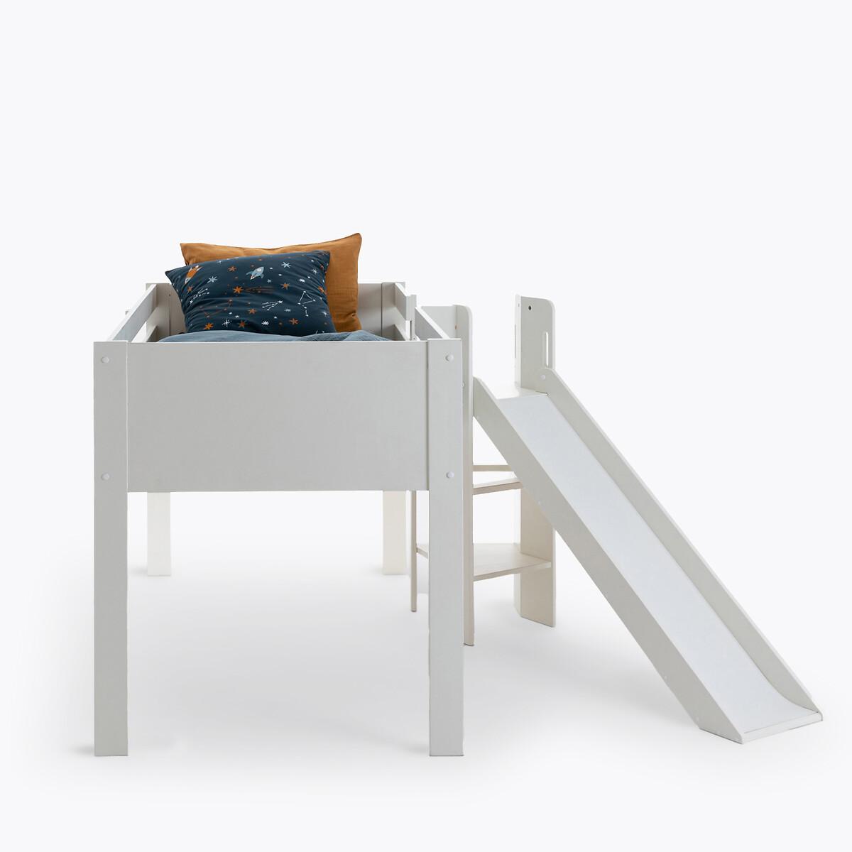When dreams become reality. Fun and practical, the Mirka slide bed has it all!A structure and base in FSC® certified solid pine, a removable slide to adapt to the age of your child, a slightly raised space under the bed to store toys or create an ultra cosy play area... Getting out bed has never been so much fun. Made in Europe. Product Details • In solid pine and FSC® certified MDF with acrylic finish • Slatted base in raw solid pine • Sleeping area: 90 x 190cm. Quality Info • This product complies with current safety requirements. • This bunk bed is not suitable for children under 6 years of age. ATTENTION, slide: • designed for home use • Minimum age of use: From 6 Years • Maximum weight : 50kg. Dimensions • Width: 204.3 cm (including slide) • Height: 114cm • Length: 196.1cmDelivery:. This product is sold for self-assembly. It will be delivered to your door. Note! Please check that all access points are large enough to accommodate your delivery (doors, stairs, lifts). • Made in Europe. • WOOD FROM SUSTAINABLY MANAGED FORESTS. FSC® certified wood comes from forests that are environmentally, socially and economically well managed. Dimensions and weight of parcel3 parcels • L159.5 x H11.5 x D33.7cm. 21kg • L200 x H10.2 x D13.7cm. 9kg • L94 x H10.5 x D47.3cm. 21kg