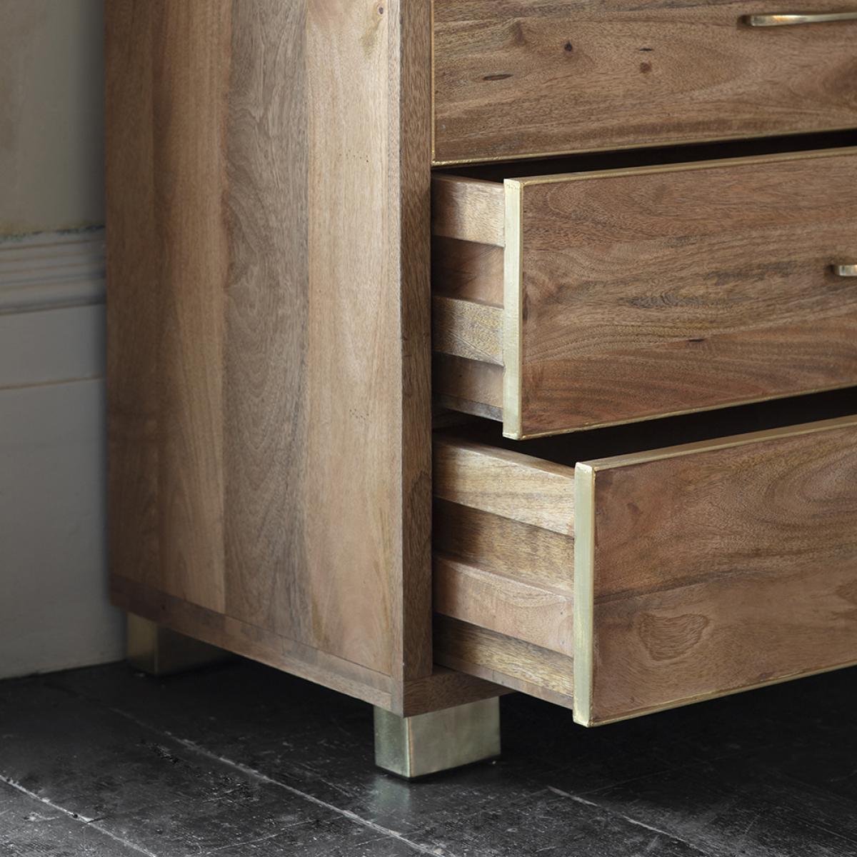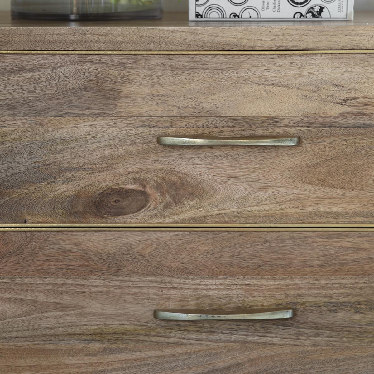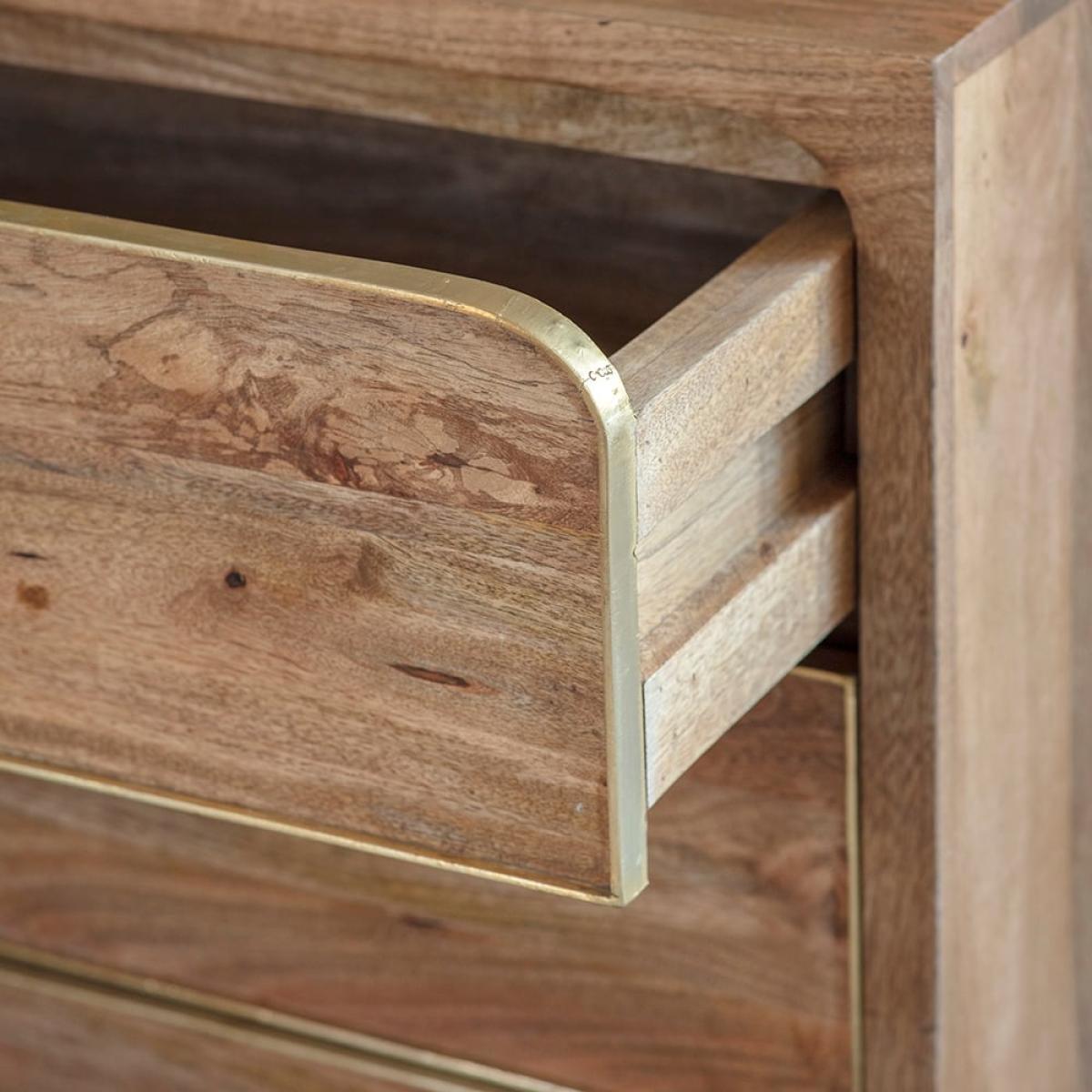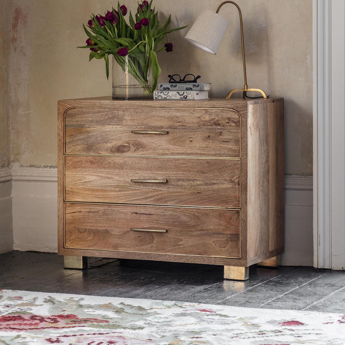 Part of our classic cabinetry collection, our Miro range has a timeless look and is built to last. This Miro 3 Drawer Chest is made from solid mango wood with luxurious inset brass foil design details on each of the drawers and feet. The Miro three-drawer wooden chest has plenty of room for clothes and accessories and its natural finish will complement any classic bedroom scheme. The light colour stain on the wood allows the natural difference in the wood grain, knots and natural colour variations of the wood below to shine through. This piece is handmade and each piece looks slightly different which we think adds to the charm of this furniture range. For a fully co-ordinated look in the bedroom or guest room, we also have a matching Miro bedside drawer and console desk.