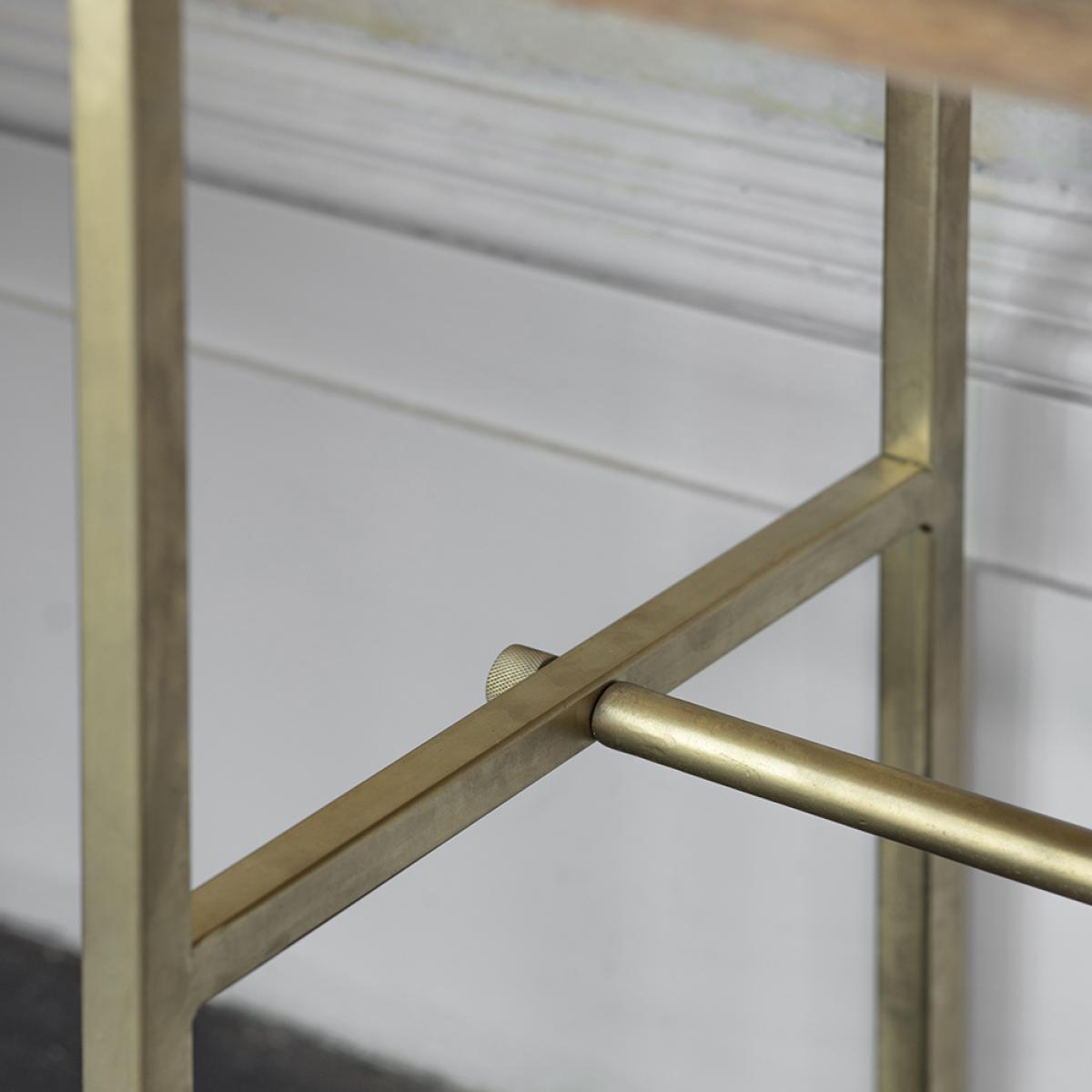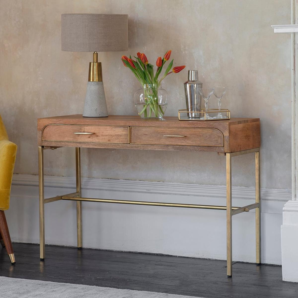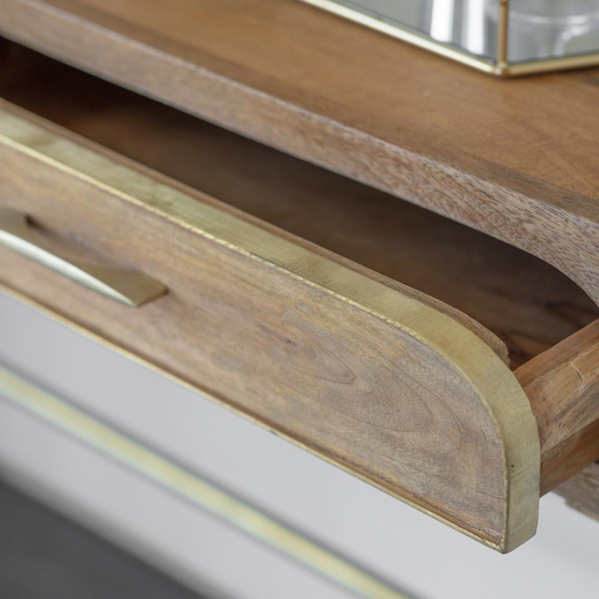 Part of our classic cabinetry collection, our Miro range has a timeless look and is built to last. Our Miro Console Desk is made from solid mango wood with luxurious inset brass foil design details on each of the drawers and a sturdy iron base that has been treated with a contemporary brass colour. We love the milled detail to the fixings on the base – this attention to detail helps elevate this piece to something special. The Miro two drawer console is ideal as a dressing table, a desk for home working or a console in a narrow hallway. Perfectly proportioned, and with built in storage this is a practical table with an airy base that makes it perfect for smaller rooms as the brass metal base gives the illusion of more floor space. The natural finish on our Miro range will complement any interior, and the light colour stain on the wood allows the natural difference in the wood grain, knots and natural colour variations of the wood below to shine through. This piece is handmade and each piece looks slightly different which we think adds to the charm of this furniture range. For a fully co-ordinated look in the bedroom or guest room, we also have a matching Miro chest of drawers and bedside table.