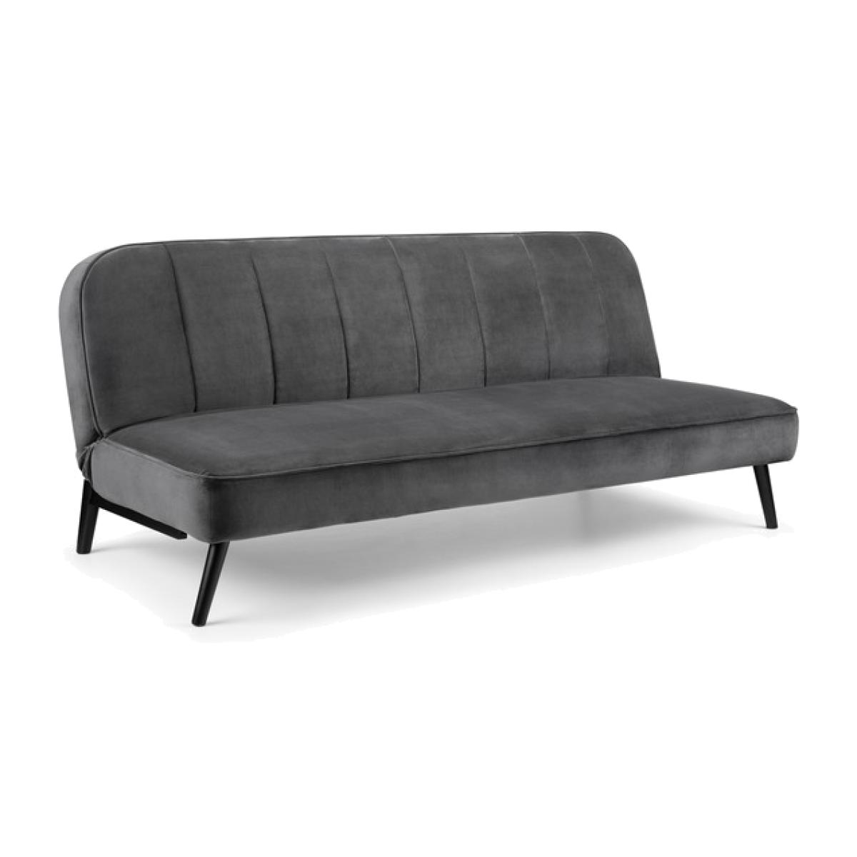This minimalist, retro-inspired sofabed is compact and functional with an easy click-clack design. Upholstered in luxurious grey velvet fabric, featuring a beautiful curved back and scallop detailing with tapered black legs, this sofabed will suit a range of modern interiors.