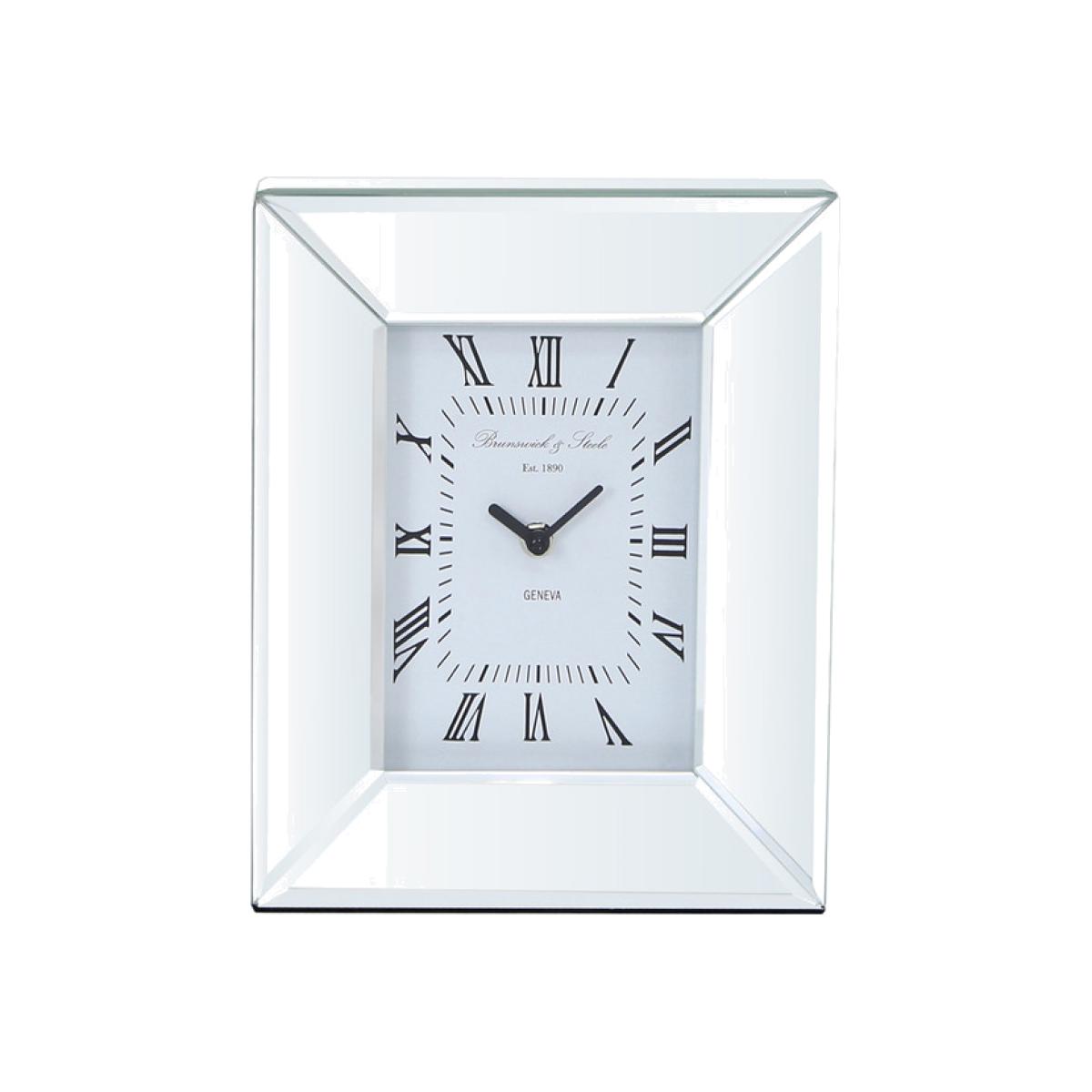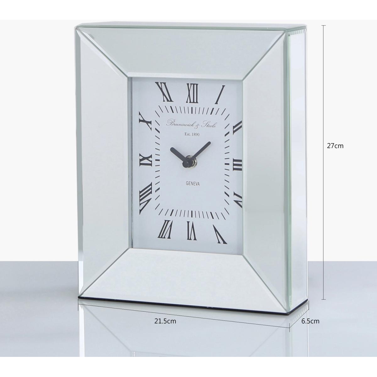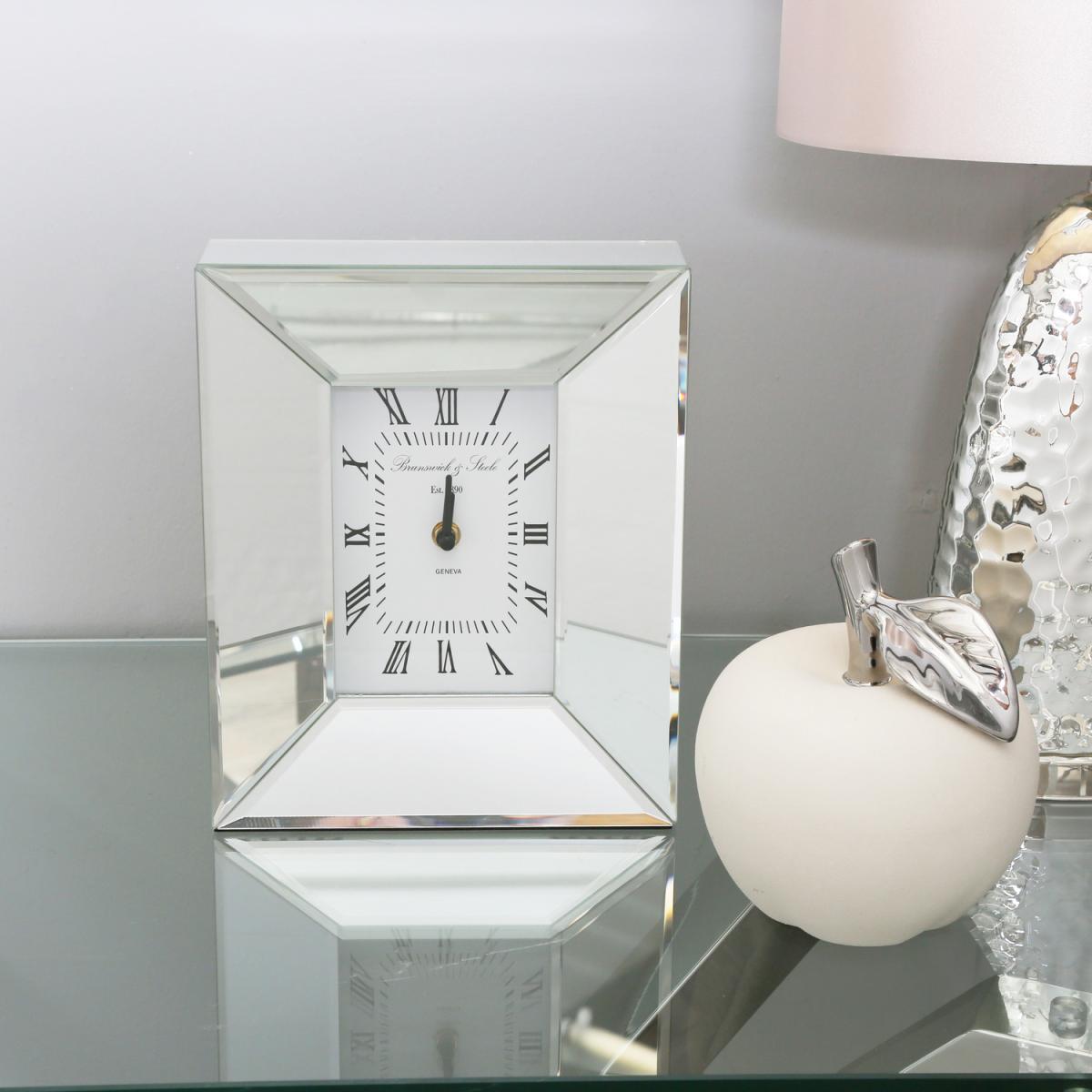 A beautiful contemporary mirrored glass mantel clock with bevelled glass panels throughout. Rectangular shape clock face with black roman numerals and black clock hands. Mirrored from the sides, top with glass front.