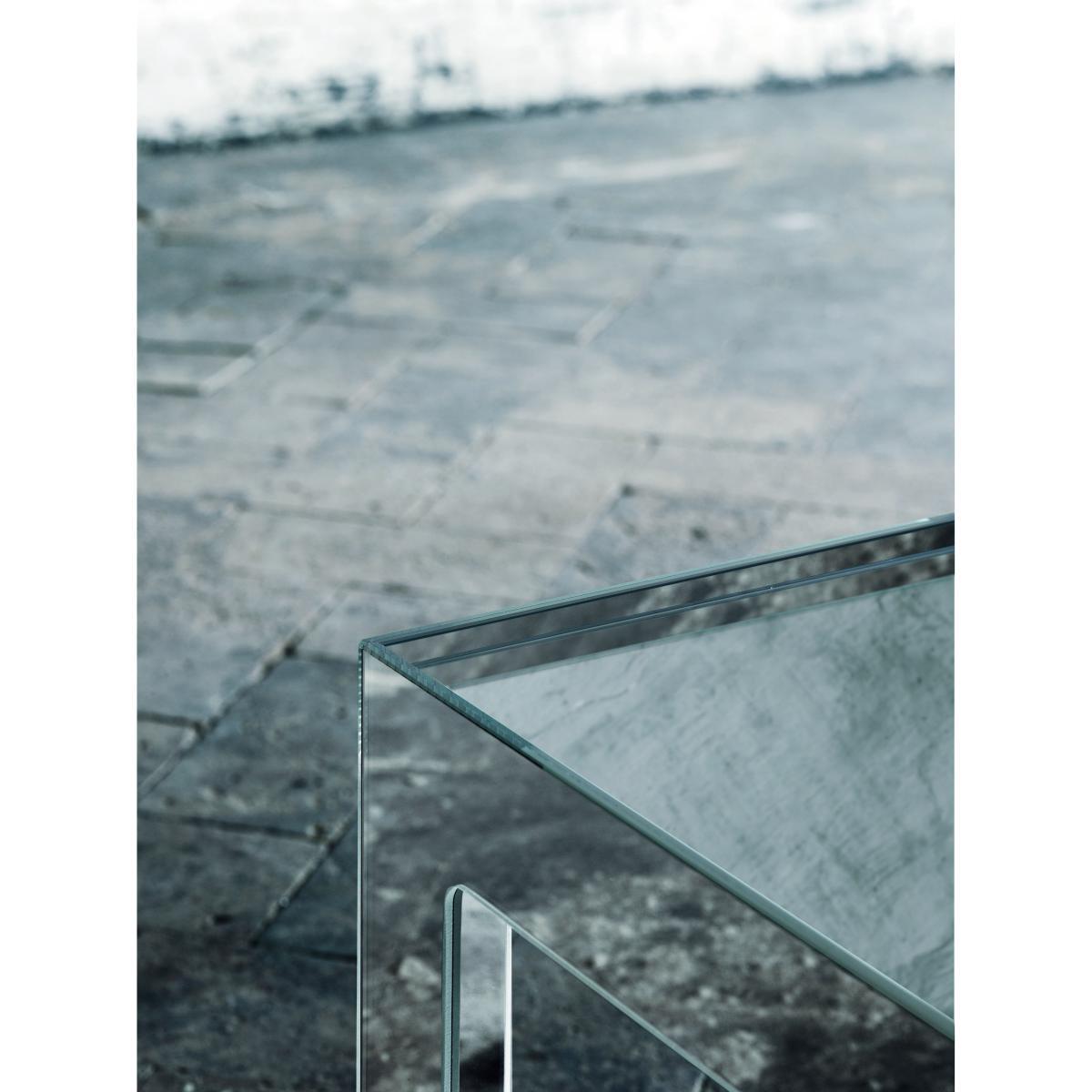 Collection of high tables, low tables and consoles available in different sizes, whose base is obtained by gluing 45° water jet cut laminated double faces mirror slabs. In the low tables the mirror tops rests lower down within the base frame, so as to be contained by an upstand profile. In the high tables and the consoles the top instead is resting on the base frame.