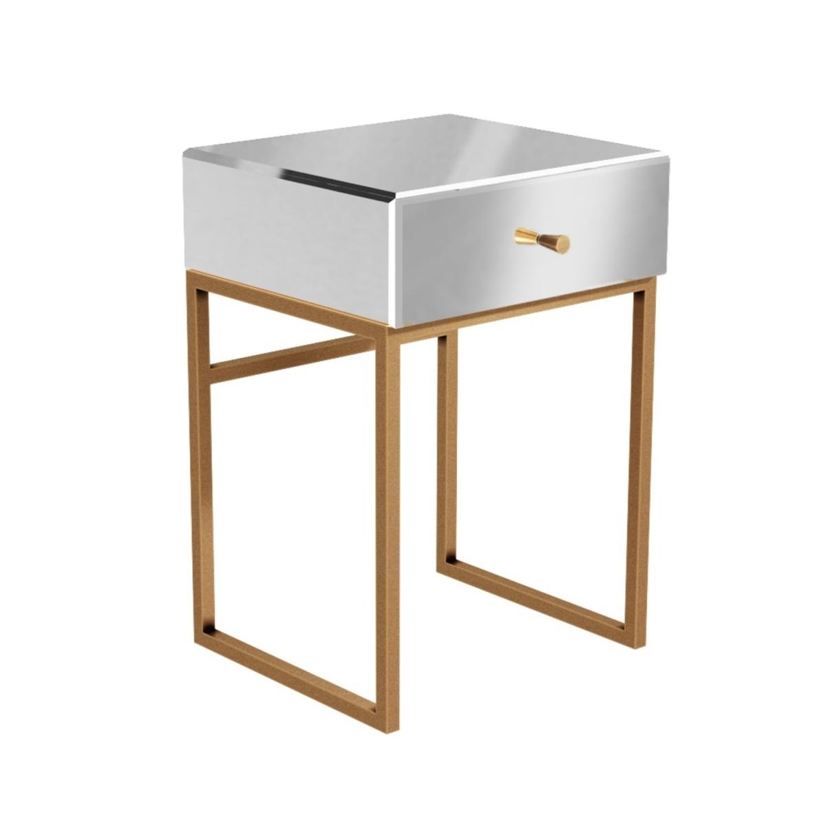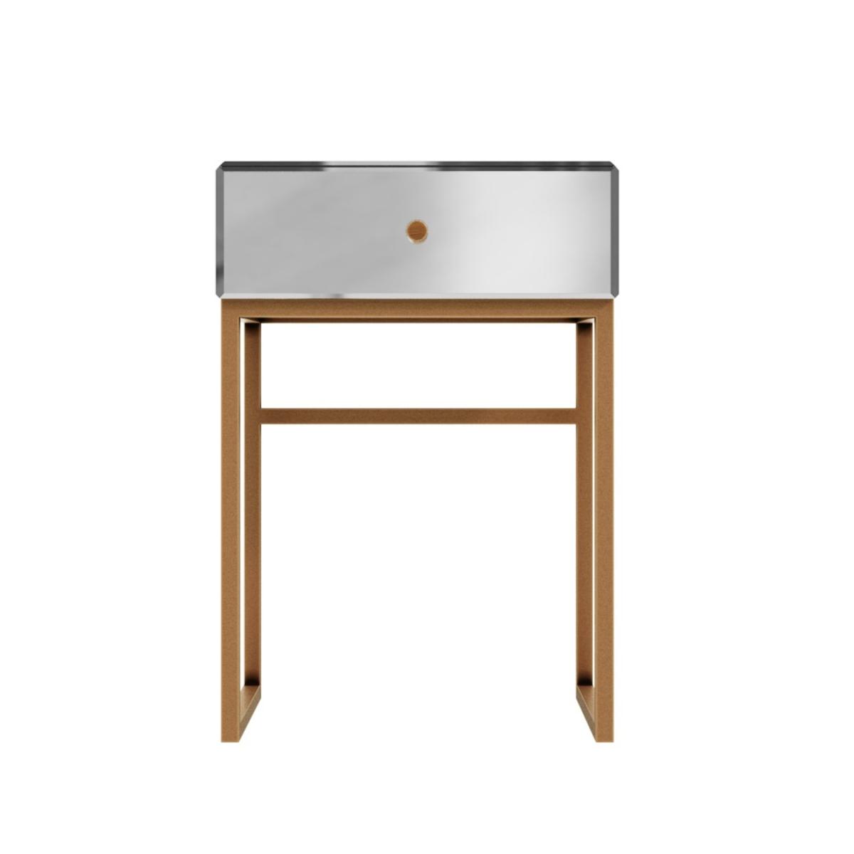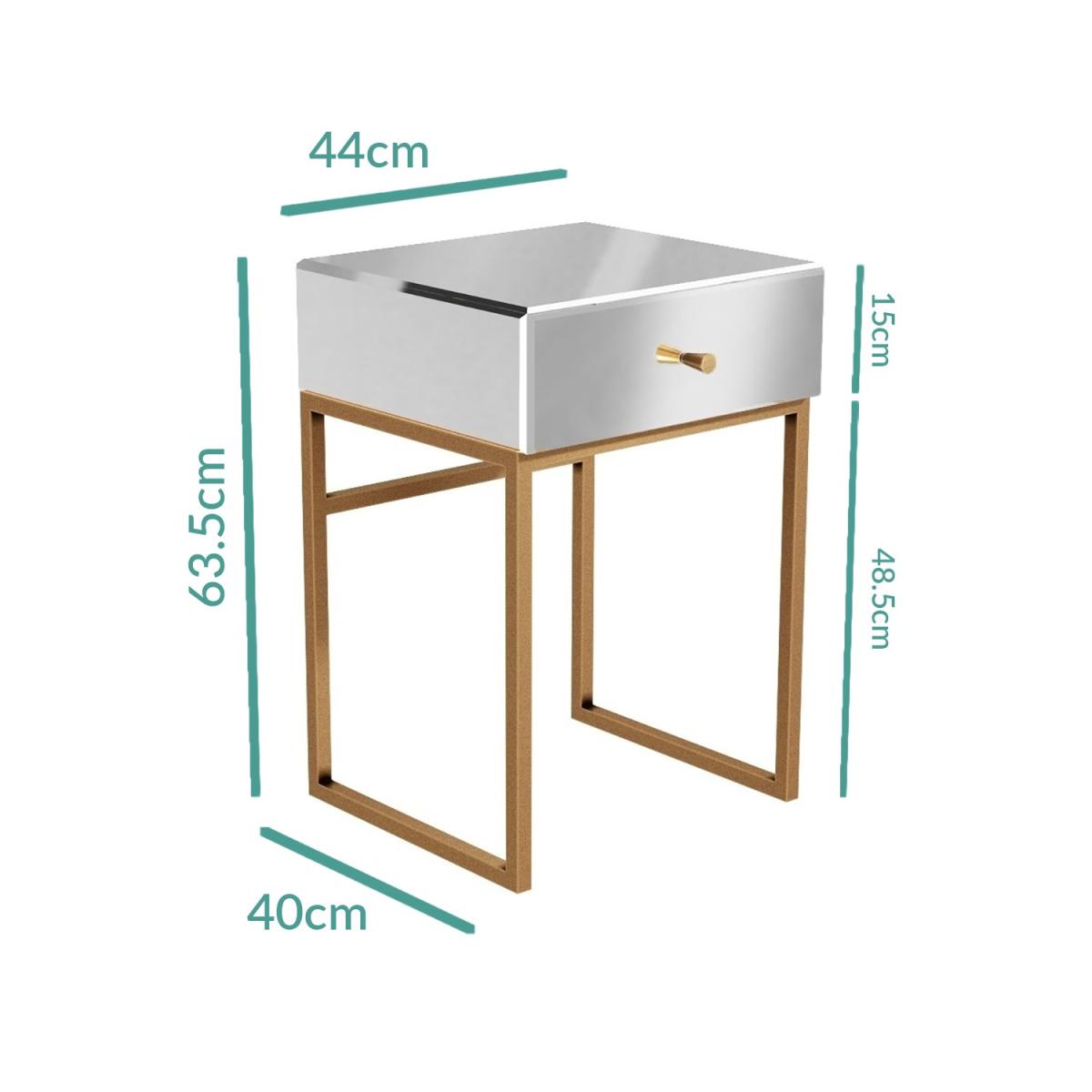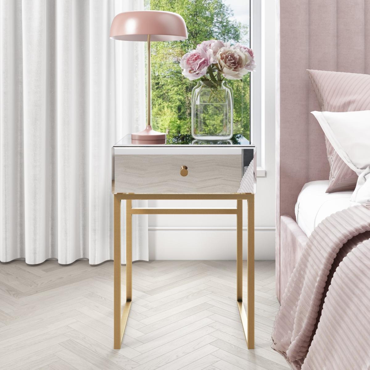 Features we love. Mirrored single drawer bedside table. Gold legs and frame add a stylish look. Perfect for any bedroom with a handy storage drawer Modern contemporary style with bevelled edges. Matching pieces available just search Lola All about me. Give your bedroom a touch of elegance with this Lola bedside table. It makes a stunning focal point thanks its beautifully bevelled mirrored panels sturdy gold frame and stylish gold tapered handle. It would look great in any bedroom setting. It's practical too. There's a spacious drawer to keep your bedtime essentials close at hand. The top provides plenty of room also perfect for setting down your bedtime read as well as standing a stylish lamp and an alarm clock within easy reach. Why not combine it with the matching pieces to create a complete suite. Need to know. Overall dimensions. W44 x D40 x H63.5 cm Inner drawer dimensions. W36.4 x D34 x H8 cm Number of drawers. 6 Weight. 13kg Colour. Glass Gold Finish. Mirror gold painted frame and copper handle Material. Wood construction mirror steel metal ball runners and copper handle Assembly required. Yes.