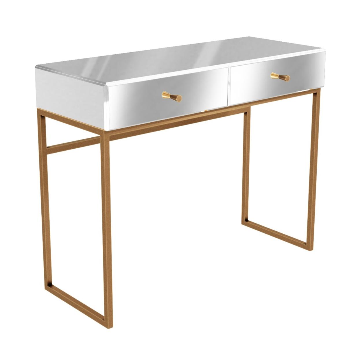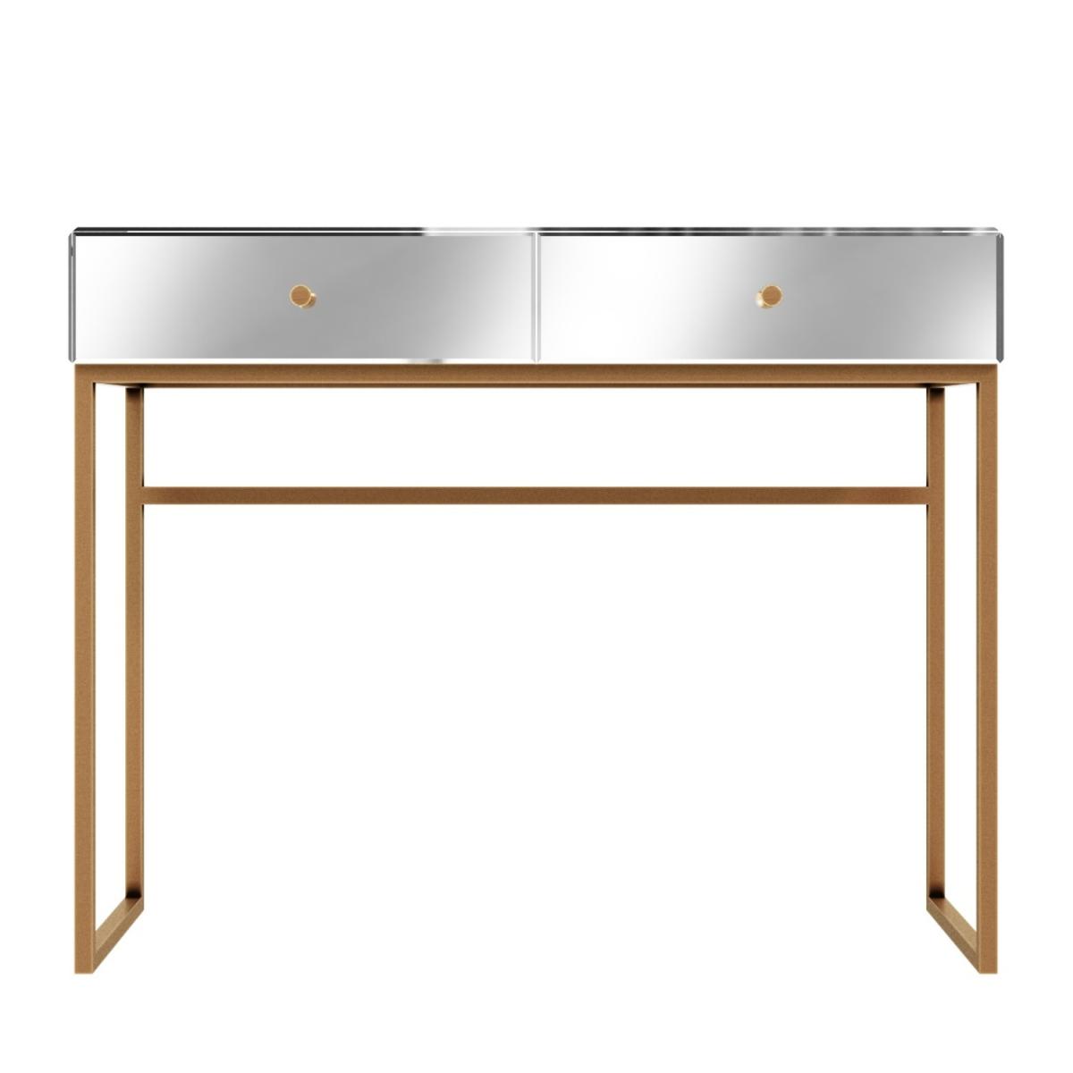 Features we love. Mirrored dressing table with bevelled edges. Gold legs and frame add a stylish look. Great storage with two spacious drawers. Modern contemporary style with bevelled edges. Matching pieces available just search Lola All about me. Give your bedroom a touch of elegance with this Lola dressing table. It makes a stunning focal point thanks its beautifully bevelled mirrored panels sturdy gold frame and stylish gold tapered handles. It would look great in any bedroom setting. It's practical too. There are two spacious drawers providing plenty of room for storing your dressing table necessities such as makeup and accessories so you'll be able to keep your space neat and tidy. You can even use this as a hallway console table to really wow guests entering your home. Why not combine it with the matching pieces to create a complete suite. Need to know. Overall dimensions. W100 x D40 x H80 cm Inner drawer dimensions. W46.4 x D34 x H8 cm Number of drawers. 2 Weight. 24kg Colour. Glass Gold Finish. Mirror gold painted frame and copper handle Material. Wood construction mirror steel metal ball runners and copper handle Assembly required. Yes.