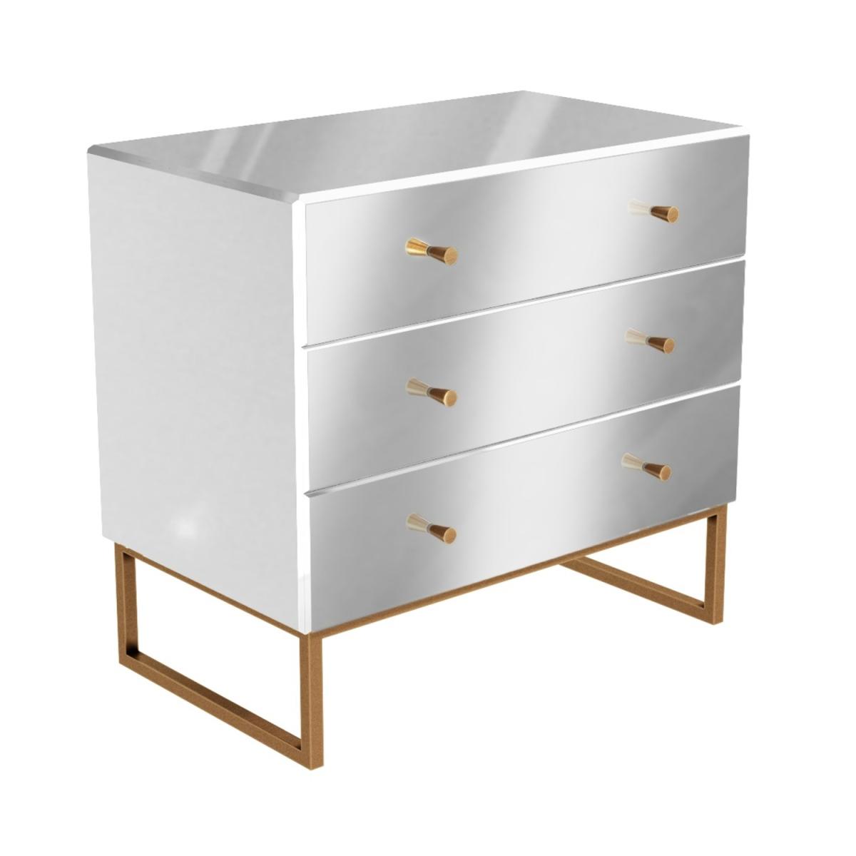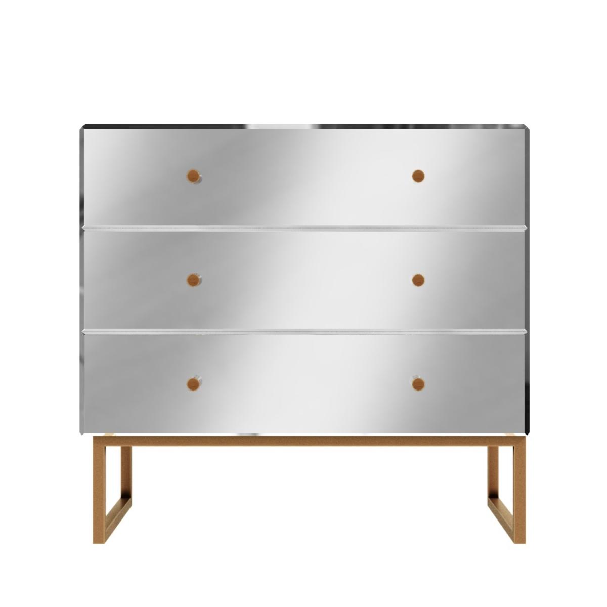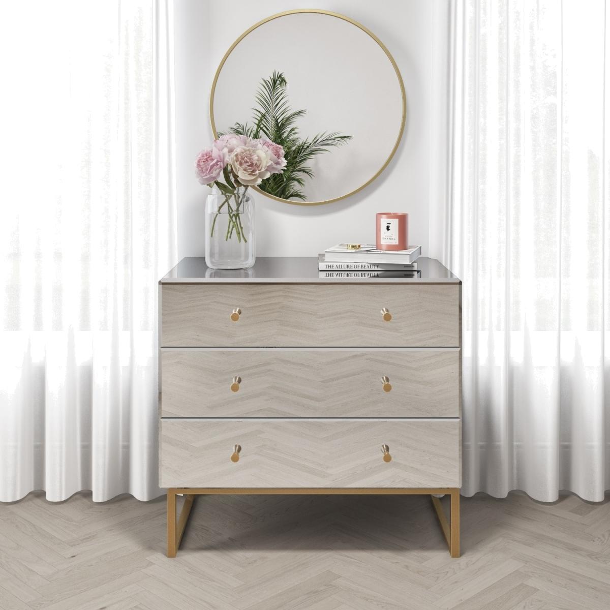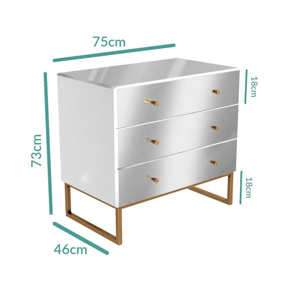 Features we love. Mirrored three drawer chest of drawers. Gold legs and frame add a stylish look. Modern contemporary style with bevelled edges. Three spacious drawers great for storage Assembly required All about me. Give your bedroom a touch of elegance with this Lola chest of drawers. It makes a stunning focal point thanks its beautifully bevelled mirrored panels sturdy gold frame and stylish gold tapered handles. It would look great in any bedroom setting. It's versatile too. The three generous sized drawers provide ample space for keeping your folded items and worldly possessions stored neatly away. The top is great for holding your personal belongings a fresh vase of flowers or even a TV. Why not combine it with the matching pieces to create a complete suite. Need to know. Overall dimensions. W75 x D46 x H73.5 cm Inner drawer dimensions. W67.5 x D34 x H11 cm Number of drawers. 3 Weight. 43kg Colour. Glass Gold Finish. Mirror gold painted frame and copper handle Material. Wood construction mirror steel metal ball runners and copper handle Assembly required. Yes.