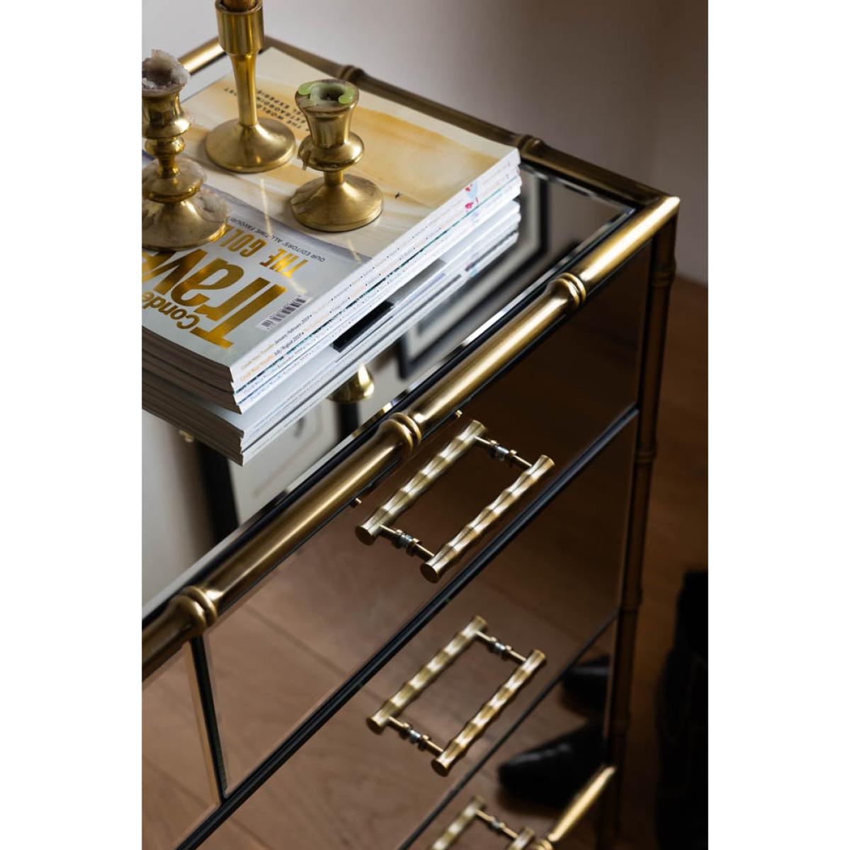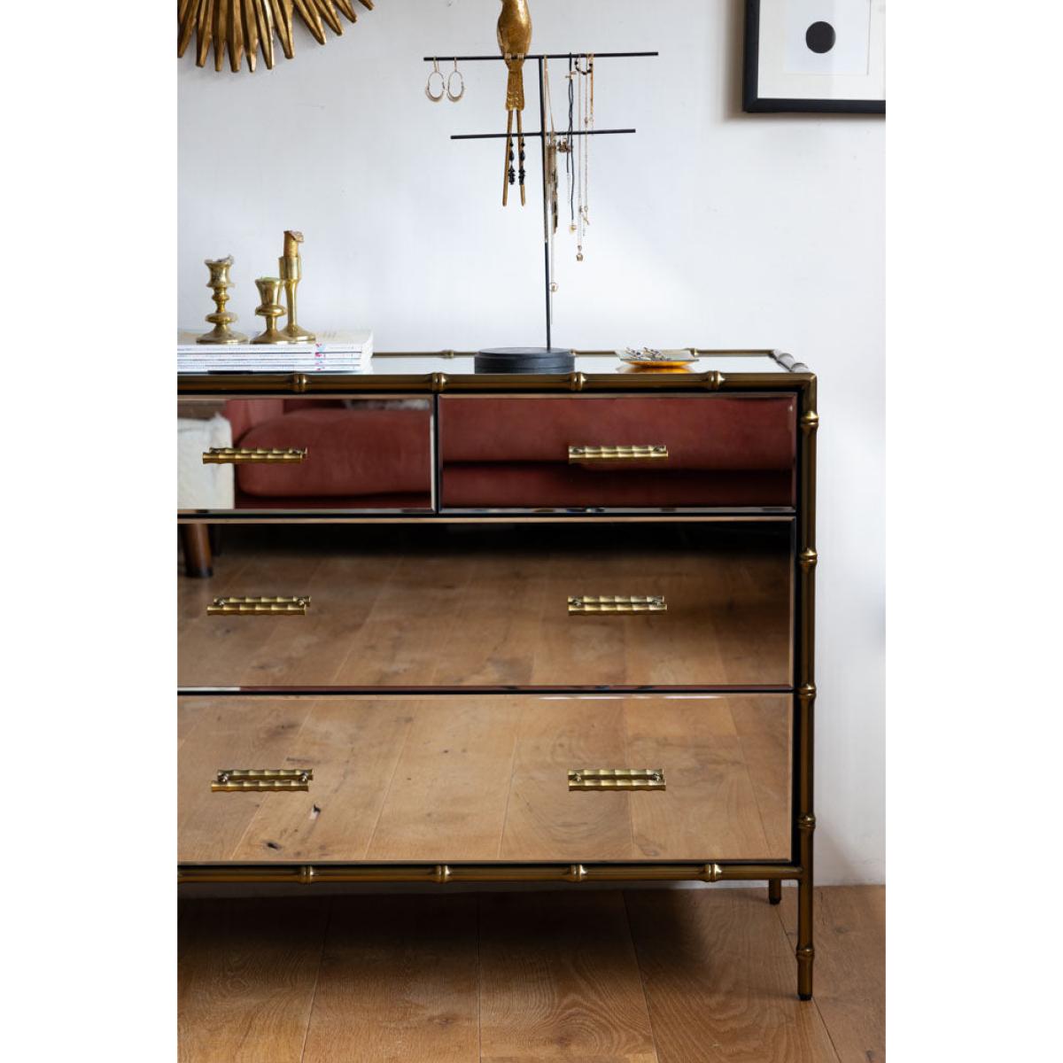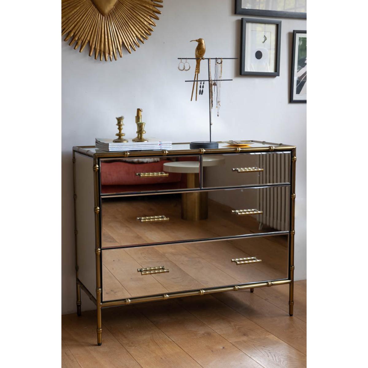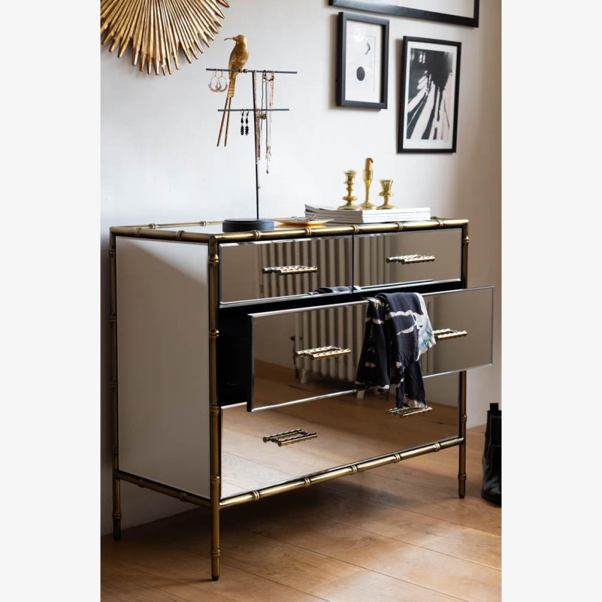 <!--td --> This fabulous chest-of-drawers is a modernist’s dream – the sleek lines and mirrored finish are the ultimate in contemporary chic, while this also taps into the metallics trend that’s been HUGE recently. This is a three-tier piece that features two large drawers bottom and middle, with two smaller ones at the top (only the best for your fancy pants and socks, after all). The bamboo detailing of the frame, which is echoed through the handles, is finished in a weathered bronze effect, giving this a touch of rustic appeal we love. This chest is a treat to behold as part of any interior decor theme, whether it’s sleek Scandi or bonkers maximalist. Style this elegant piece with as many or as few ornaments as your heart desires – go for verdant greenery, pretty trinket trays or photos of the people you love most in the world. Your home, your rules, after all! - Mirrored Bamboo Effect Chest Of Drawers- Material: MDF, Mirrored Glass, Metal - Measures: H95cm x W80cm x D42cm