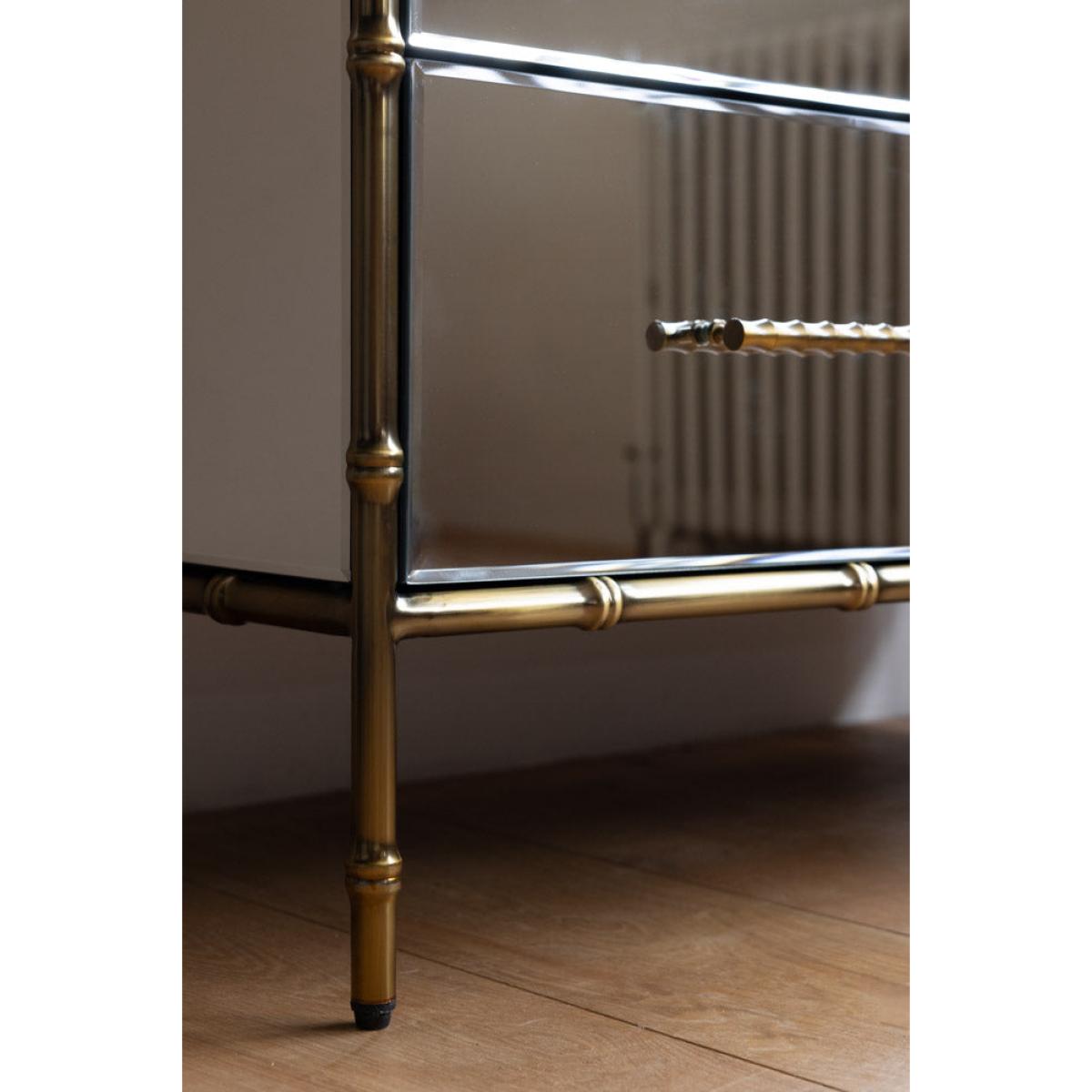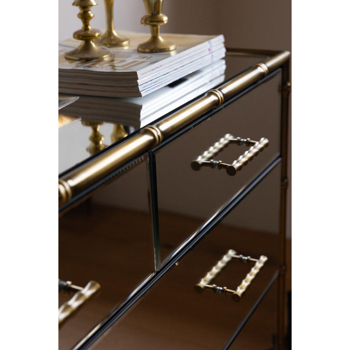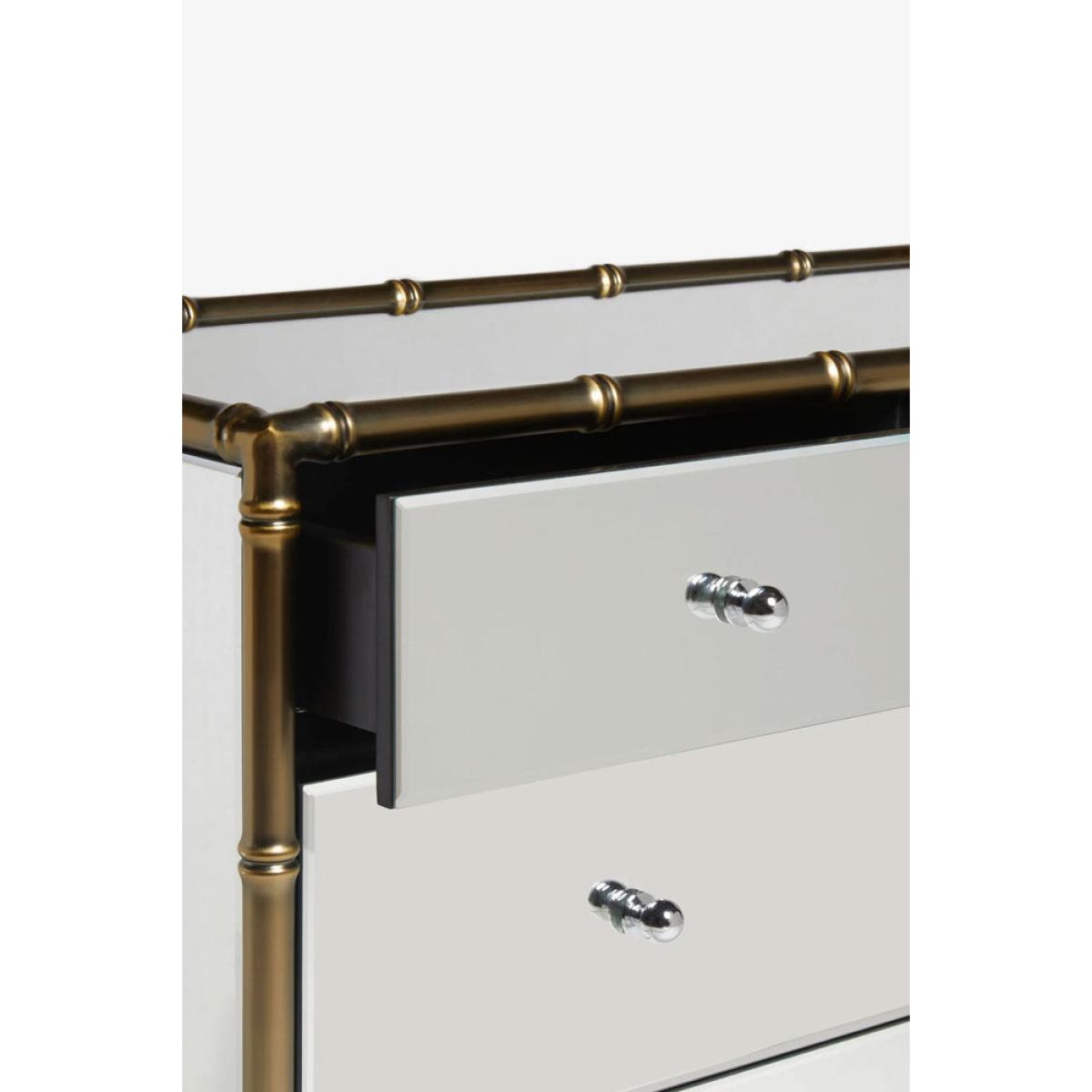 <!--td --> This fabulous chest-of-drawers is a modernist’s dream – the sleek lines and mirrored finish are the ultimate in contemporary chic, while this also taps into the metallics trend that’s been HUGE recently. This is a three-tier piece that features two large drawers bottom and middle, with two smaller ones at the top (only the best for your fancy pants and socks, after all). The bamboo detailing of the frame, which is echoed through the handles, is finished in a weathered bronze effect, giving this a touch of rustic appeal we love. This chest is a treat to behold as part of any interior decor theme, whether it’s sleek Scandi or bonkers maximalist. Style this elegant piece with as many or as few ornaments as your heart desires – go for verdant greenery, pretty trinket trays or photos of the people you love most in the world. Your home, your rules, after all! - Mirrored Bamboo Effect Chest Of Drawers- Material: MDF, Mirrored Glass, Metal - Measures: H95cm x W80cm x D42cm