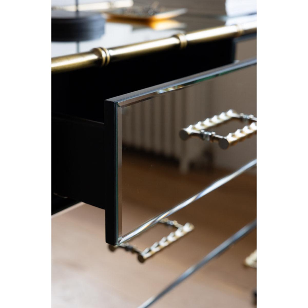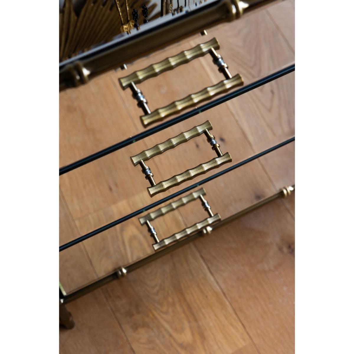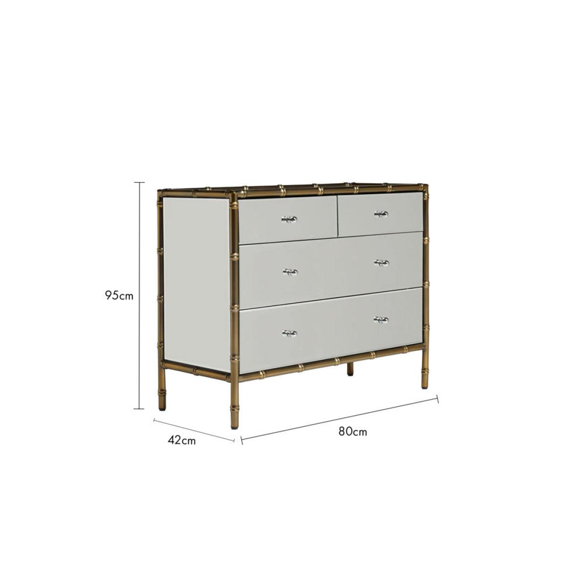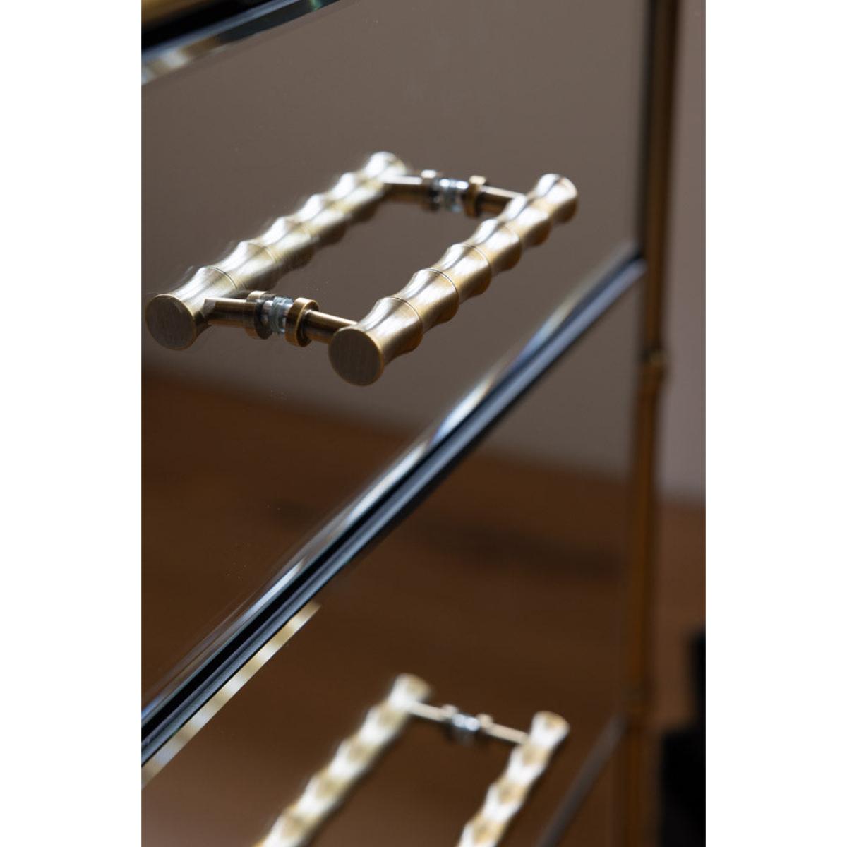 <!--td --> This fabulous chest-of-drawers is a modernist’s dream – the sleek lines and mirrored finish are the ultimate in contemporary chic, while this also taps into the metallics trend that’s been HUGE recently. This is a three-tier piece that features two large drawers bottom and middle, with two smaller ones at the top (only the best for your fancy pants and socks, after all). The bamboo detailing of the frame, which is echoed through the handles, is finished in a weathered bronze effect, giving this a touch of rustic appeal we love. This chest is a treat to behold as part of any interior decor theme, whether it’s sleek Scandi or bonkers maximalist. Style this elegant piece with as many or as few ornaments as your heart desires – go for verdant greenery, pretty trinket trays or photos of the people you love most in the world. Your home, your rules, after all! - Mirrored Bamboo Effect Chest Of Drawers- Material: MDF, Mirrored Glass, Metal - Measures: H95cm x W80cm x D42cm