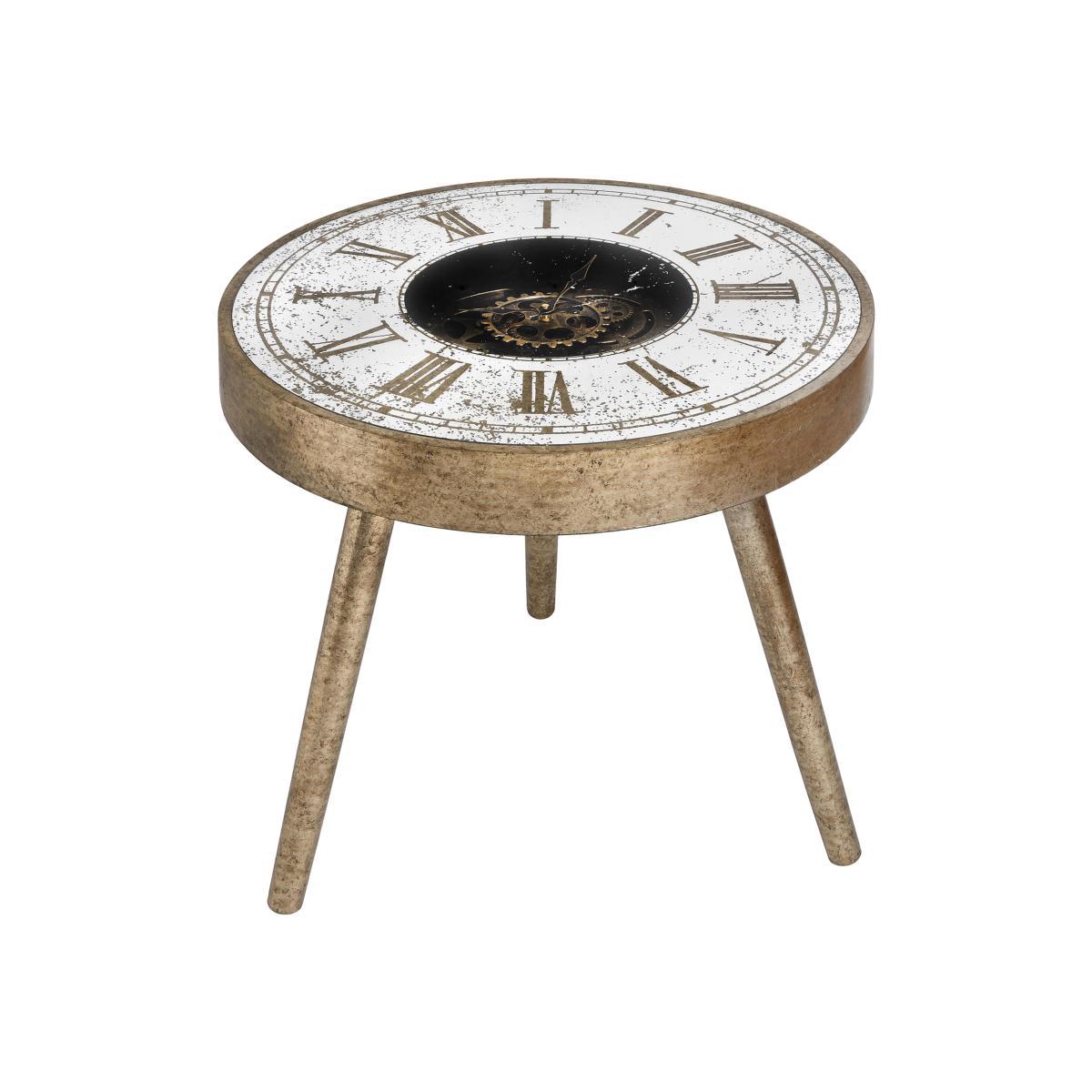 A thing of real beauty, this gorgeous clock table tells the time thanks to the exposed moving clock mechanism at its heart. With a mirrored glass surround and gorgeous gold detailing. Why you’ll love it. This stunning mirrored side table looks beautiful, and tells the time. Unusual, highly decorative style. With an exquisite working clock mechanism at its centre. Mirrored glass and glass top with gold Roman numerals. Gold finished wooden frame and legs. What you need to know. Pine and MDF frame. Mirrored glass top. Metal clock mechanism. Three tapered pine legs, with a gold finish. Dimensions. Width: 60cm (24 inches). Depth: 60cm (24 inches). Height: 55cm (22 inches).