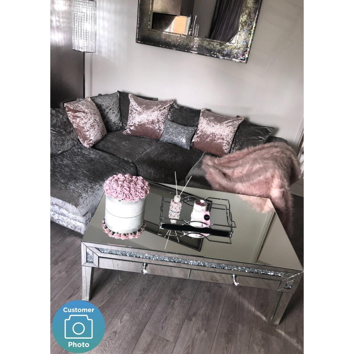 Features we love Add a stylish Gatsby twist to a modern home. The crushed diamond effect makes your room sparkle with uttermost elegance. Glamourous fully mirrored finish create an illusion of space and is instantly eye catching. Two drawers with crystal style handles - perfect for storing those living room essentials. Matching pieces available in the Jade Boutique collection All about me. Make an elegant statement with this luxurious Jade Boutique coffee table. It's a truly exquisite piece of furniture that's immediately striking thanks to its glamorous mirrored finish and inlaid sections of glistening diamond like crystals encased behind glass. It has an incredible geometric practicality within its design and reminiscent of art deco it is timeless. Brightening even the darkest of rooms it reflects beautifully transforming your space into a lavish luxury haven. Store living room essentials in its two drawers each of which features an elegant crystal style handle. The large table top is perfect for holding that refreshing glass of wine along with your current novel of choice or fashion magazine. It'll look fabulous in the centre of your living space and it'll definitely make a lasting impression. There's little assembly it's simply a case of fixing the legs to the table top then all that's left to do is to unscrew the crystal handles from inside the drawers and screw them onto the drawer fronts!. Need to know. Overall dimensions. W120.5 x D72.5 x H47 cm Each internal drawer dimension. W45.3 x D37.5 x H5 cm Colour. Silver Finish. Mirror crushed mock diamond and painted black (inside) Material. Wood construction metal runners mirror crushed mock diamond and crystal handles Assembly required. Yes.