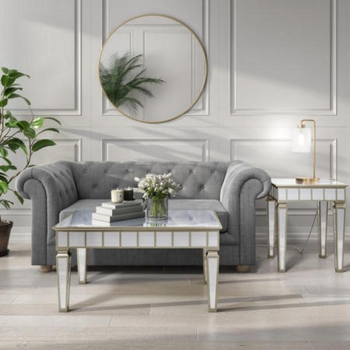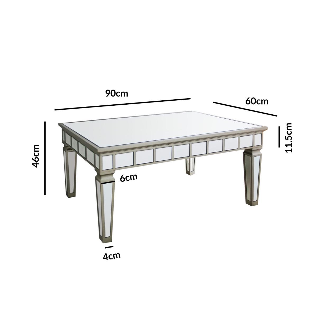 Features we love Add a stylish Gatsby twist to a contemporary home Sophisticated mirrored panels are instantly striking. Gold champagne detailing adds a luxurious feel. Tapered legs create an illusion of space. Matching pieces available All about me. Make a glamourous statement with this Jade Boutique coffee table. It's immediately striking thanks to the fully mirrored finish and contrasting champagne detailing. It reflects beautifully transforming your space into a lavish luxury haven and it'll look fabulous taking centre stage in your living room. Its spacious top is perfect for holding a refreshing glass of wine your current novel of choice or after-dinner coffees as you plan your next soiree. A little self-assembly is required; there are just the legs to secure in place. Need to know. Overall dimensions. W90 x D60 x H46 cm Colour. Silver Finish. Mirror Material. MDF construction and glass mirror Assembly required. Yes.