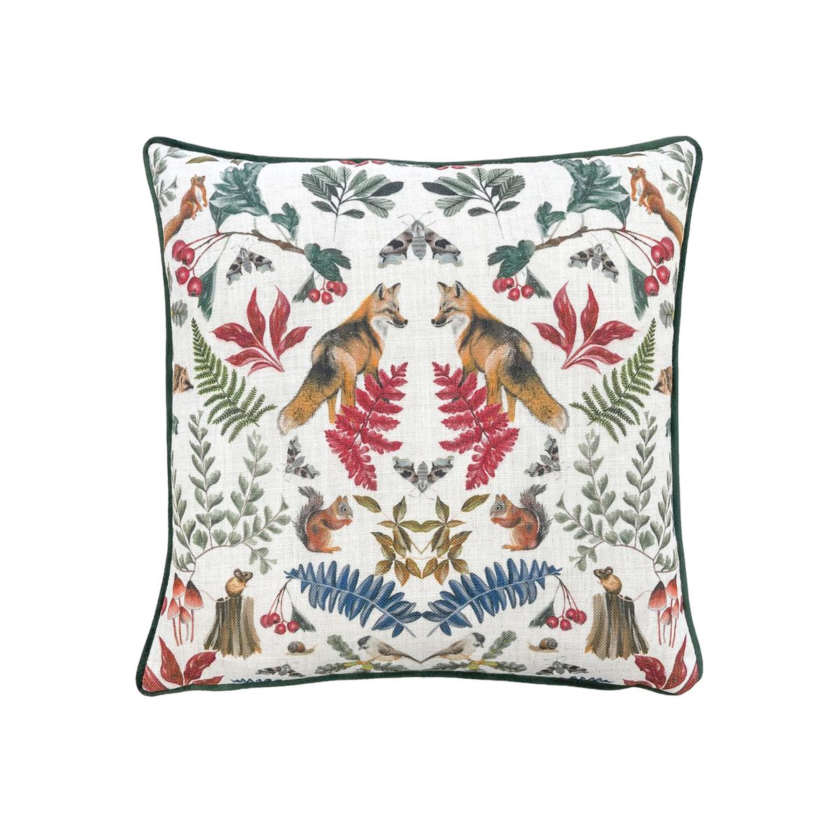A beautifully designed cushion showcasing the best of British wildlife. The centrepiece is the two posing symmetrical foxes among winter foliage, accompanied by cute little red squirrels, mice and birds. These hand-painted watercolour images are printed on soft poly-linen fabric, with a soft plain velvet reverse, contrast piped trim and zip fastening. A wonderful seasonal addition to your soft furnishings.