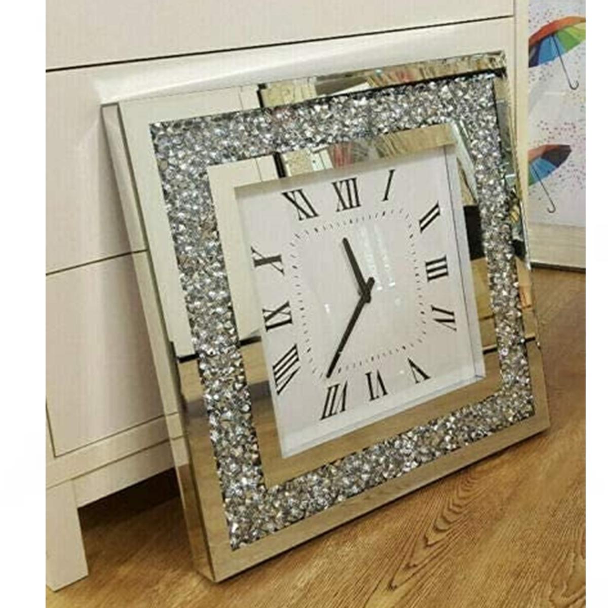 Decorated with a Crushed Crystal Effect, Mirrored Silver Frame. Bevelled Edge Mirror, Black hands and Roman numbers. 1 X AA battery required.