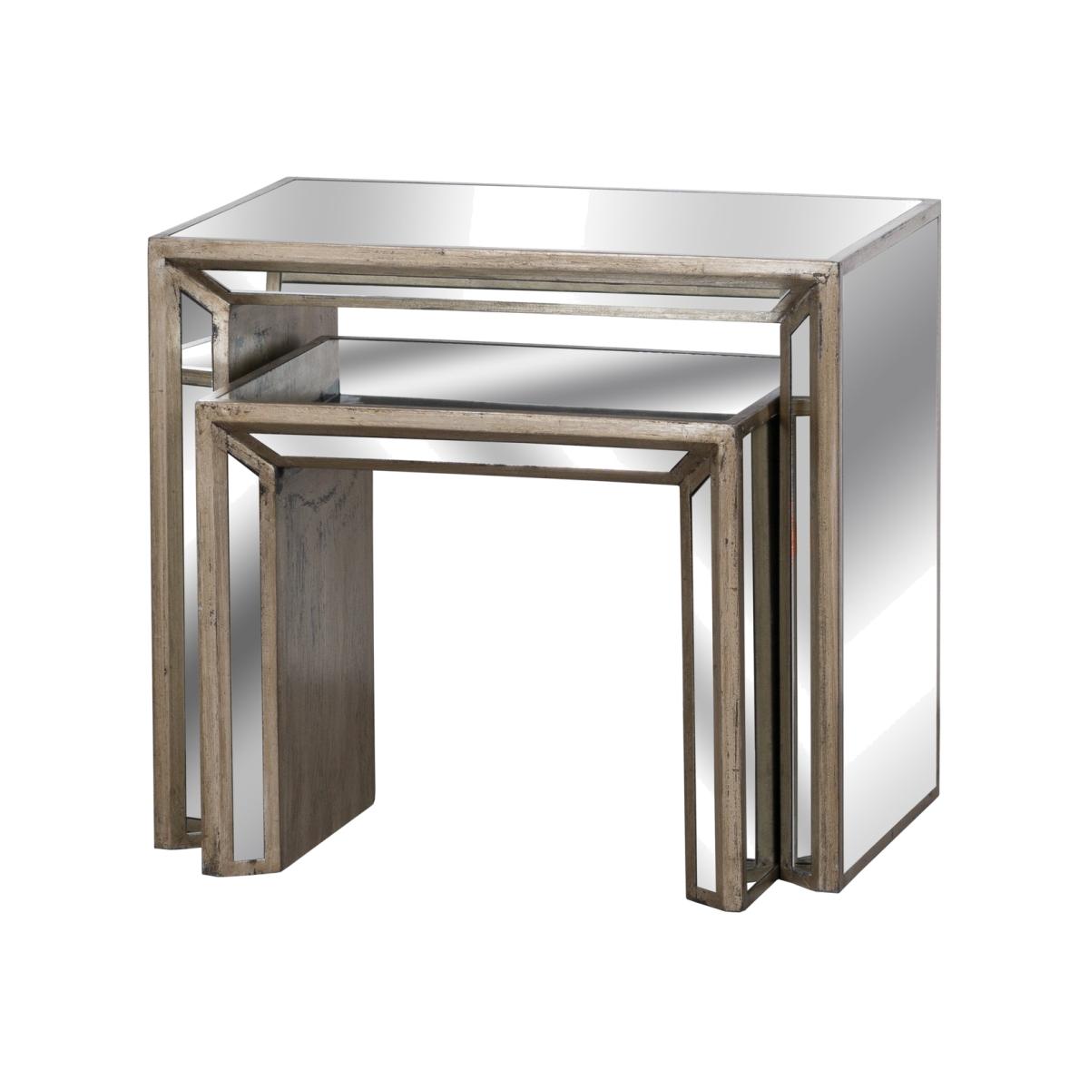 This set of two Augustus mirrored table's is an ideal piece for many spaces. Made from timer with a hand painted antique metallic finish. Featuring distressed glass panels. Designed to create an impact. Perfect for a modern contemporary interior space.