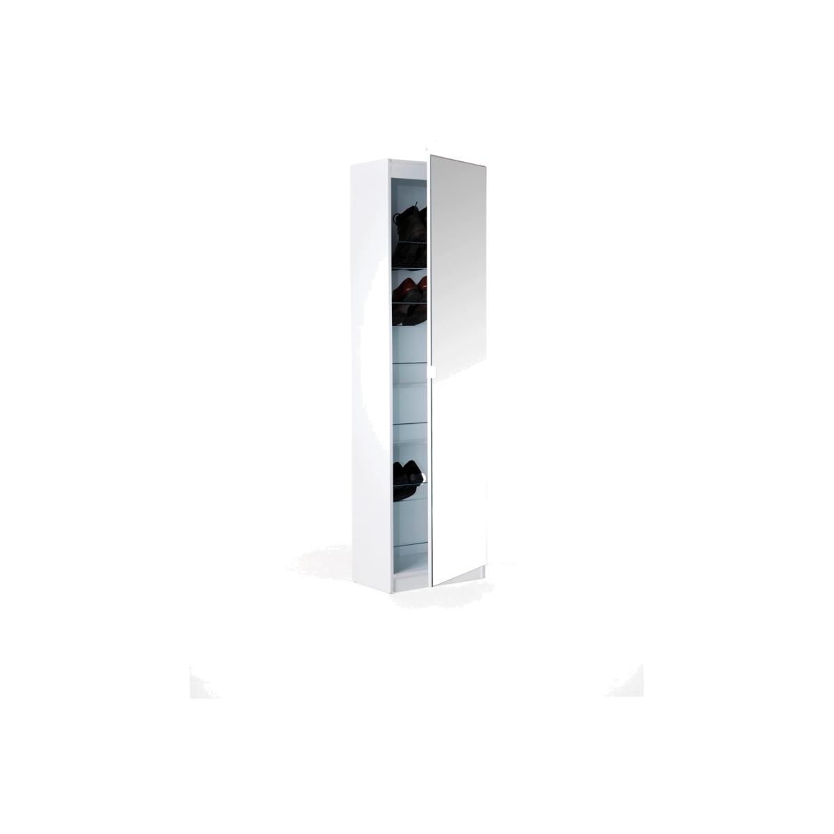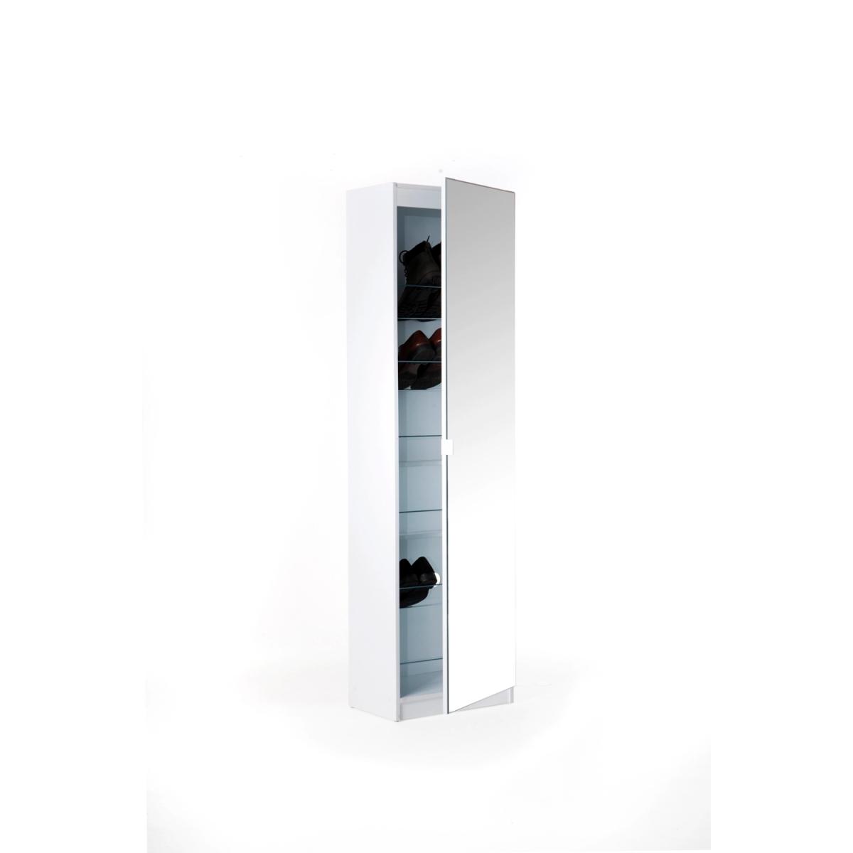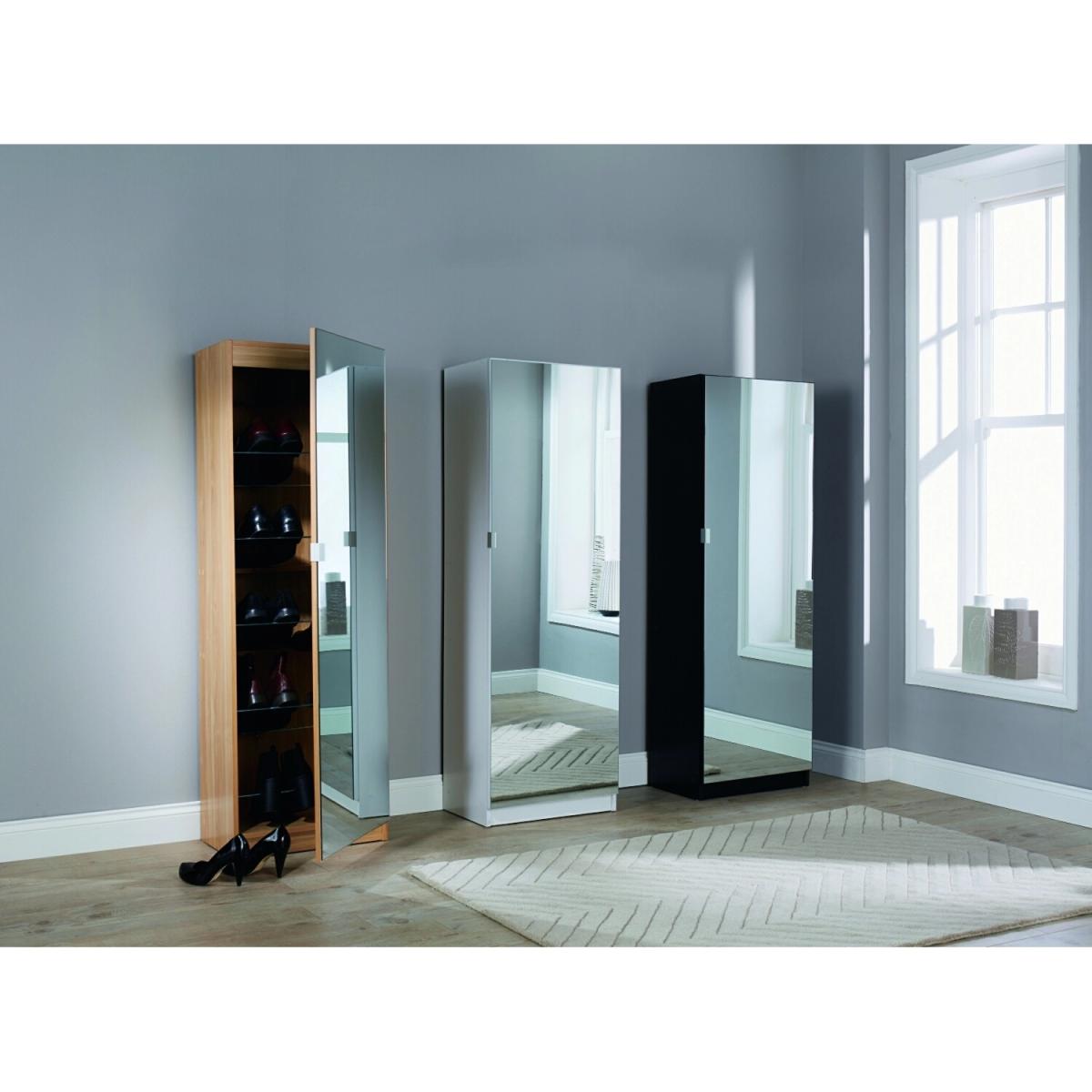This Mirrored Shoe Cabinet is the perfect shoe storage solution. It features a full length mirrored door and multiple internal poles to make it easy to store your shoes tidily. Stylish and practical, this will make untidy bedrooms a thing of the past. The cabinet opens to proudly display your shoes, allowing you to see them all and easily select a pair. When the door is closed they are all kept neatly out of sight until tomorrow. The sleek, modern design will look great in any room. Simple colours are combined with a practical full-length mirror on the front, reflecting light and giving the cabinet a spacious feel, as well as helping you to get ready in the morning. The piece is made from a quality, veneered particleboard, offering a sturdy and durable construction for a long-lasting addition in any room. The back panel incorporates four ventilation holes to allow air to circulate within the cabinet. The cabinet includes a bracket for fixing the unit to the wall for added safety (wall fixings not supplied). The cabinet will make untidy shoes a thing of the past and offer a touch of modern style to your home.