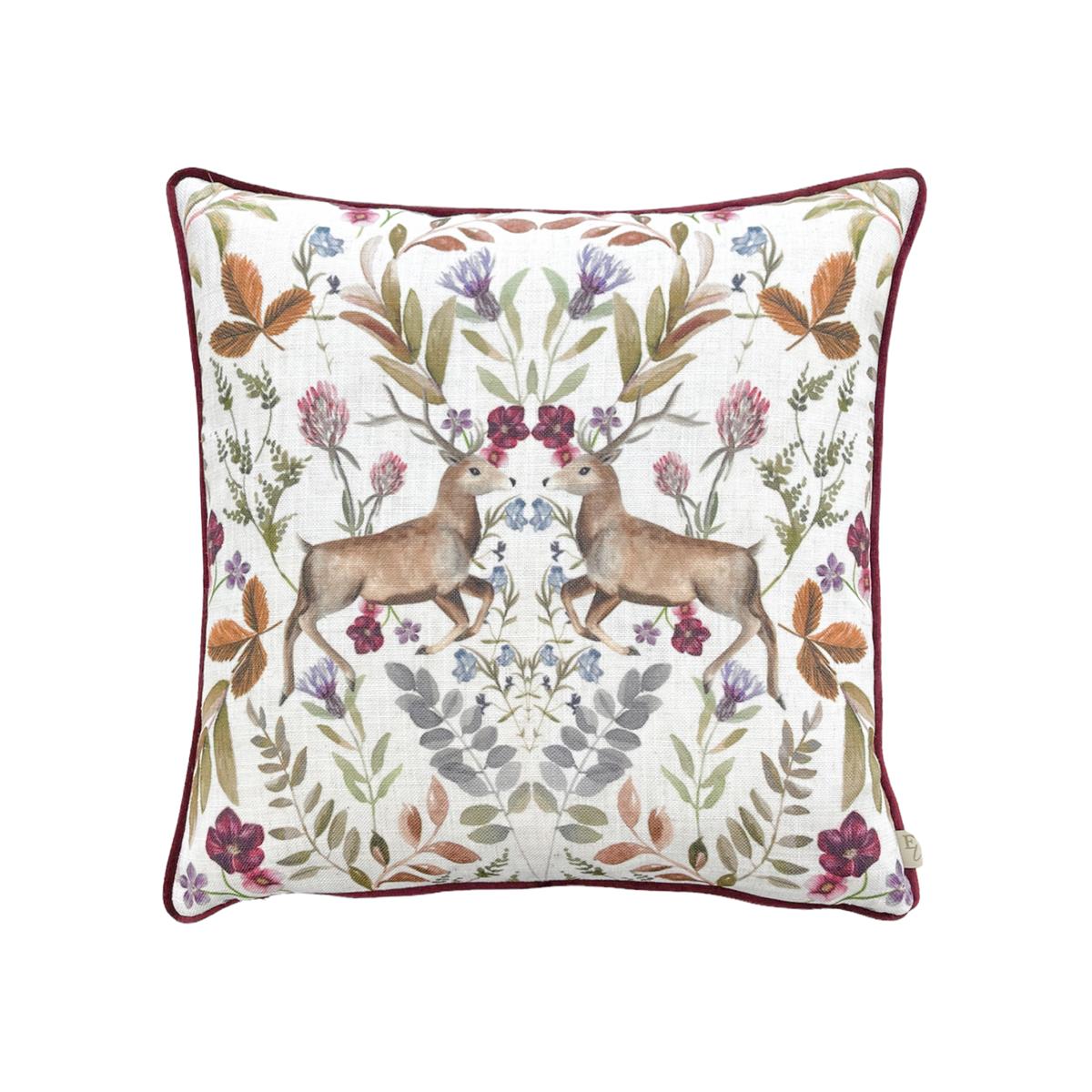 A charming cushion featuring two symmetrical posing stags among vibrant florals, set on a fresh white background. The hand-painted watercolour design is printed on poly-linen fabric, with a plush, plain dark red velvet reverse, contrasting piped trim and a zip fastening. Ideal for bringing a touch of British nature to your home furnishings.