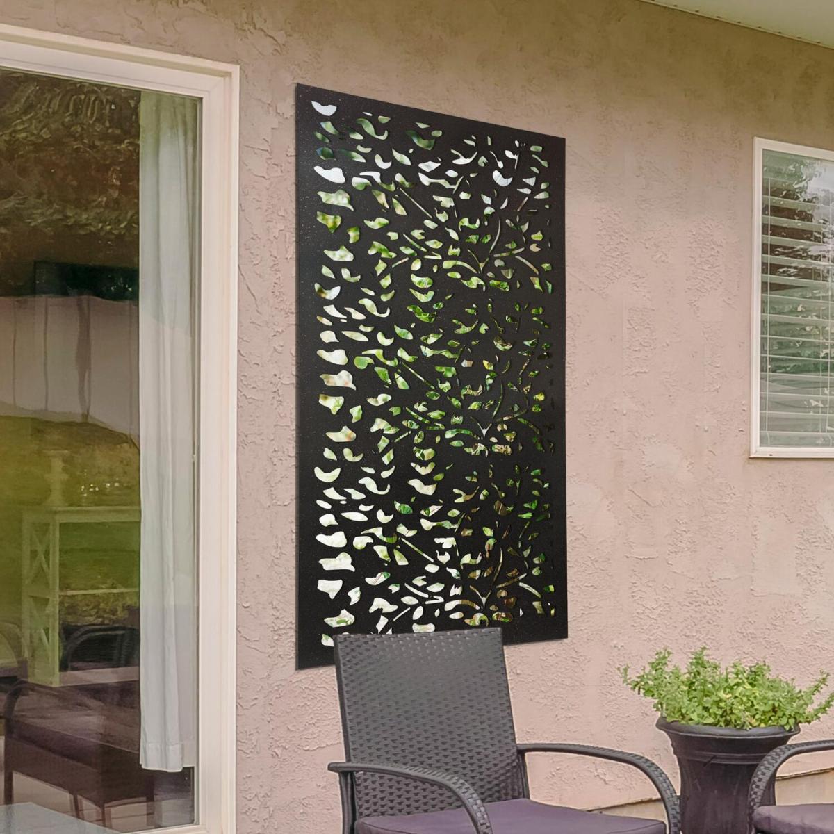Beautiful, New for this year Rectangular shaped Metal Garden / Interior Screen Mirror giving an impressive Leaf Effect. This Mirror Screen is pre-fitted with fixings ready to hand inside or outside. The Metal as per the images is rustic to give the authentic garden look. All you need to hang this to your chosen location is a secure fixing. The Screen Mirror measures 120cm X 60cm (almost 4ftx2ft). The Screen Mirror has a folded edge to sit approx 15mm in thickness and has a really impressive look. The Mirror is frost protected. This can be hung Portrait only.