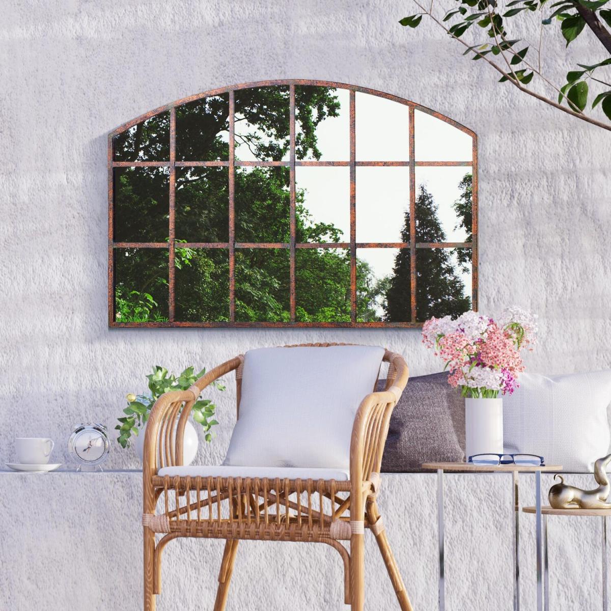 MirrorOutlet Arched shaped Metal garden Mirror gives a window effect. This mirror is pre-fitted with fixings ready to hand inside or outside. The Metal as per the images is rustic to give the authentic garden look and the mirror glass is frost protected. All you need to hang this to your chosen location is secure fixing. The Mirror measures 90cm X 56cm. The mirror glass is frost protected to enable the Mirror to stay outside all year long.