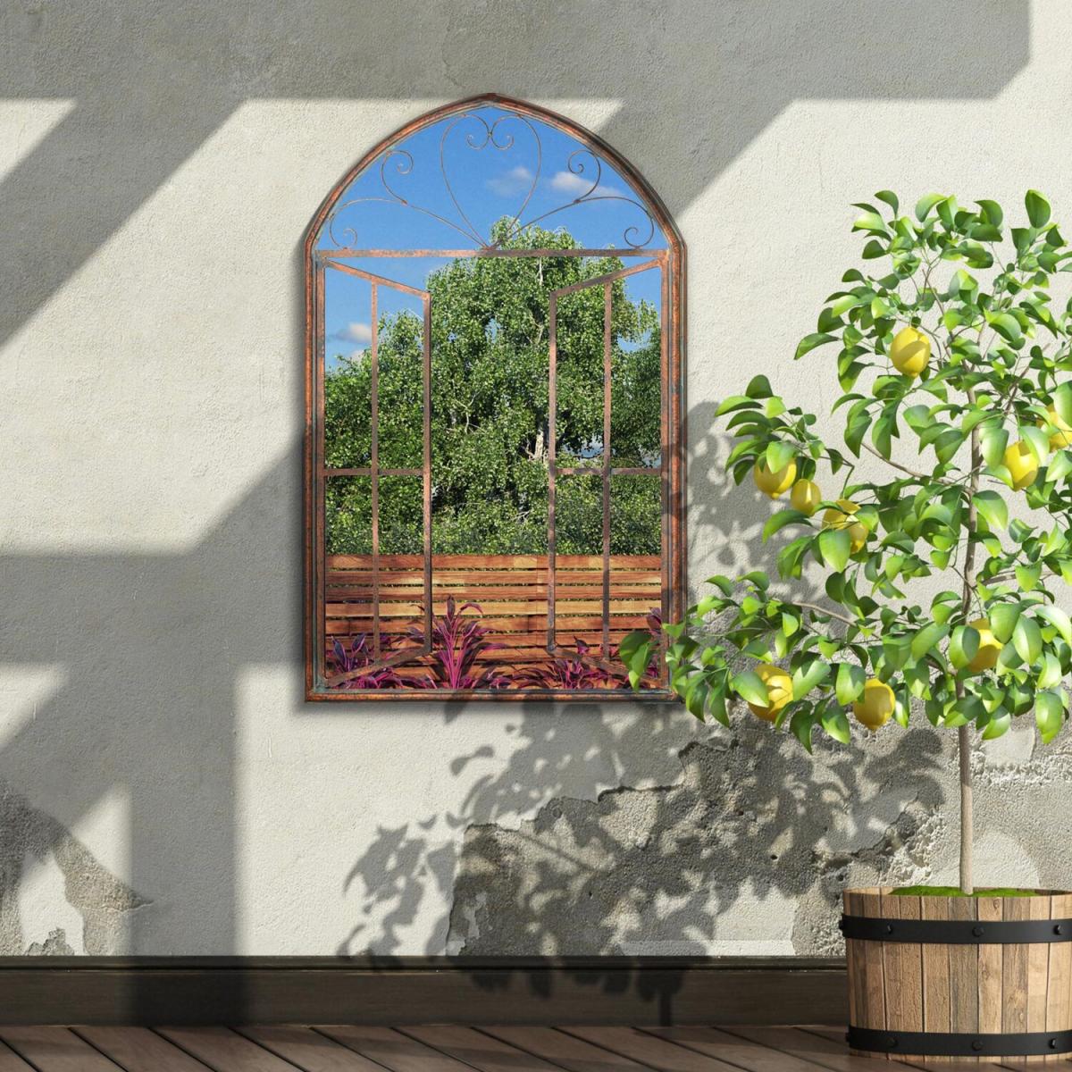 MirrorOutlet Arched shaped Metal garden Mirror gives a window effect. This mirror is pre-fitted with fixings ready to hand inside or outside. The Metal as per the images is rustic to give the authentic garden look and the mirror glass is frost protected. All you need to hang this to your chosen location is secure fixing. The Mirror measures 92cm X 61cm. The mirror glass is frost protected to enable the Mirror to stay outside all year long.