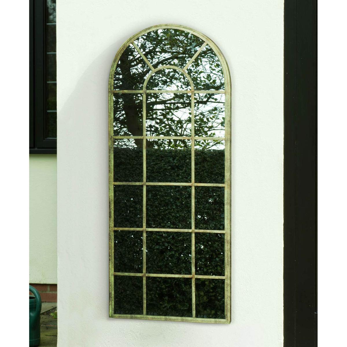 MirrorOutlet large rustic multi-panel effect garden wall mirror. This item has the classic look of a multi-paned window. This item is really well made and is frost protected to withstand all weather. This item is 4ft7 x 1ft10 140cm x 56cm.