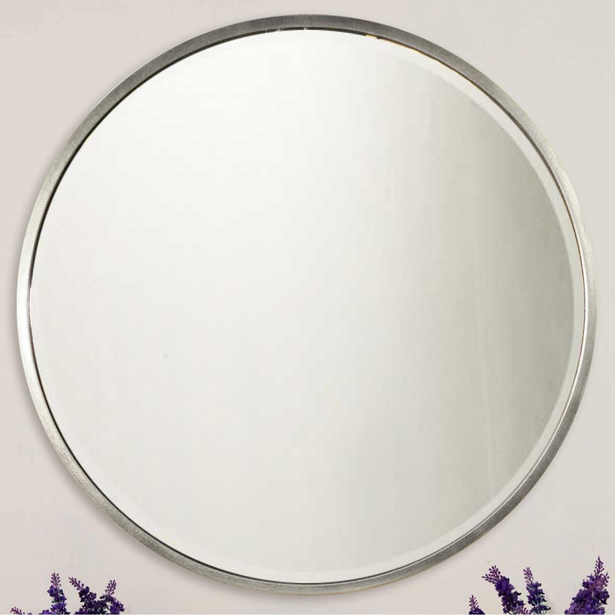 Large circular round wall mirror with a 2cm wide silver frame around a bevelled circular piece of glass. The overall size is 100cms x 100cm, 3ft3 x 3ft3 and a glass size of 94cms x 94cms. There are hanging lugs on the rear.
