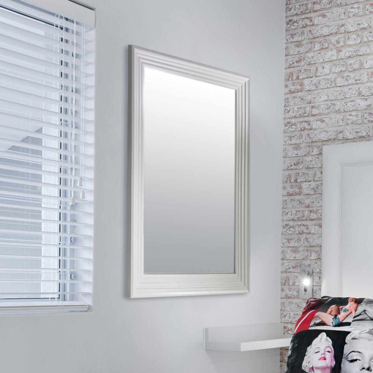 MirrorOutlet White Modern Framed Wall Mirror. Expect high-quality craftsmanship on a budget from Mirror. Outlet. This mirror is backed with hardboard to protect the mirror glass. The modern framed mirror has an impressive 31mm deep and hangs flush to the wall. The mirror includes hooks supplied loose so you can hang either landscape or portrait. Overall mirror size is 3ft6 X 2ft6 1060 X 756mm.