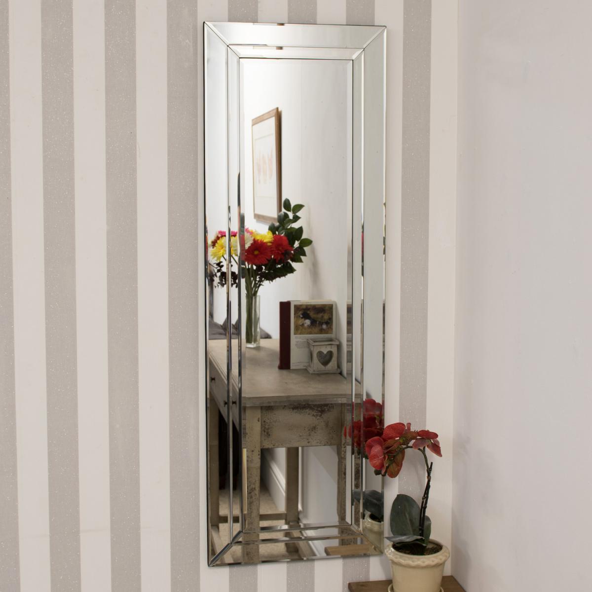 Stunning silver double-edged Venetian mirror with premium glass to the edges. This mirror boasts high-quality mitred corners on the outside with a mirrored inner frame giving a real modern look to your home. This mirror has an overall size of 3ft11 x 1ft4 120cm x 40cm and we also stock this mirror in three other sizes.