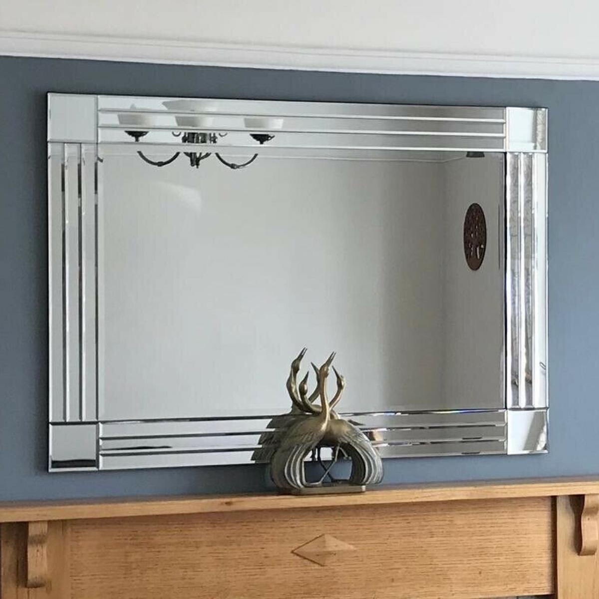 Silver triple bevelled edge Venetian mirror With a triple silver outline and bevelled glass this mirror brings any room alive with its modern design and will be a real focal point for your home. This has an overall size of 2ft4 x 3ft4 70cm x 100cm and can be hung either in landscape or portrait.