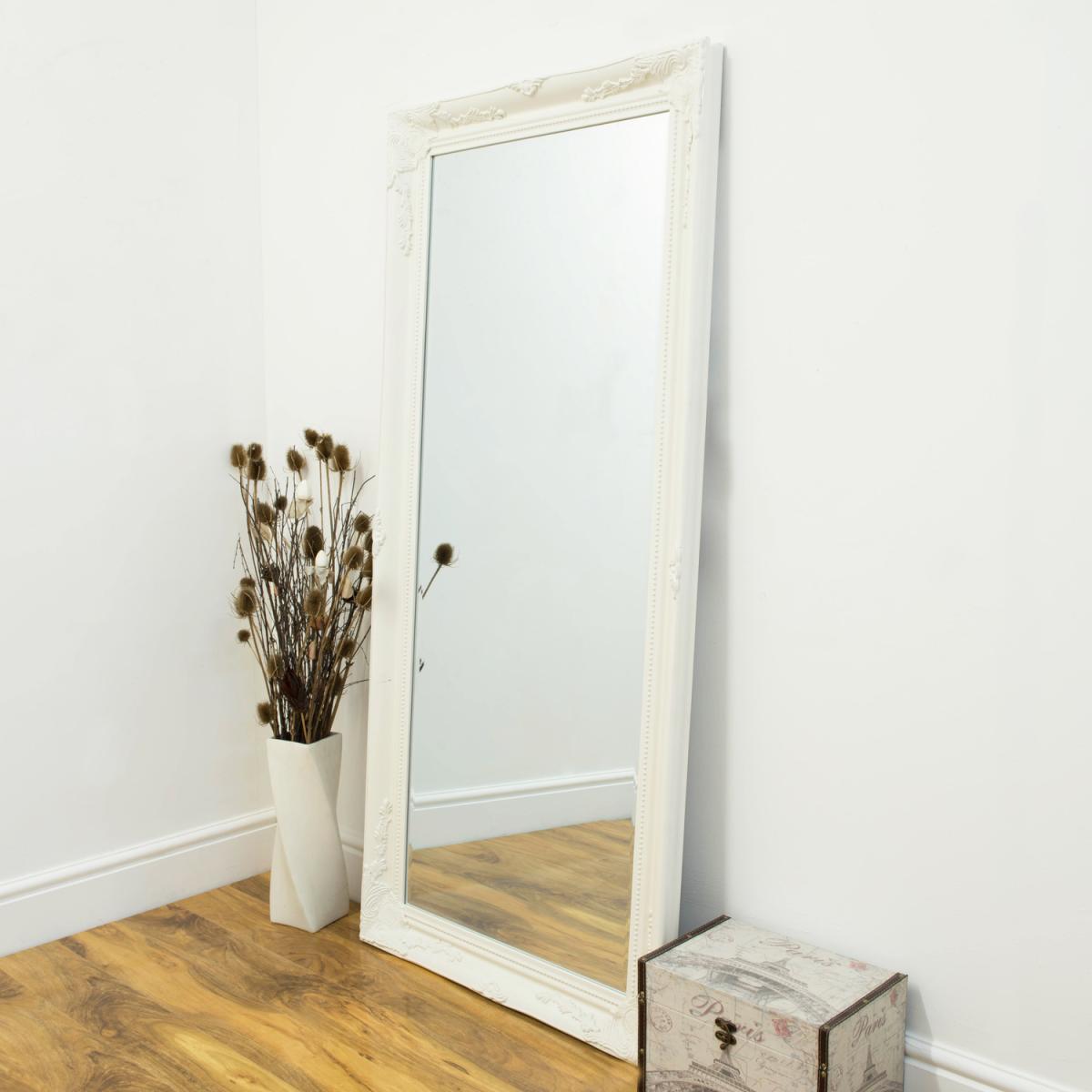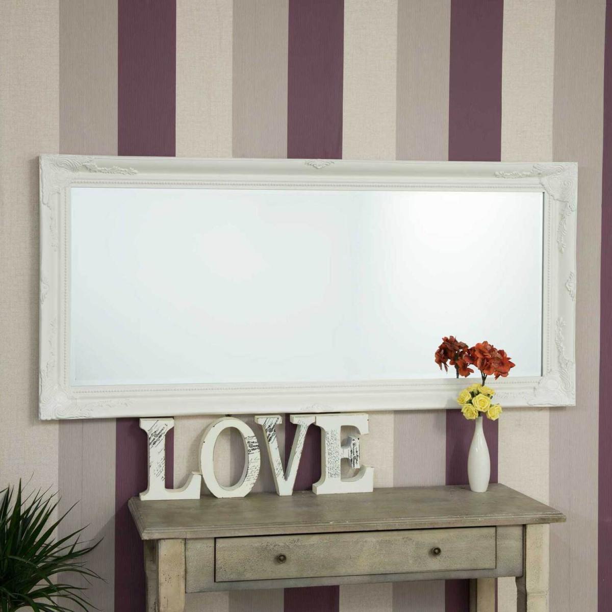 MirrorOutlet large classic white hand-finished French style frame. The design boasts ornate detailing on all four corners and sides. The mirror glass itself comes bevelled. This mirror has a glass size of 5ft x 2ft 152cm x 61cm and has an overall size of 5ft7 x 2ftt7 170cm x 79cm.