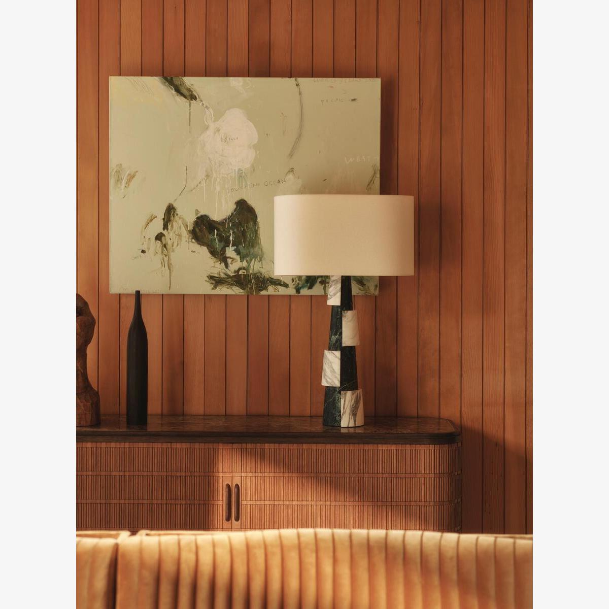 The tiered base of this table lamp is made from stacked, half moon-shaped marble sections. Topped with an oval shade, the Misha table lamp is formed from alternating sections of midnight green and Arabescato marble. A diffuser function allows you to brighten or soften the light.