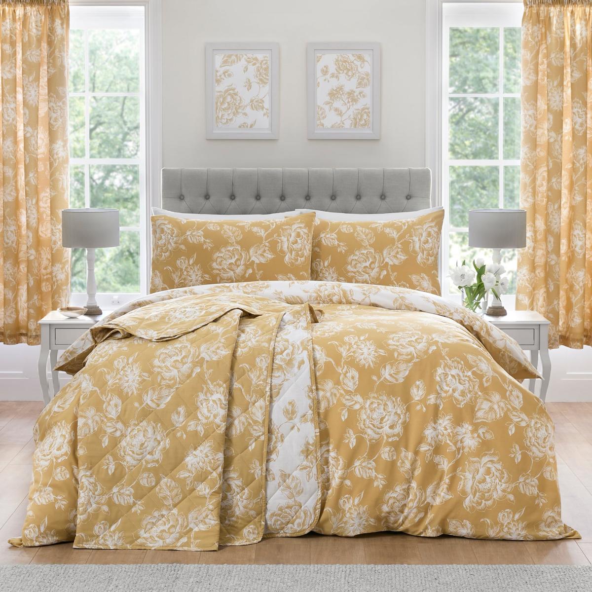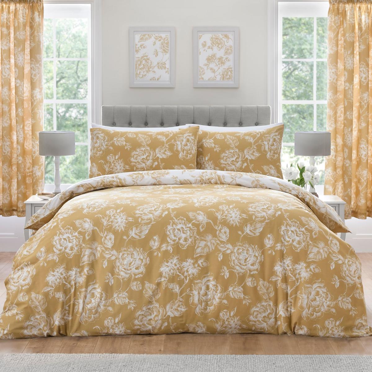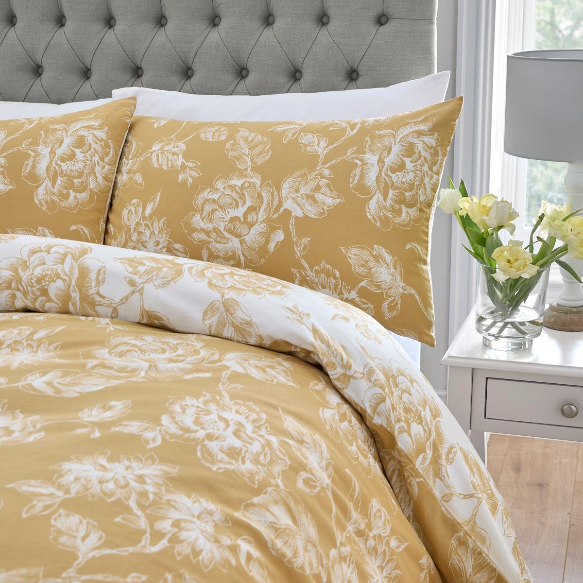 * Soft and durable polycotton Composition* Bold floral Design* Includes standard pillowcase(s)* Popper closure* Machine washable Indulge in opulence and grace with our Mishka Duvet Cover Set. This set, made from a soft and durable polycotton blend, features a bold floral design that captivates the eye. The large white classic floral print on a contrasting gold background adds a touch of elegance to your bedroom. The reverse side boasts the same captivating pattern in contrasting gold on a pristine white backdrop. With standard pillowcases included and a popper closure, this machine washable set offers both elegance and ease of maintenance, elevating your sanctuary with its luxurious fabric and intricate pattern. This collection is verified by OEKO-TEX and independently tested for harmful substances as well as manufactured using sustainable processes under socially responsible working conditions.