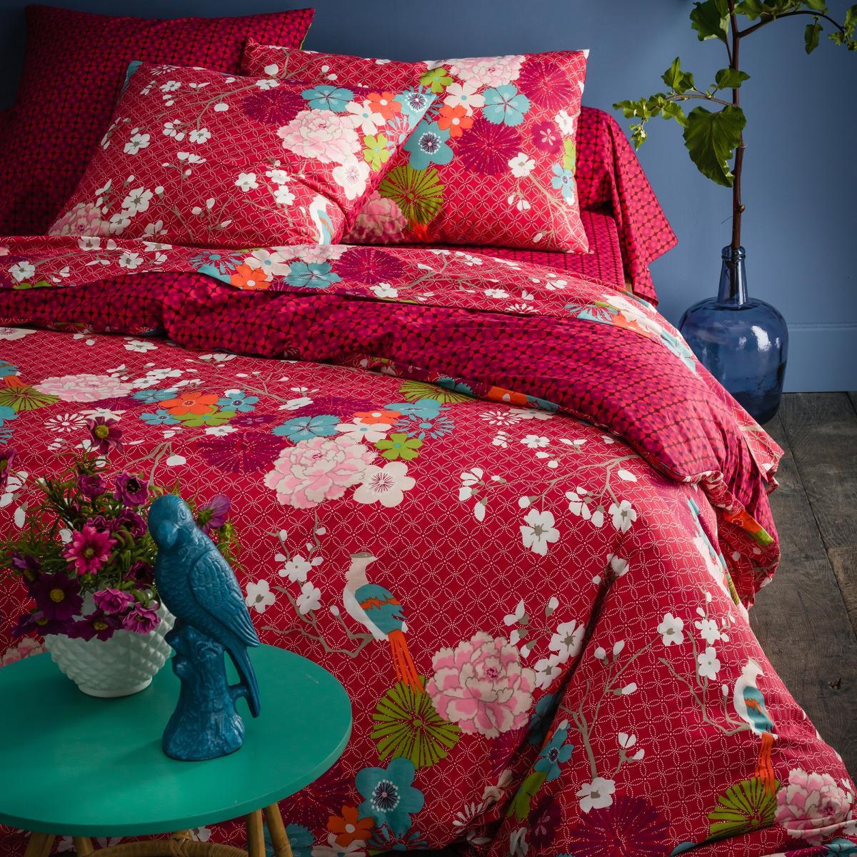 Miss China reversible pure cotton duvet cover, floral print on the front, small motif print on the back. A stunning combo of Japanese motifs and shimmering colours.