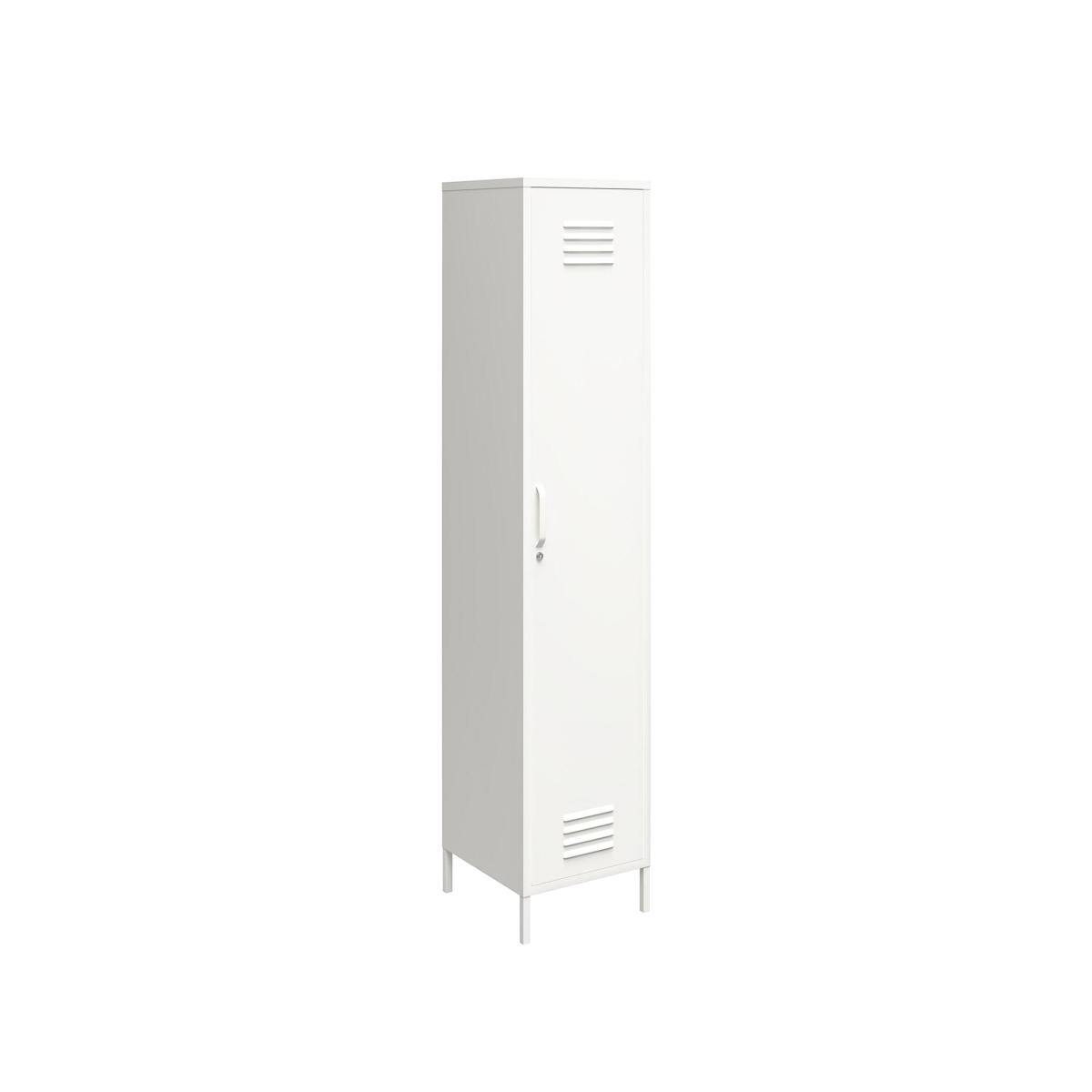Add valuable storage anywhere in your home with the Systembuild Evolution Mission District Single Metal Locker Storage Cabinet. Made of powder-coated metal, the black colour adds a clean, modern look to your storage solution. The metal can easily be cleaned with a damp cloth so you can store anything from cleaning supplies, pantry items, or extra throws and board games. The 4 shelves provide plenty of space for storage no matter where you need it. The door features a lock so you can keep chemicals out of the reach of children. A wall anchor kit is included to secure the Cabinet to the wall. The Cabinet ships flat to your door and requires assembly upon opening. Two adults are recommended to assemble.