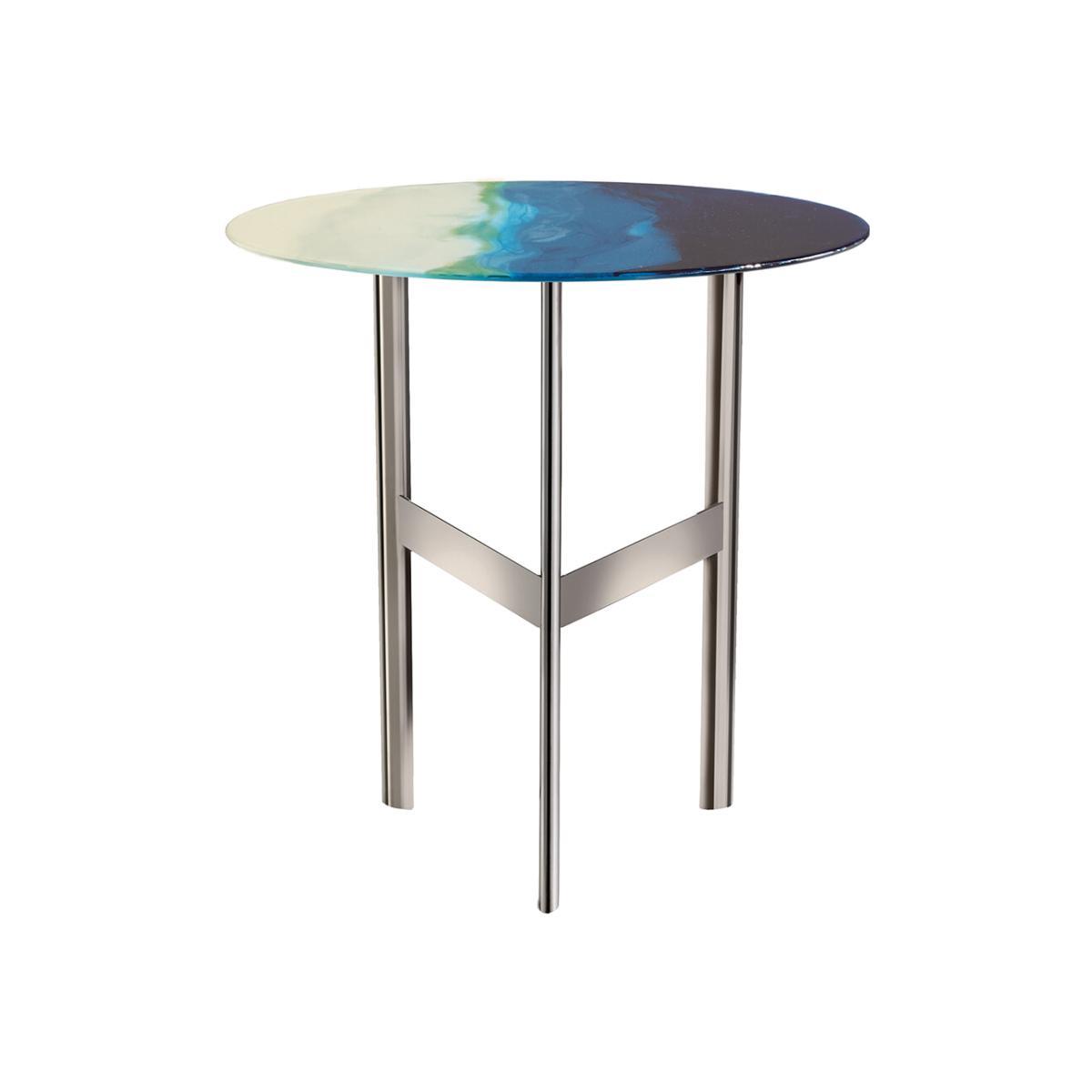 Create a captivating display in your interior with this Art side table from Missoni Home. Crafted from strong steel, it features a colourful marble-like design made from handmade resin works sealed beneath a glass tabletop. Key features: * Material: steel, tempered glass * Dimensions: Ø50xH50cm * Features a marble like design * Made from handmade resin works * In blue tones * With 3 steel legs * Made in Italy * Wipe clean with a damp cloth
