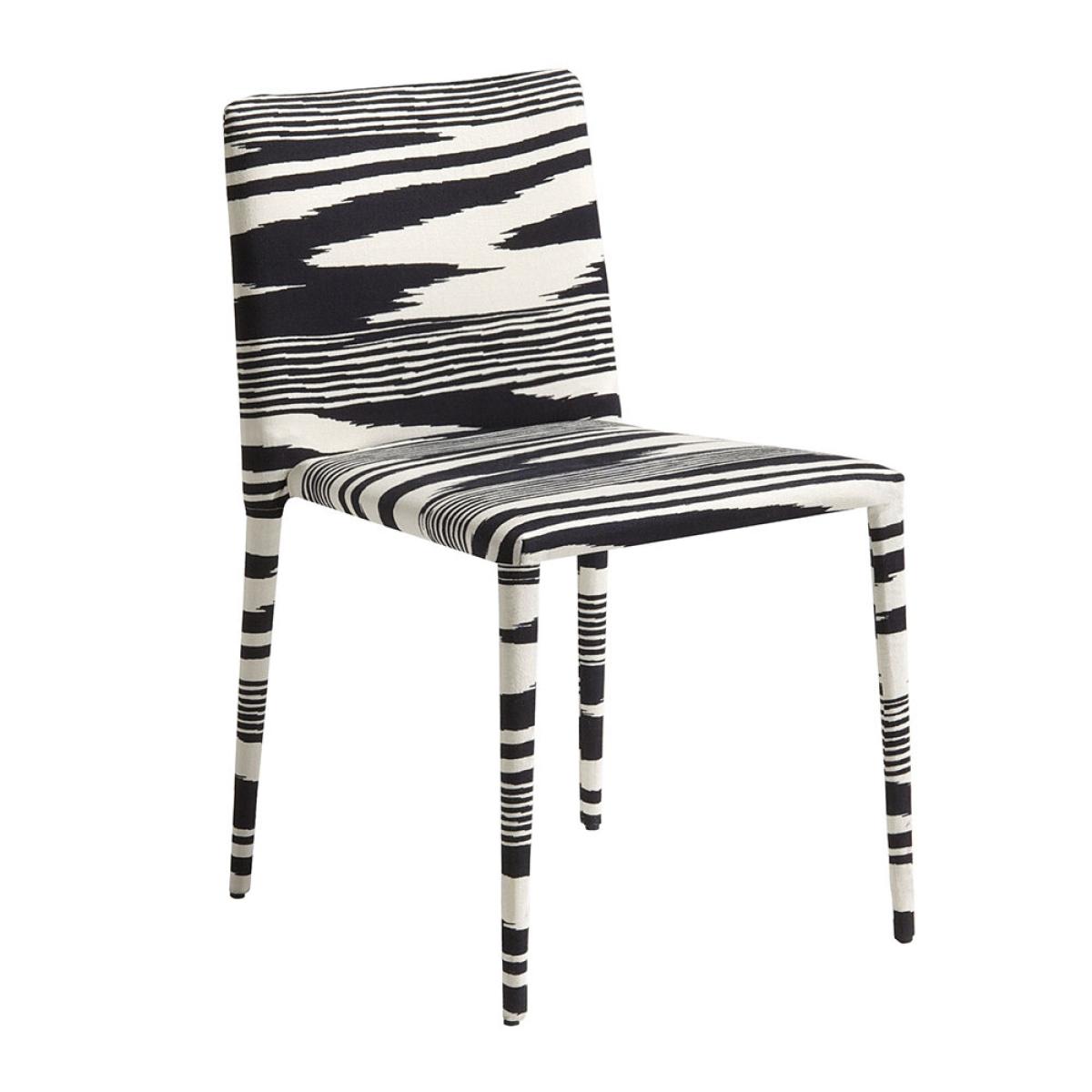 I love this chair for its bold, graphic print that adds a contemporary edge to any dining space. It works particularly well in modern or eclectic interiors, where it can serve as a statement piece. For styling, consider pairing it with neutral-toned tables and accessories to let the pattern really stand out, or mix with other black-and-white elements for a cohesive look. Practical tips include using it in less formal settings or as accent seating, since the fabric pattern creates visual interest but may be less suited to heavy, everyday use. Overall, it’s a fantastic choice for adding personality and a touch of designer flair to a dining area.