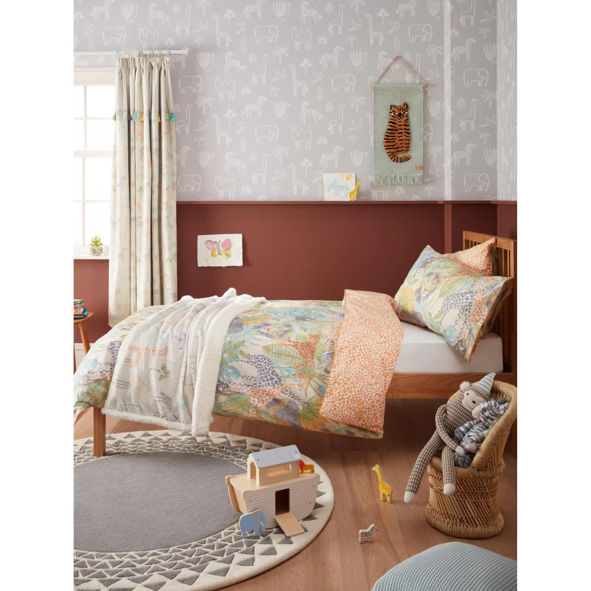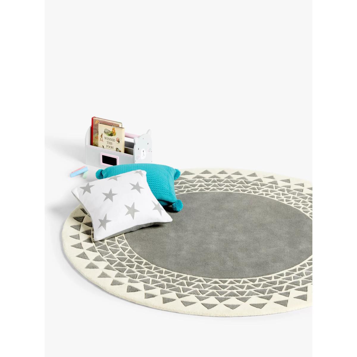 I love this kids’ rug for its versatile, modern take on traditional patterning. The grey colourway makes it an easy fit in a variety of nursery or children’s room schemes, especially those leaning towards Scandi or contemporary styles. Its geometric design adds visual interest without overwhelming the space, making it ideal for smaller rooms where you want a playful yet sleek focal point. Practical tips include layering it over a neutral or pastel-coloured floor, and adding simple furniture and soft textiles to keep the overall look balanced. It’s durable enough for high-traffic areas, and its size makes it perfect for defining a play zone or reading corner.