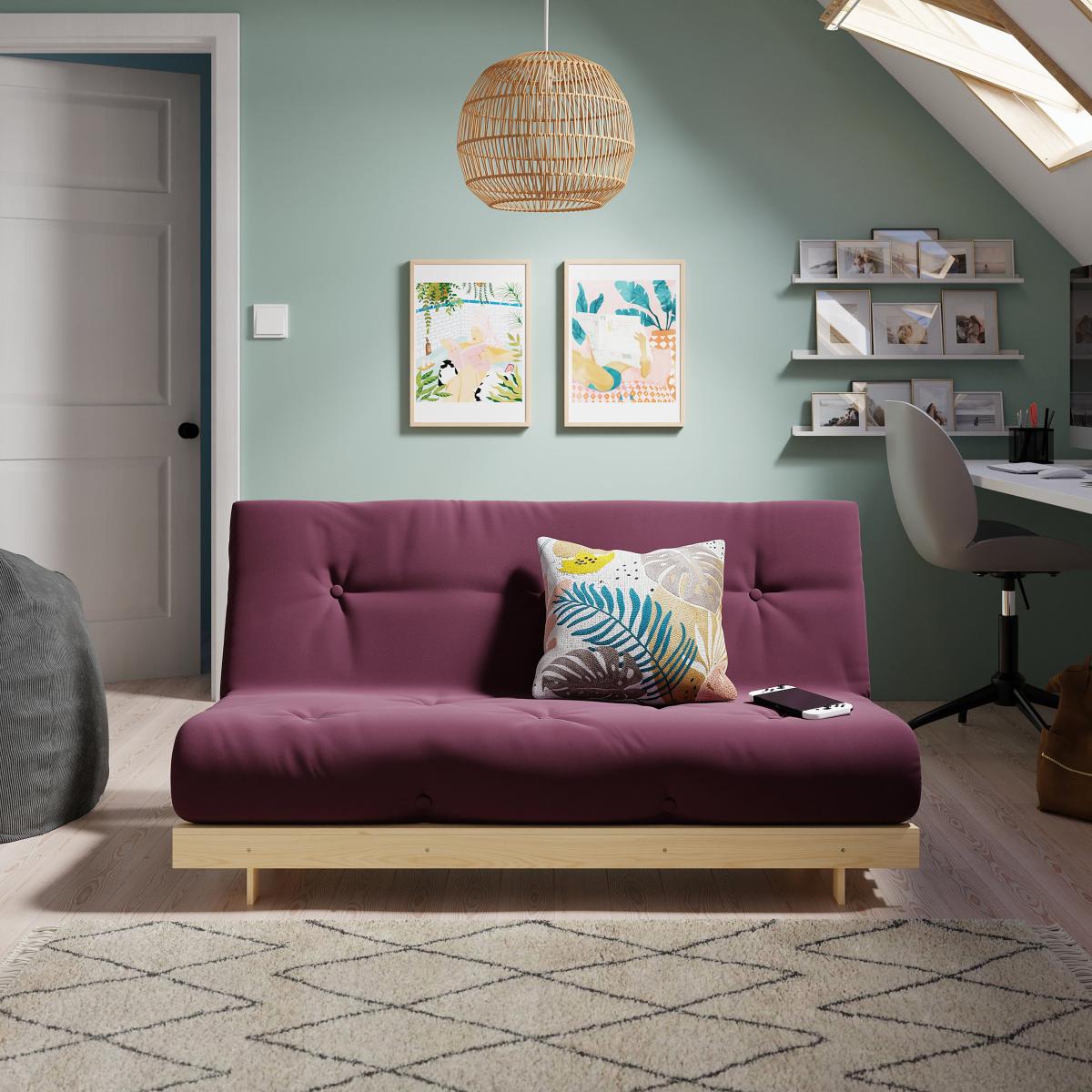 I love this sofa bed for its vibrant aubergine hue, which adds a bold yet versatile pop of colour to a variety of interiors. It works particularly well in modern or eclectic living spaces, where its sleek, clean lines can be complemented with textured textiles and patterned cushions. Practical styling tips include pairing it with neutral or pastel tones in nearby soft furnishings to let the colour stand out, or layering with natural fibres and organic shapes for a cosy, inviting feel. Its double futon format makes it perfect for guest rooms or multi-use spaces, offering both comfort and functionality without sacrificing style.