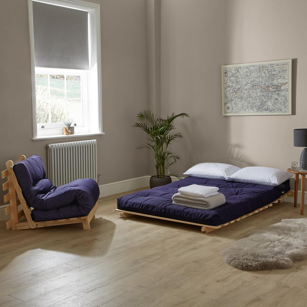 A handy, versatile futon for the modern home in a timeless design to complement any decor. The Mito Double Futon features a great space saving solution for where space is at a premium. This Futon folds out easily from a seat to a comfortable bed for guests. The Mito Double Futon is constructed from solid pine and comes complete with a quality fibre blend button design mattress. Open Bed Width: 135cm. Open Bed Depth: 195cm. Box 1: 142cm x 81cm x 20. 5cm (18kg). Box 2: 56cm x 137cm x 56cm (14 kg). Please note, unfortunately we cannot deliver this item to Northern Ireland or the Channel Islands. To check out our handy sizing guide to help you find out if you’ll be able to get your new furniture into your home.