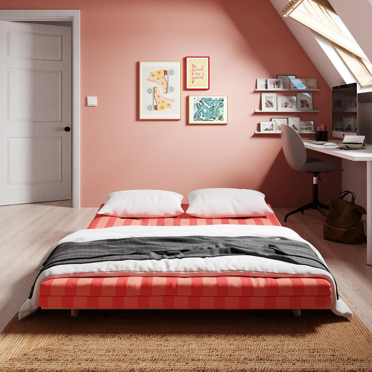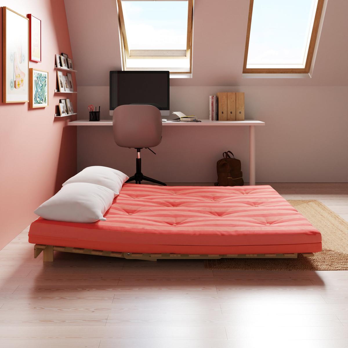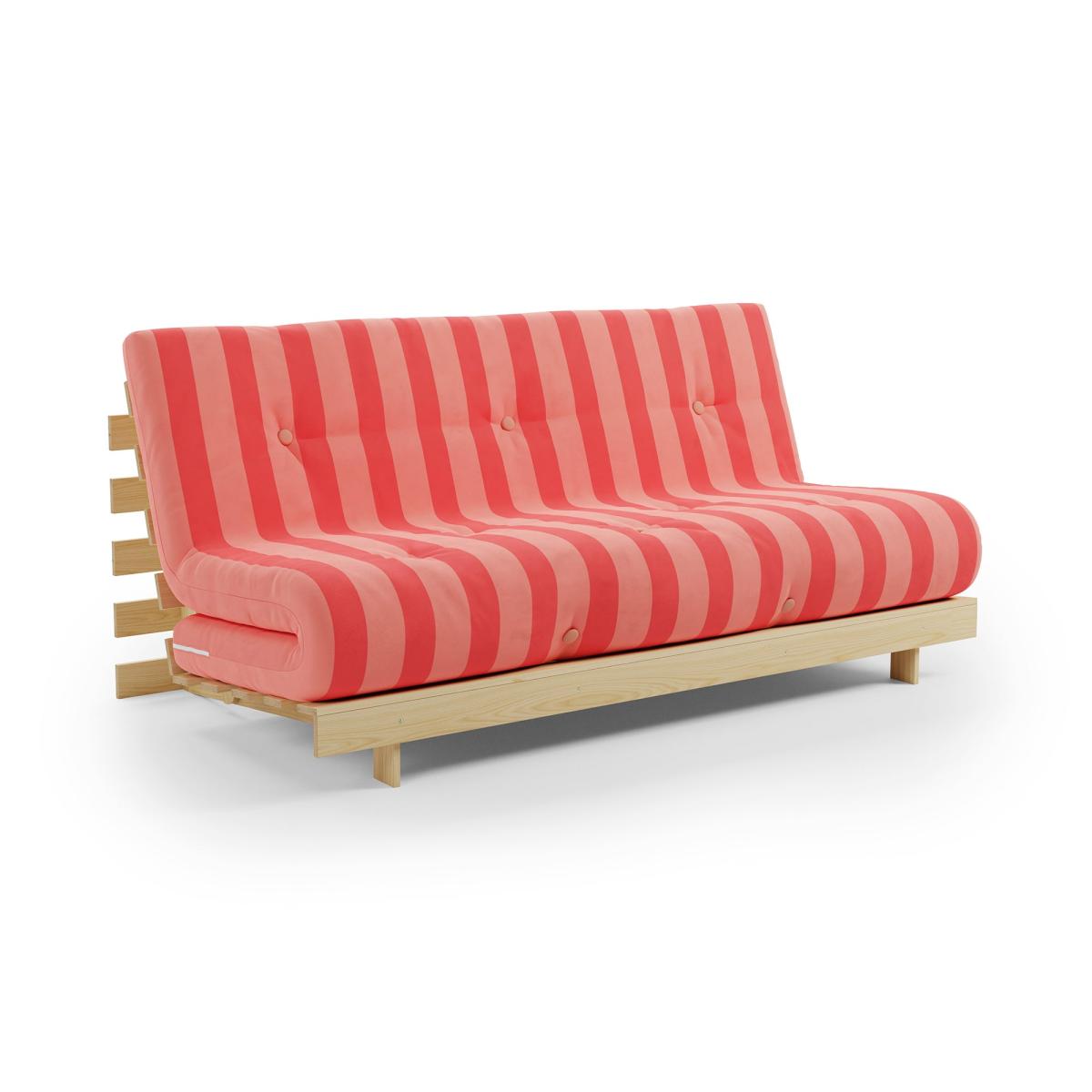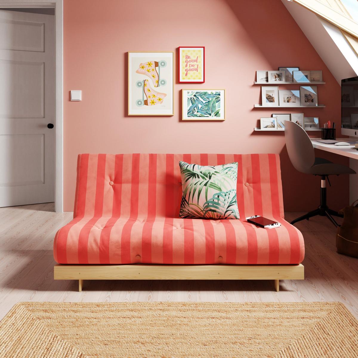 Crafted with quality and comfort in mind, this futon is made from 100% cotton, providing a soft and cosy surface for relaxation. This futon serves as a sofa bed, offering a convenient space-saving solution for those seeking both seating and an extra bed option. With its clever design, it effortlessly folds out from a seat to a comfortable bed for guests, allowing you to make the most of your living space without compromising on comfort or style. The futon features light wooden legs, adding a touch of elegance and stability to its overall design. The legs are constructed from solid pine, ensuring durability and long-lasting performance. What sets this futon apart is its modern update on a fun modern print. The eye-catching striped pattern injects personality and charm into any room, whether you need an extra sleeping space for overnight guests or simply desire a cosy spot to relax during the day, our double Futon provides the perfect solution. Its compact size makes it ideal for apartments, dorm rooms, or any space where versatility is key.