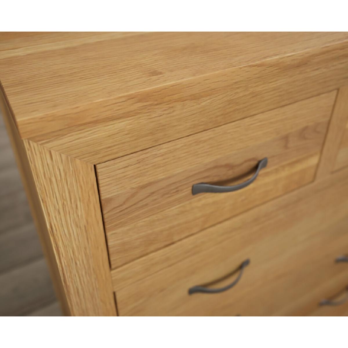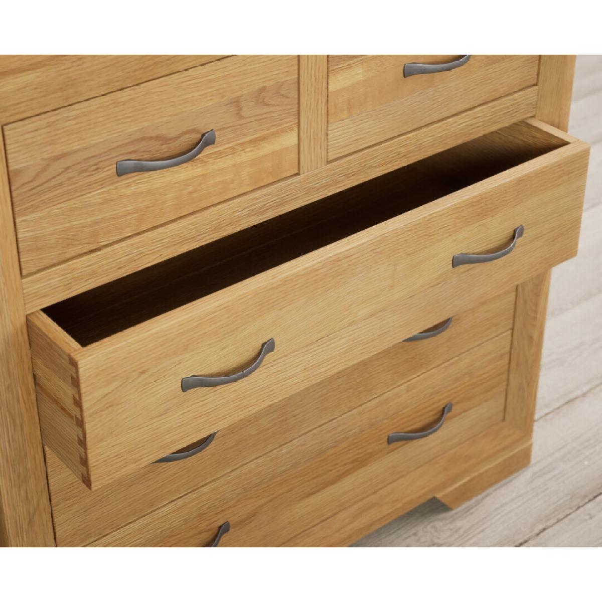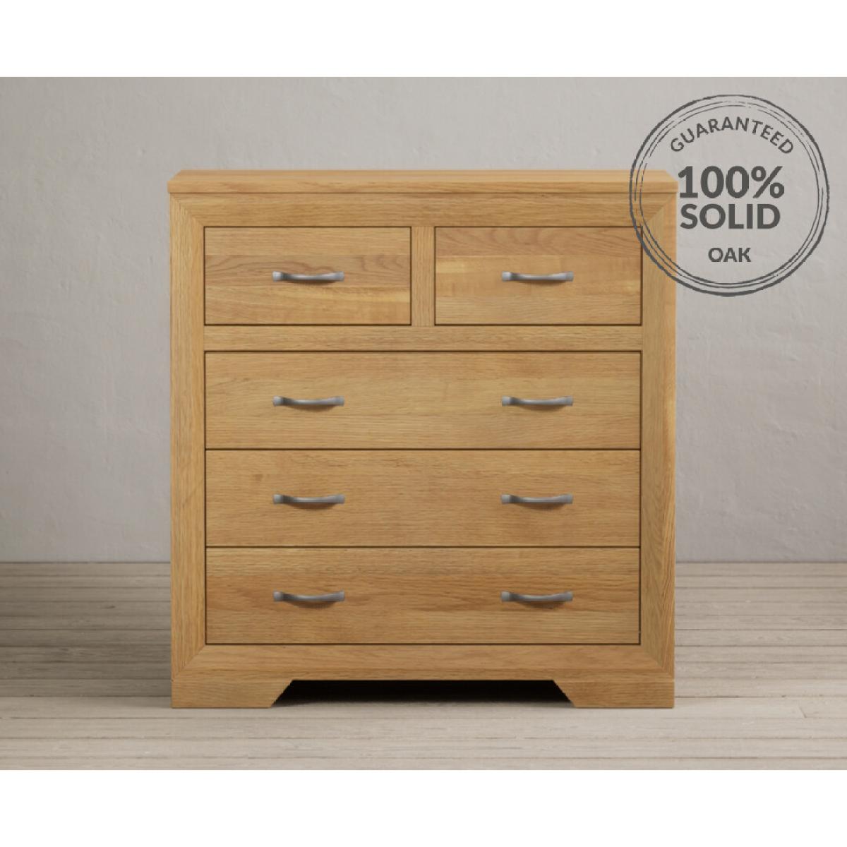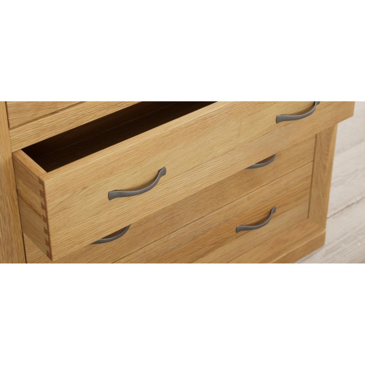 The Mitre Solid Oak 5 Drawer Chest is crafted from 100% solid oak with a natural finish and features five dovetail drawers with metal handles.