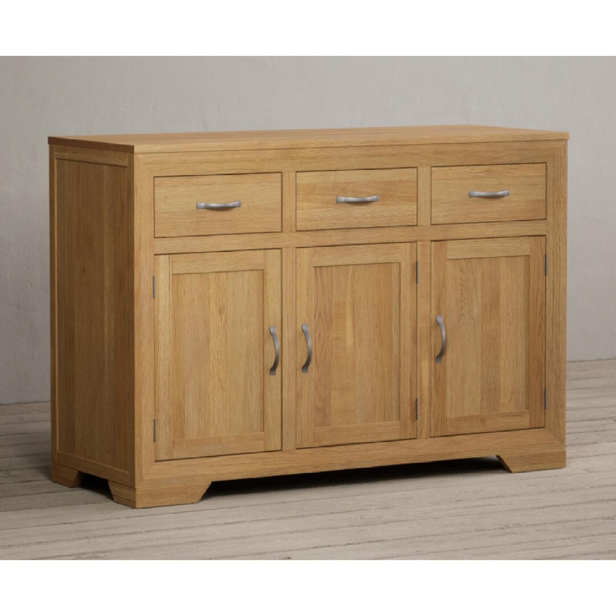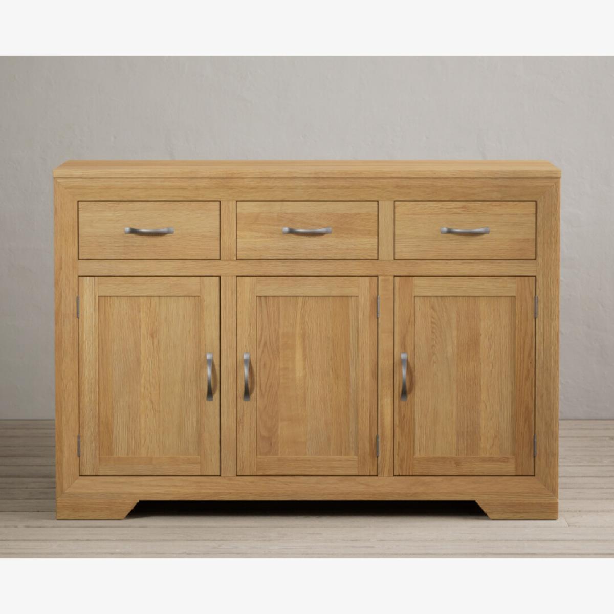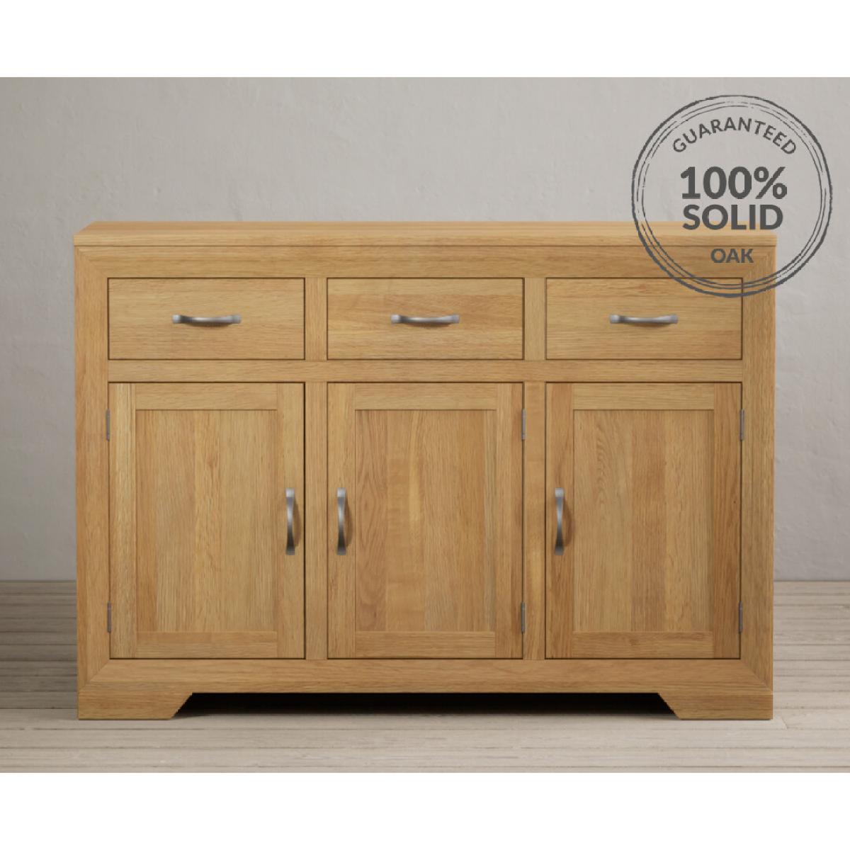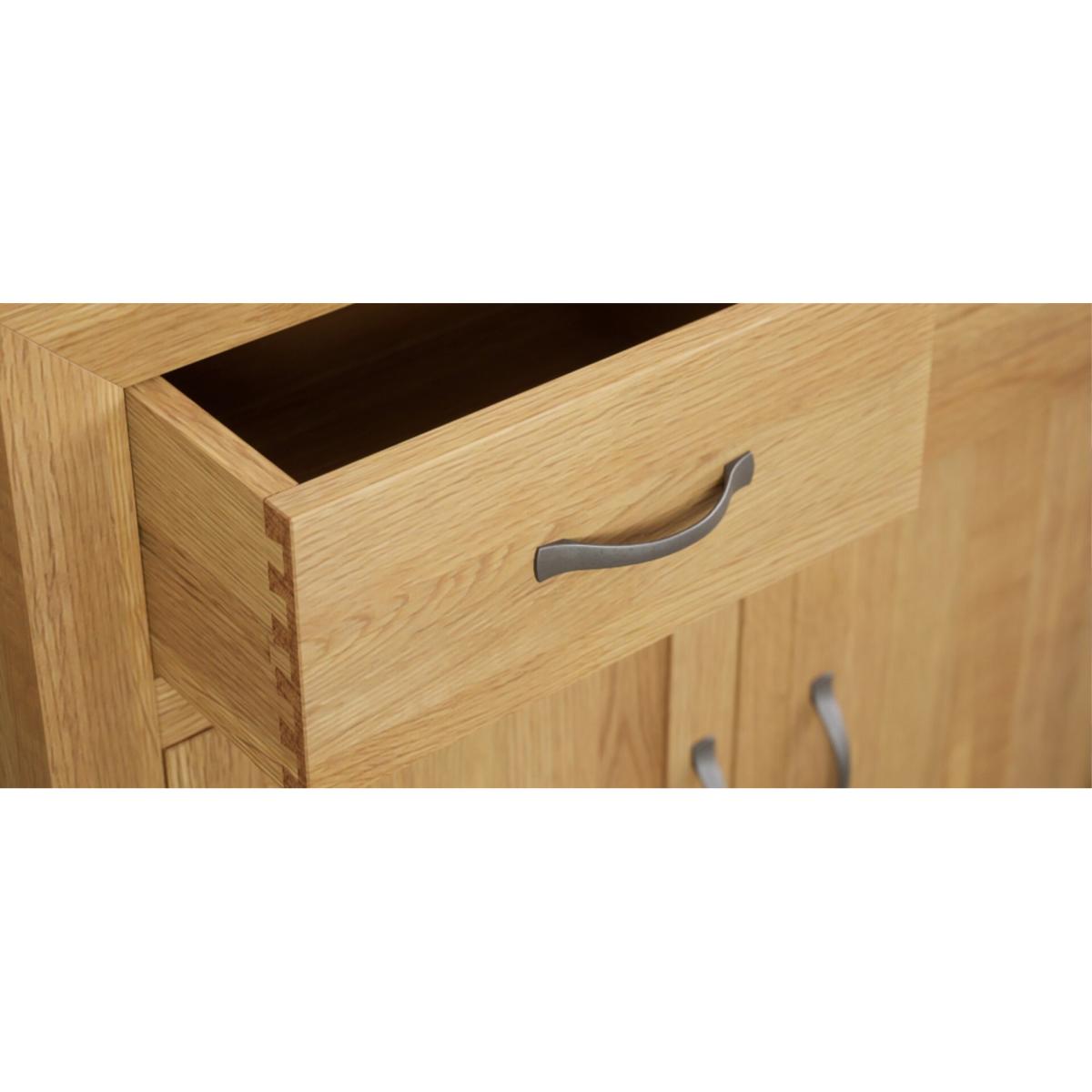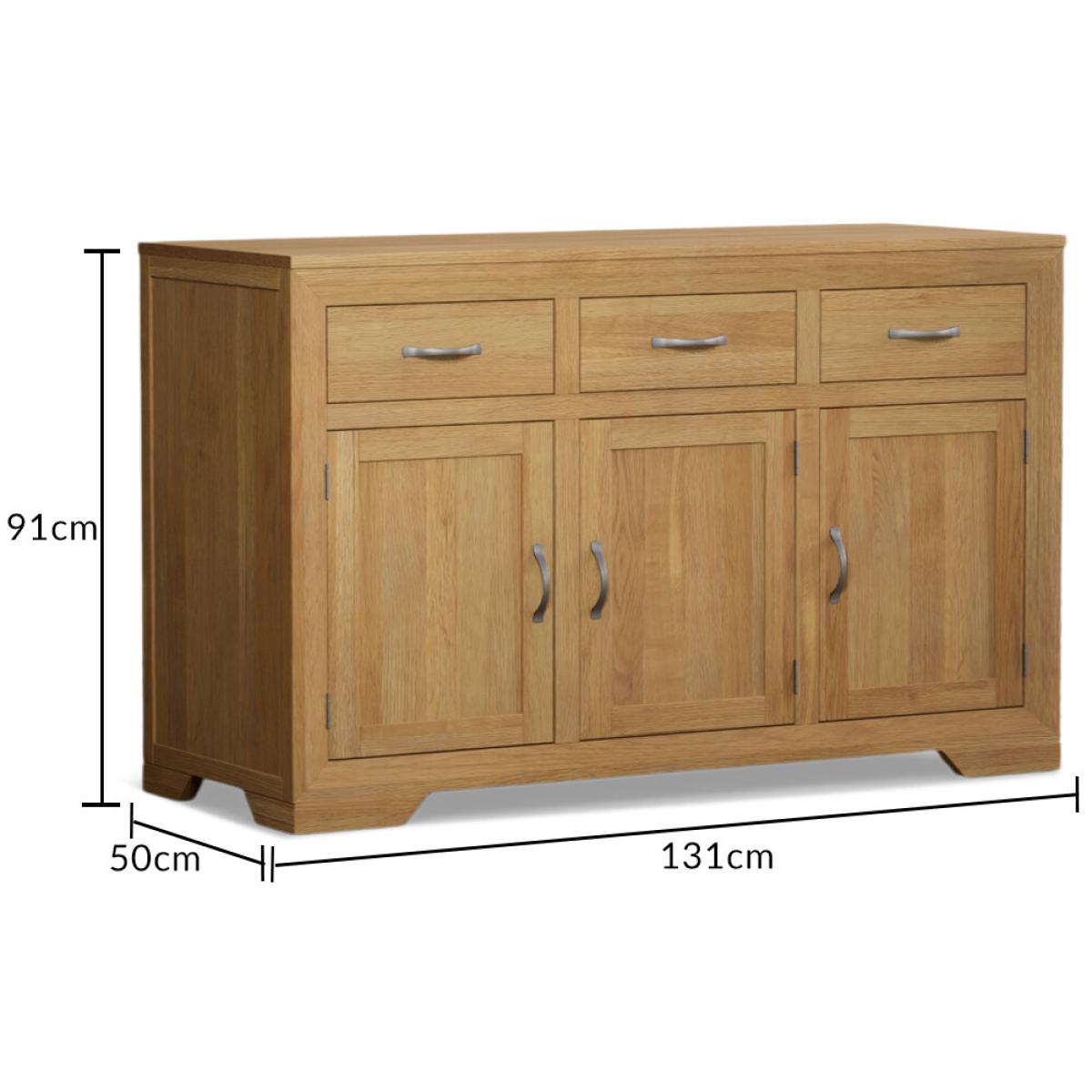 The Mitre Solid Oak Large Sideboard is crafted from solid oak with a natural finish, with two adjustable shelves and three dovetail drawers, with metal handles.