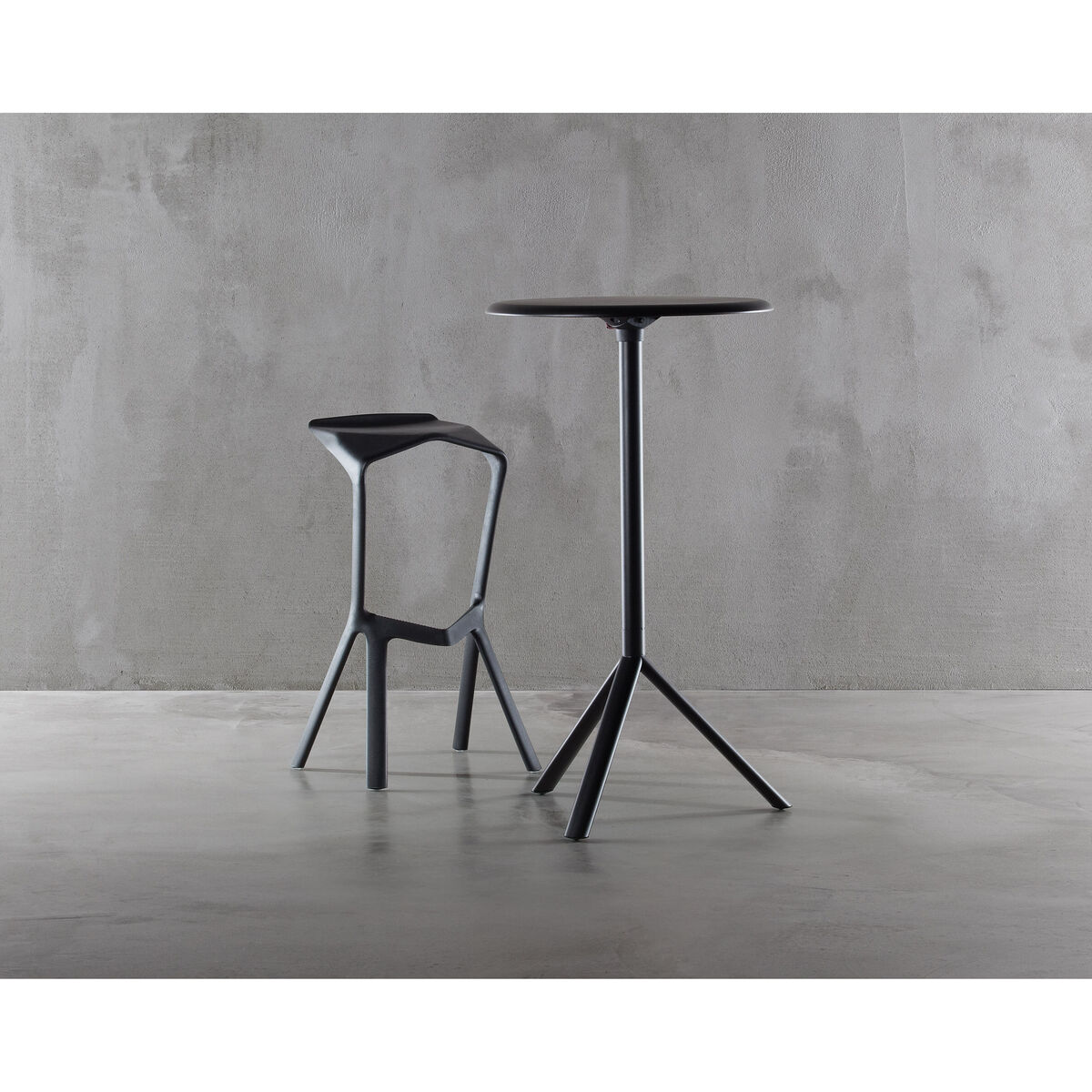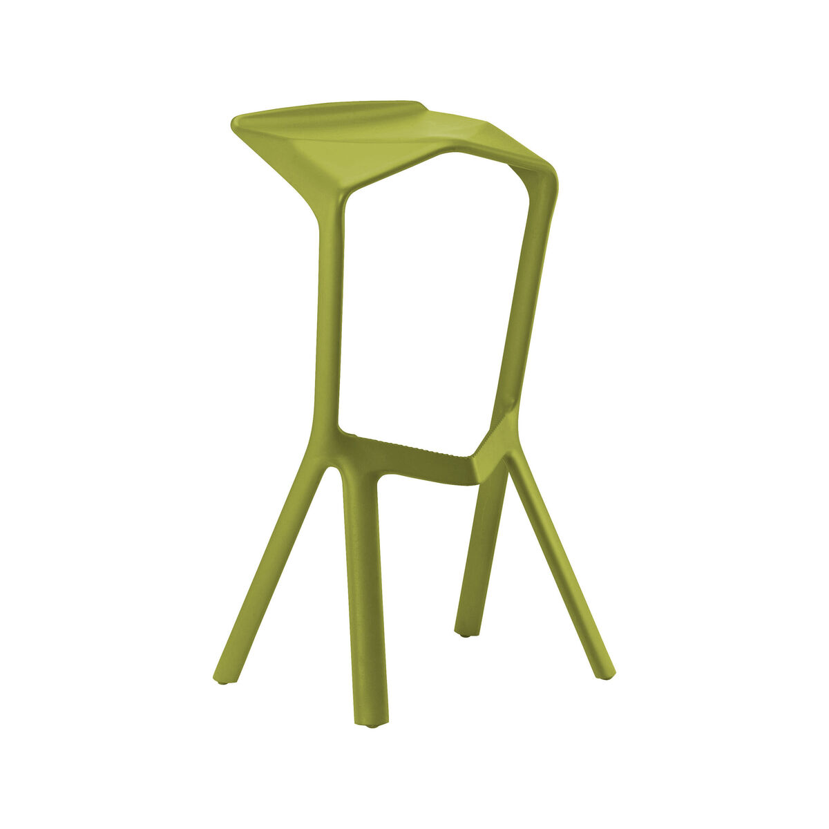 The Miura stool features a faceted seat that maintains a pleasing visual connection to the raked vertical supports. It exemplifies Grcic's approach: its angular structure makes it extremely stable but, because it is made from a single piece of fibreglass-reinforced polypropylene, it flexes comfortably. Miura's materials and shape are heavily informed by the modern industrial production process. Miura is made of reinforced polypropylene (2,5 times stronger than aluminium) produced (injected) in one block. The innovative injecting technology as well as the requirement to develop a barstool for contract and domestic environments, has lead to the characteristic form of Miura. Optically this stackable stool has a truly dynamic form, of which construction and ergonomics are developing into a powerful and expressive harmony.