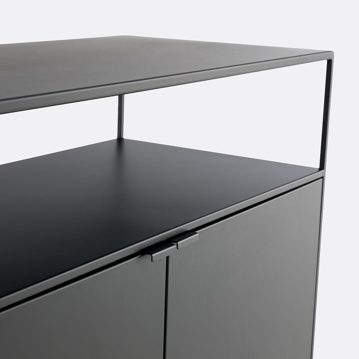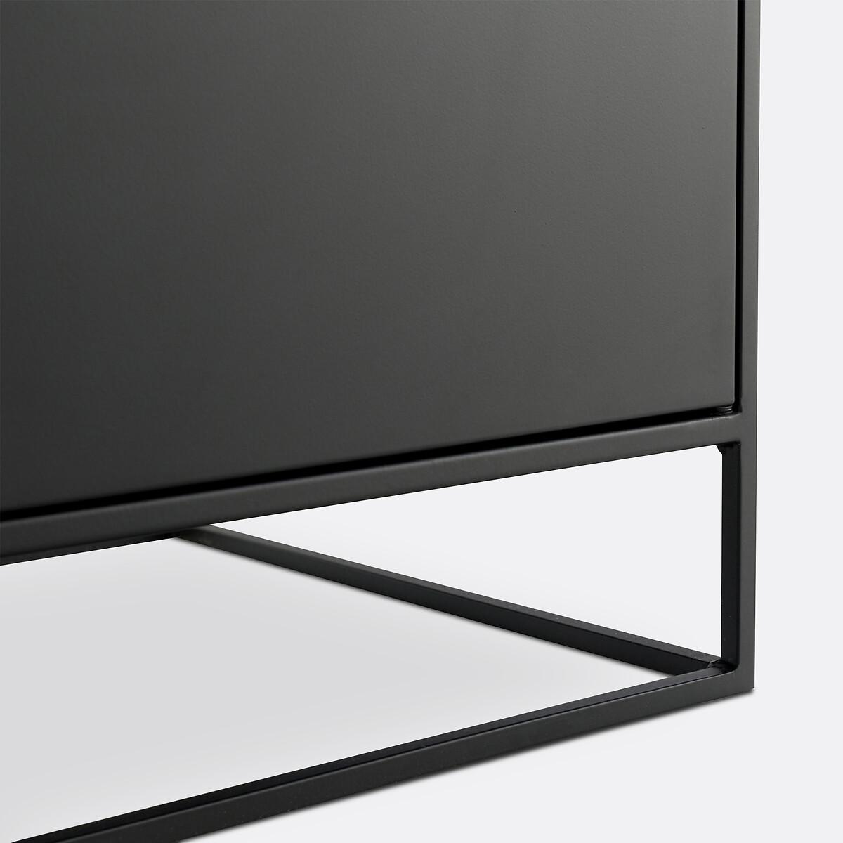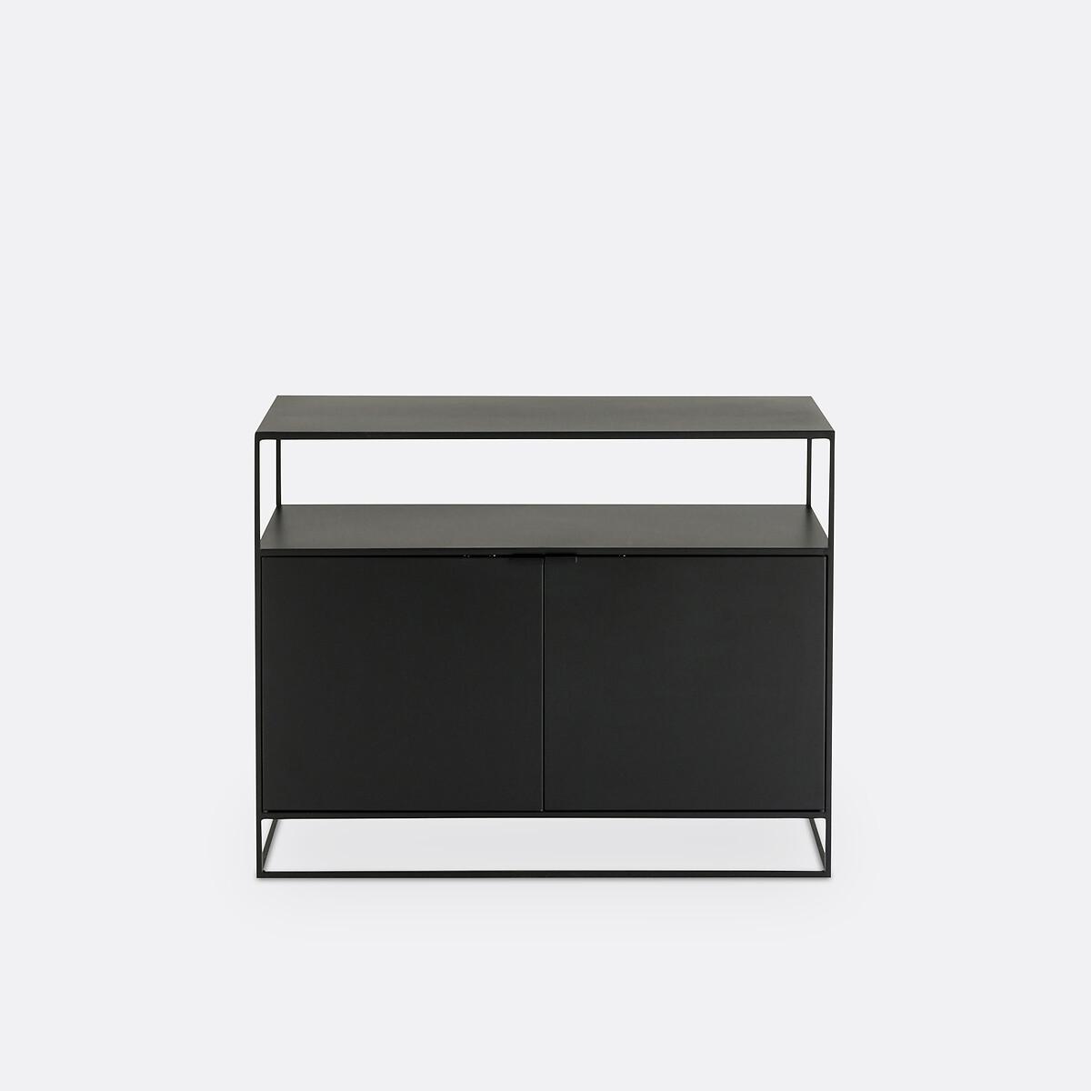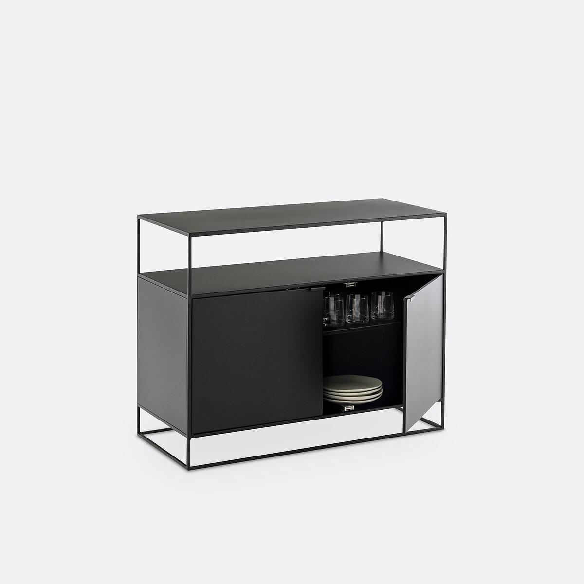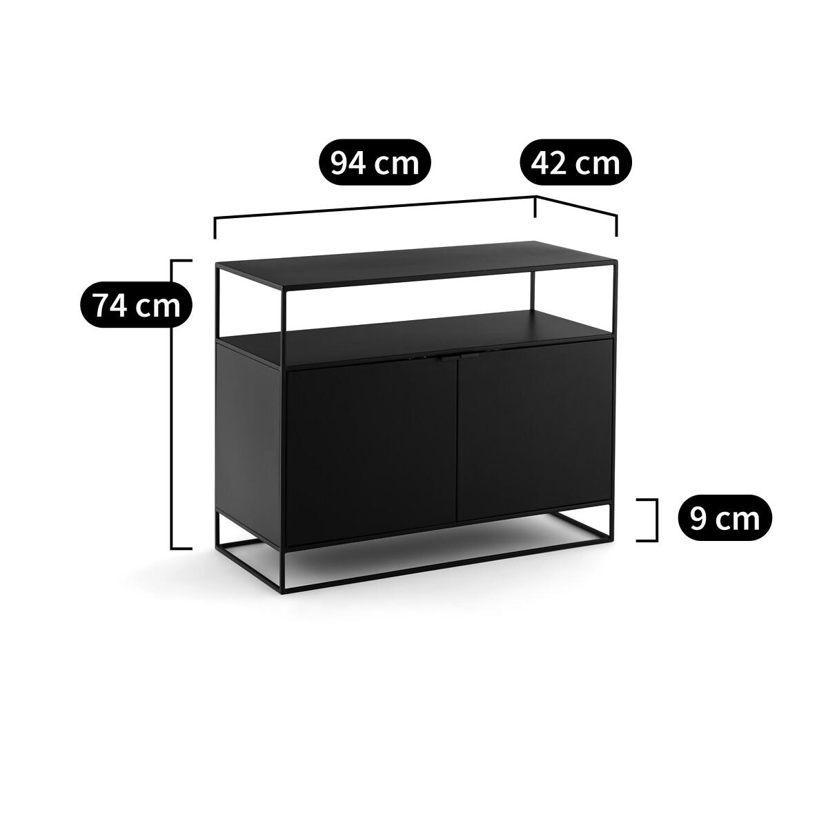 The industrial spirit reinterpreted. Its metal structure mounted on an aerial and graphic base transforms this storage sideboard into a real decorative and sculptural object.. Designed by La Redoute Intérieurs. Product Details • Steel tube and steel sheet structure, black paint, epoxy finish. • 1 open compartment • 2 doors, 1 vertical divider • 2 removable and height adjustable shelves • 4 compartments behind the doorsDimensions. Overall • Length: 94cm • Height: 74cm • Depth: 42cm. Usable space • Open compartment : L92 x H17.8 x D40cm • Compartments behind the doors (excluding shelves): L46.4/47.3 x H42 x D40cm • Height of legs : 9cm/3.5" • Sold pre-assembled. Dimensions and weight of parcel1 parcel • L100 x H80 x D47.5cm. 37kg